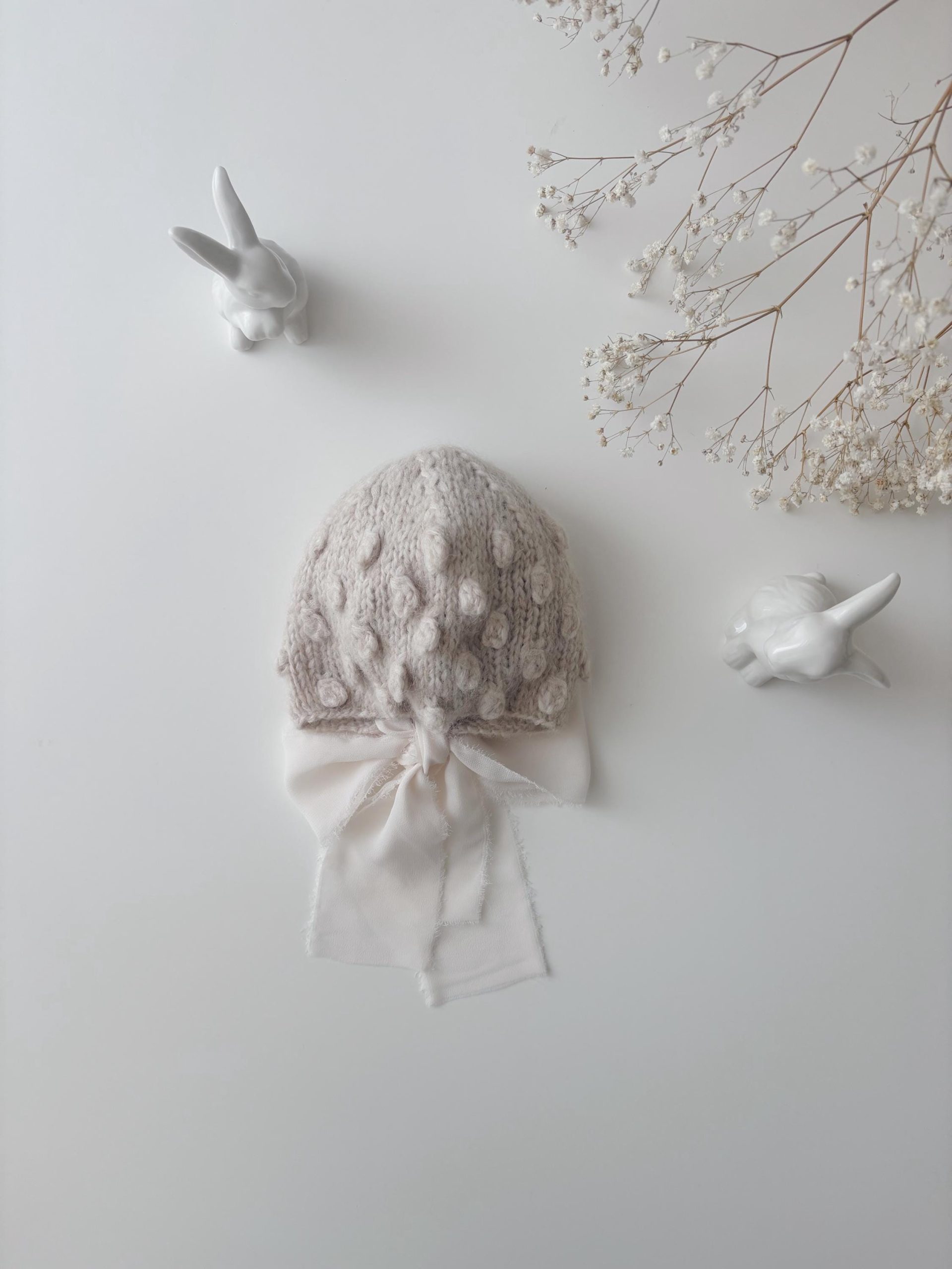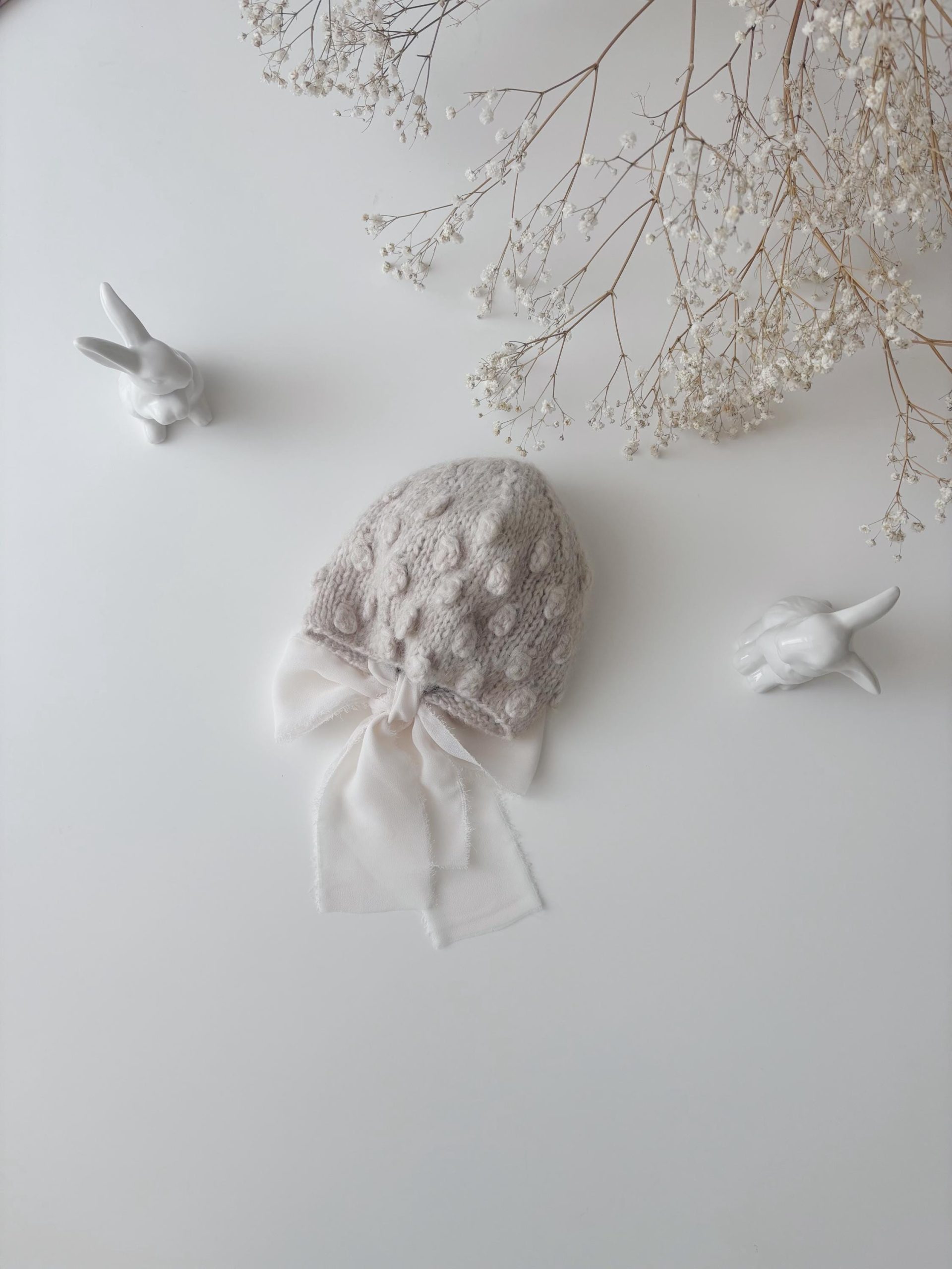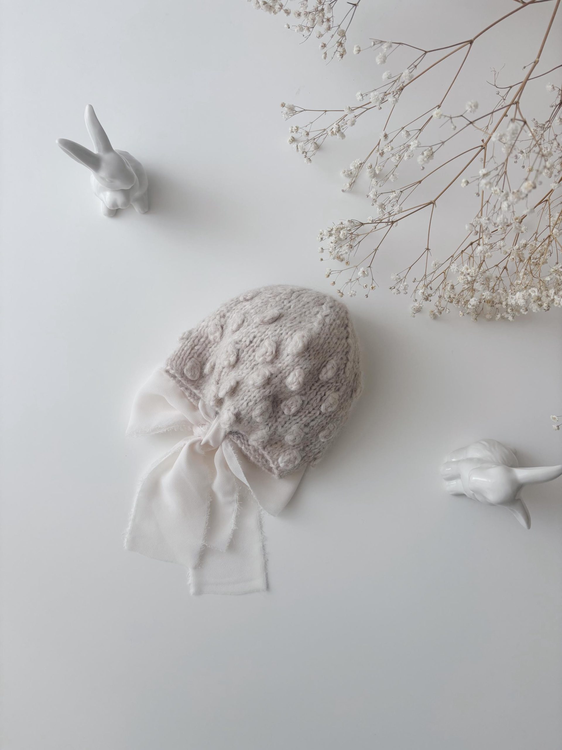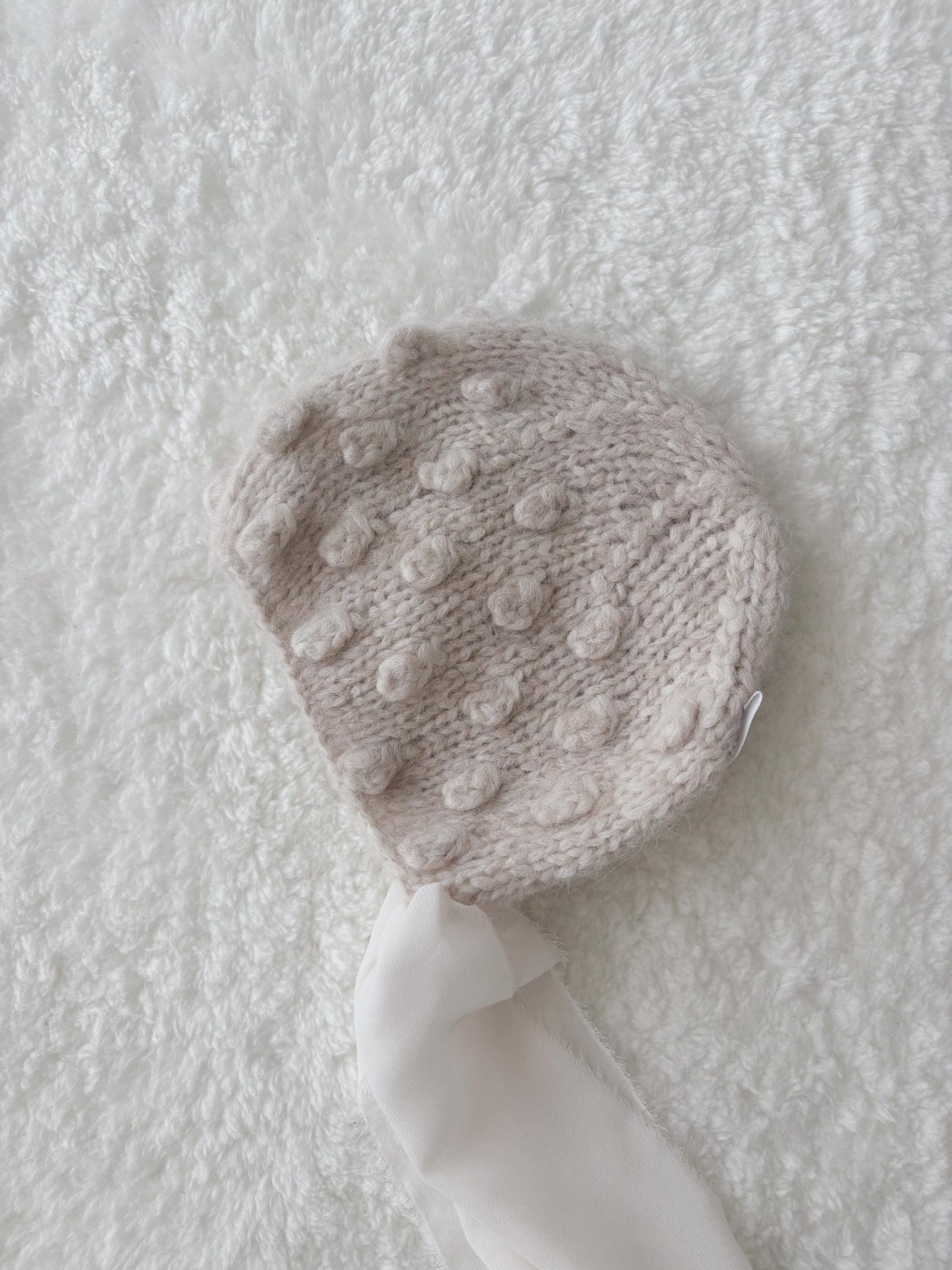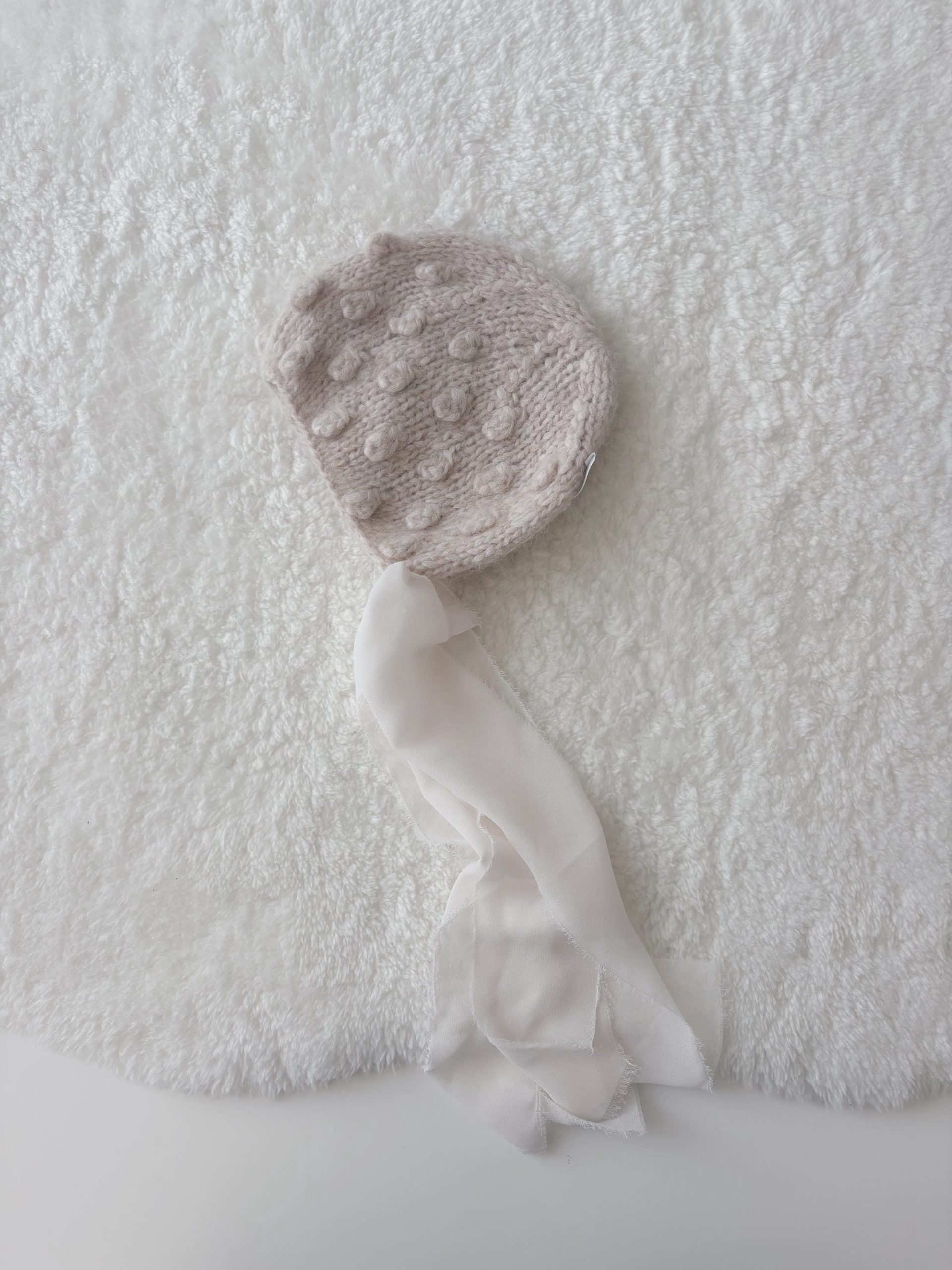 Hand-Knitted Baby Alpaca Bonnet – Light Brown Popcorn Knit, Photo Prop