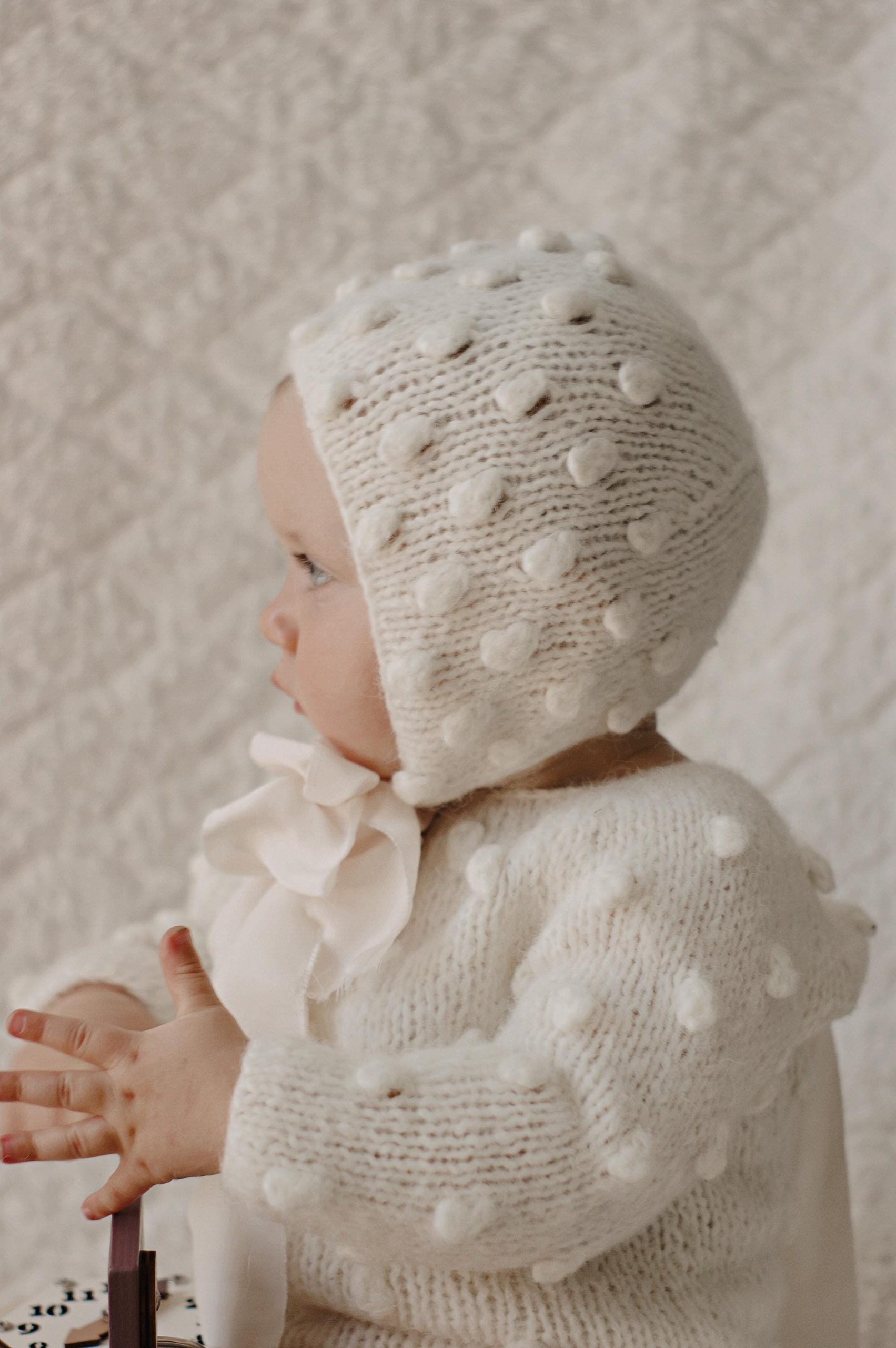 Hand Knitted Baby Alpaca Romper and Bonnet Set – Cream Popcorn Knit
