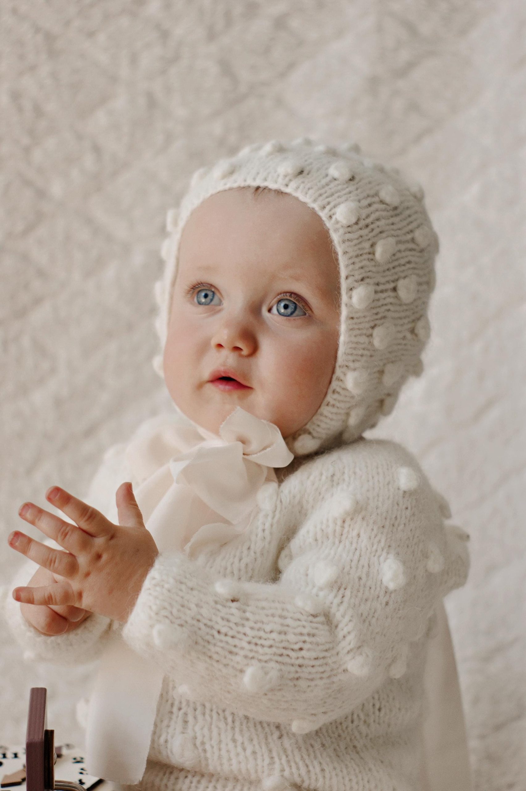 Embroidered Merino Baby Romper and Bonnet Set – Knitted Photo Prop