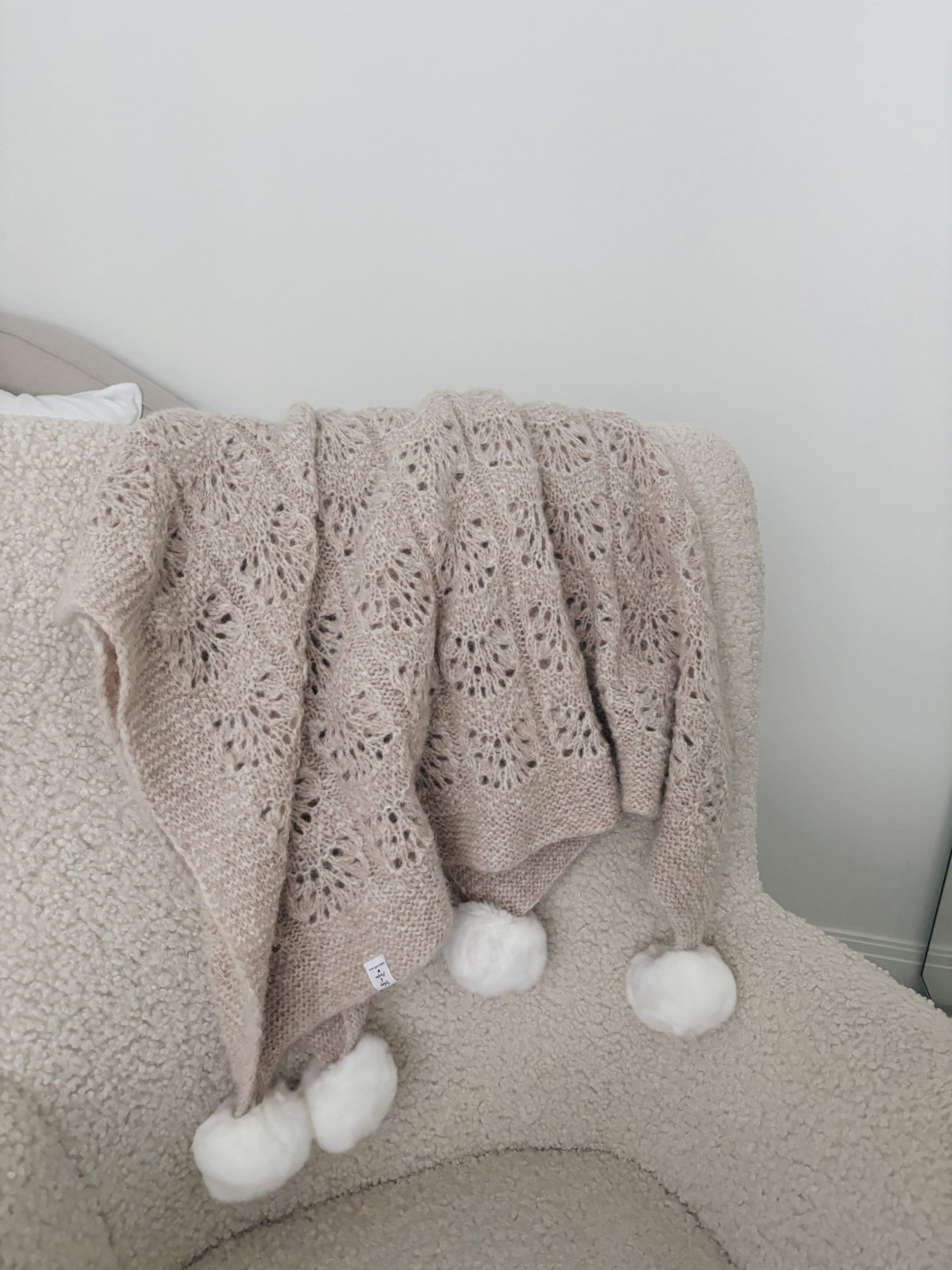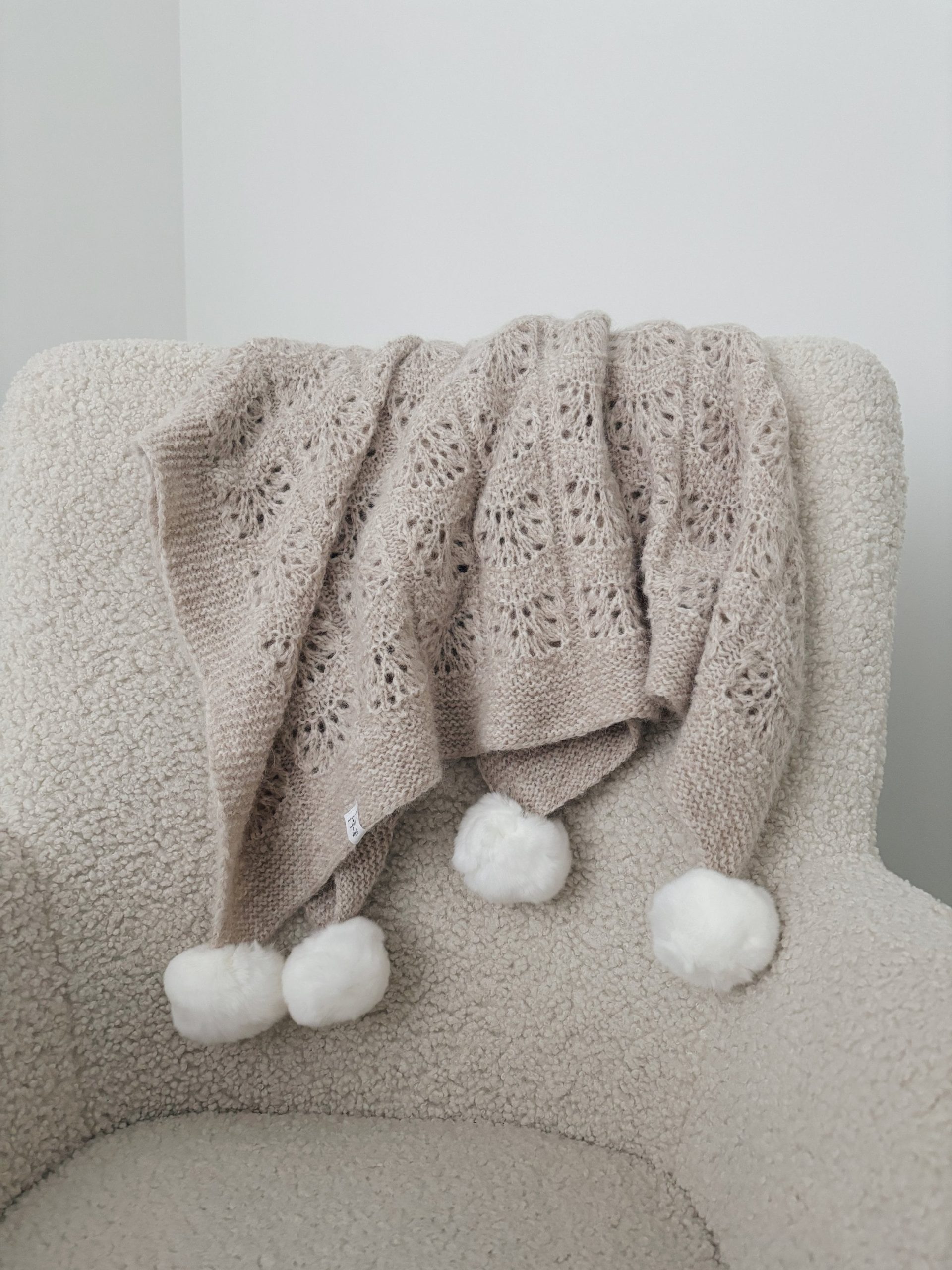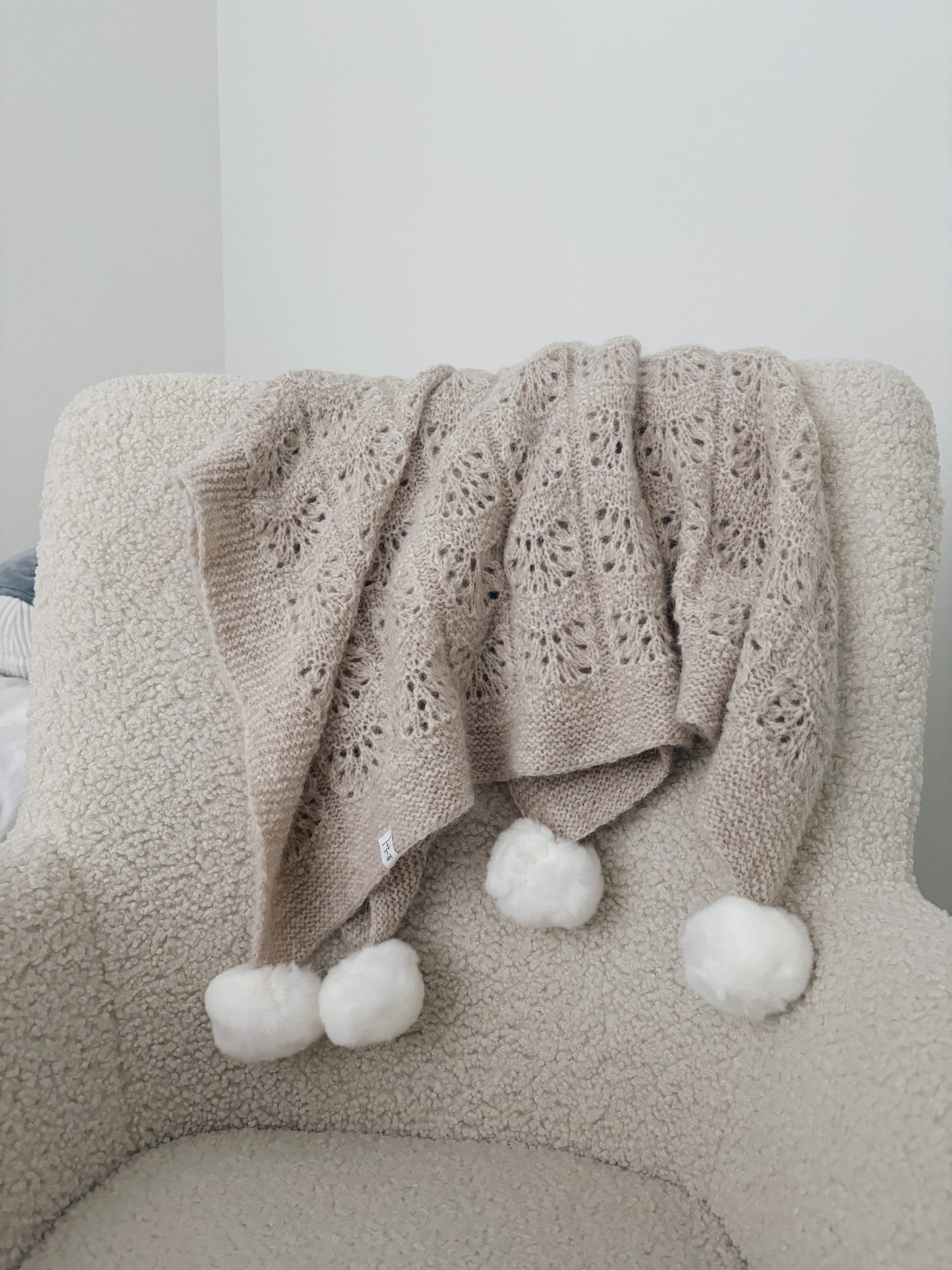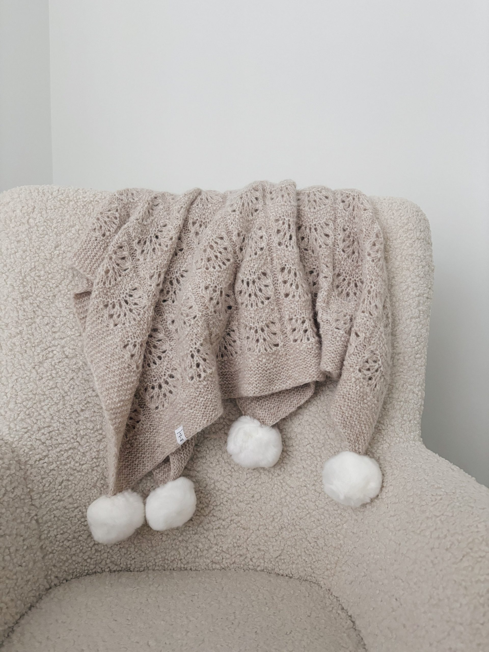Hand-Knitted Beige Alpaca Baby Blanket – Pom Pom Accent