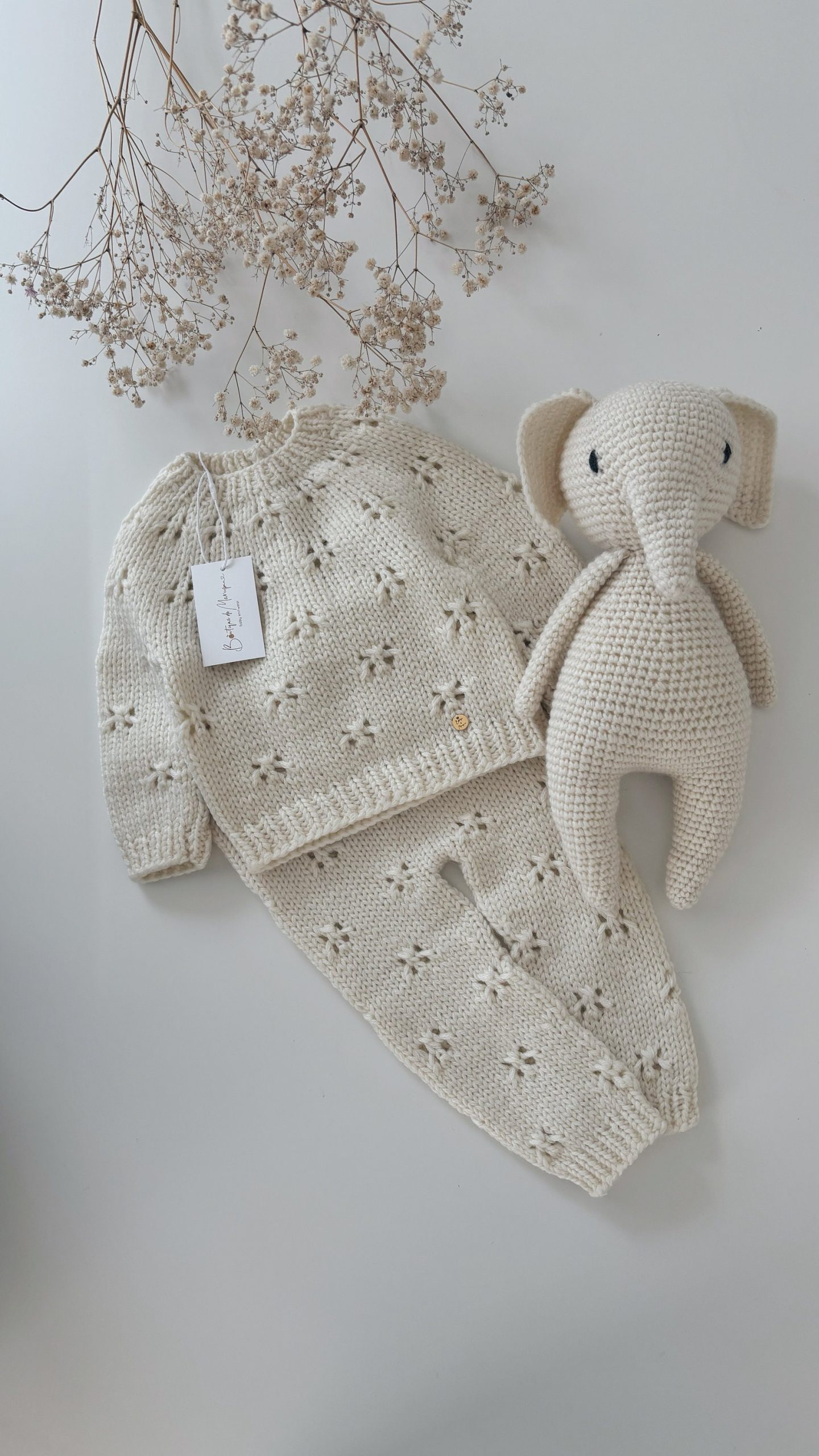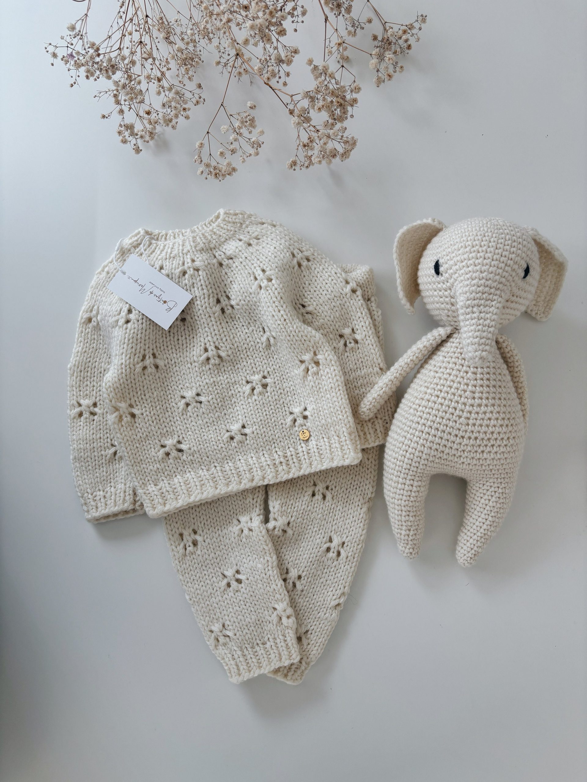 Hand Knitted Lambswool Baby Outfit – Sweater, Pants & Elephant Toy