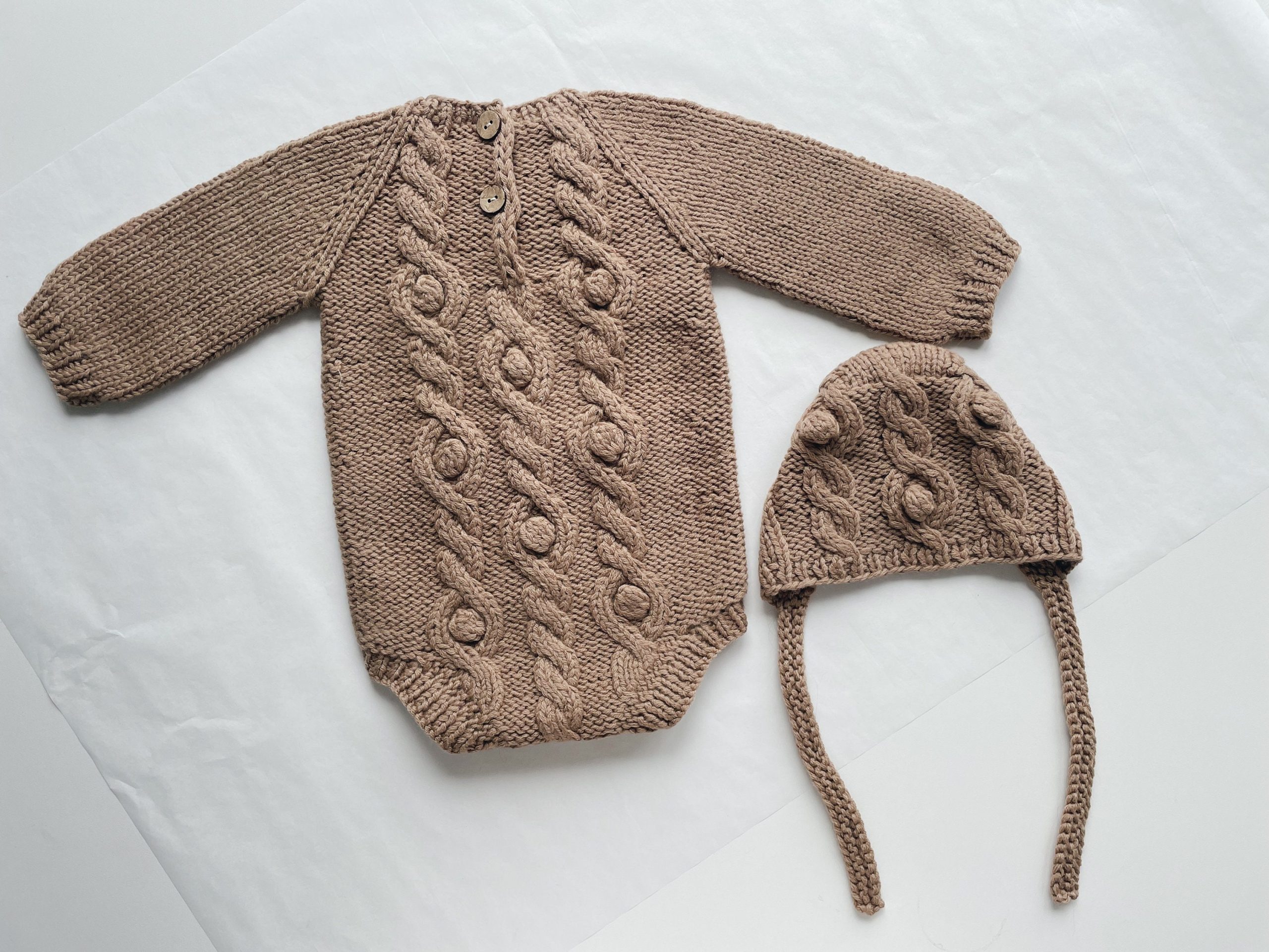 Hand Knitted Merino Baby Romper and Bonnet Set – Brown