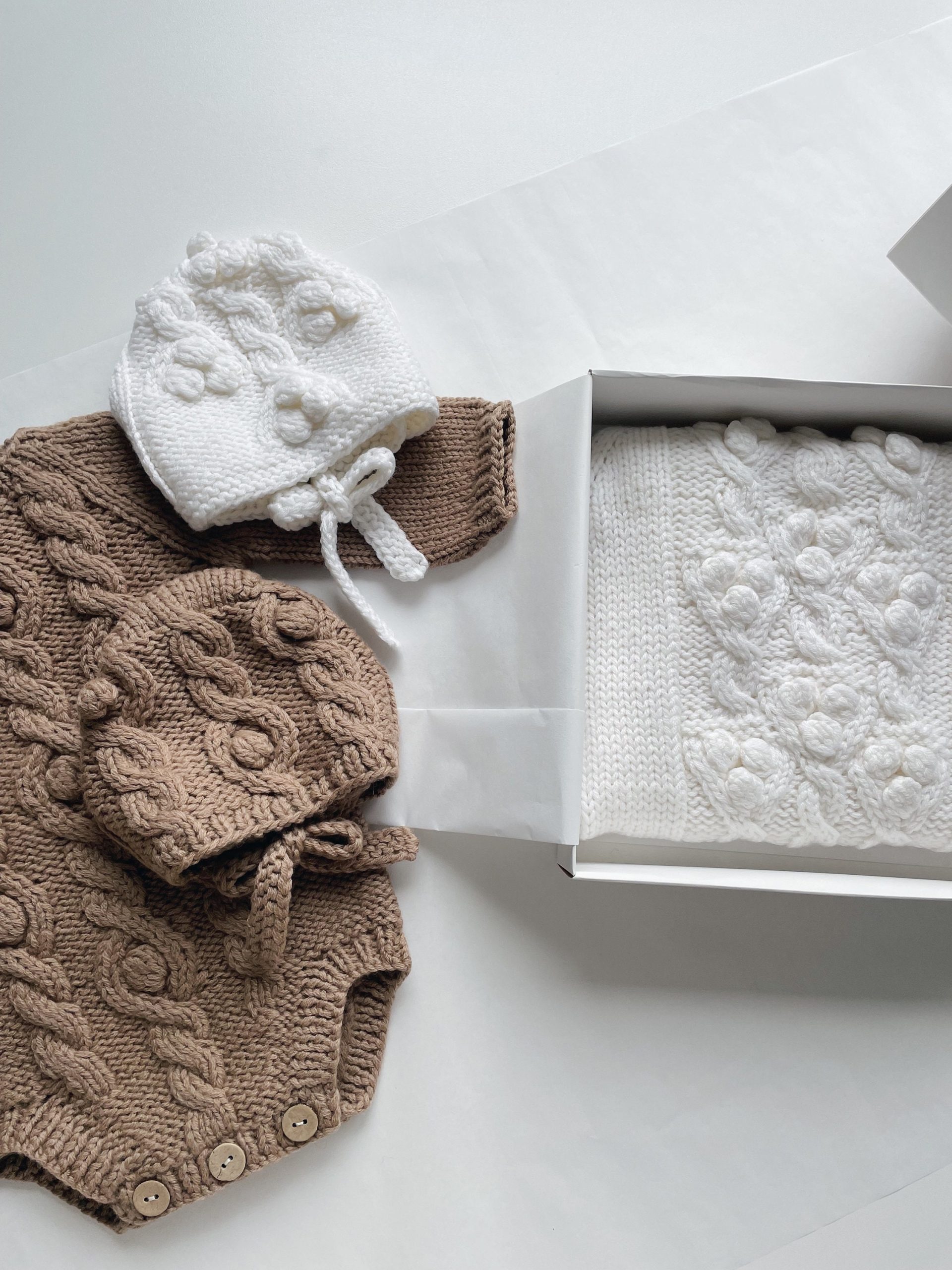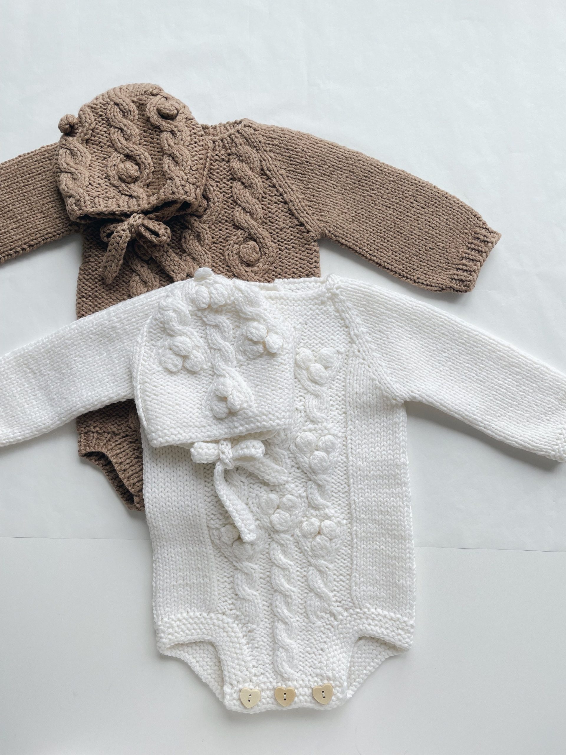 Embroidered Merino Baby Romper and Bonnet Set – Knitted Photo Prop