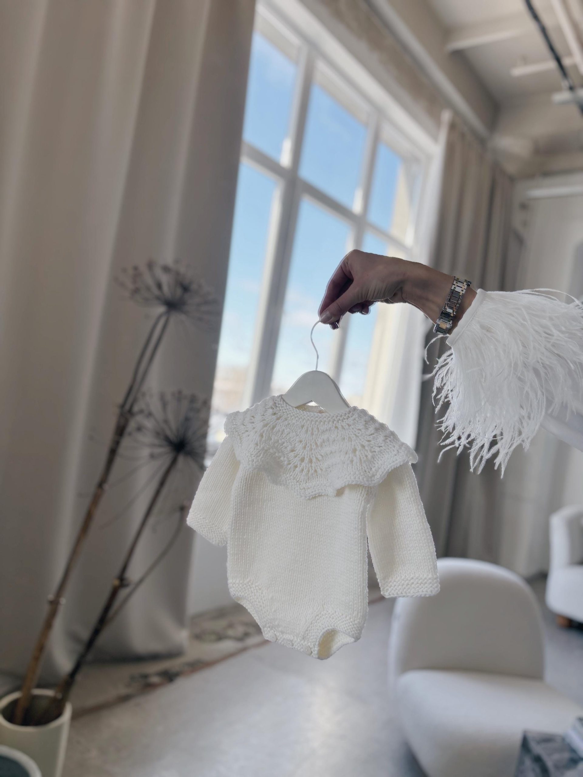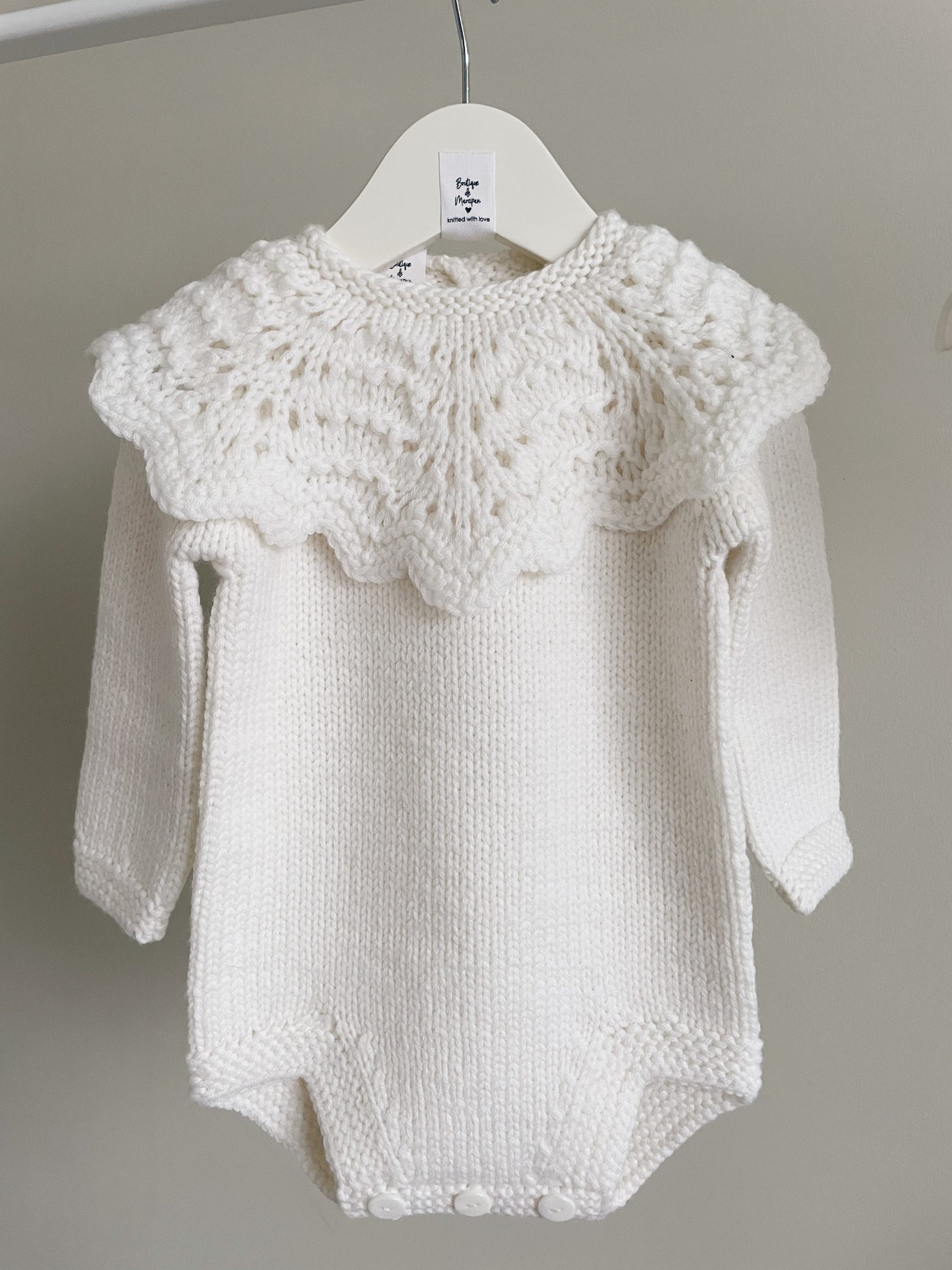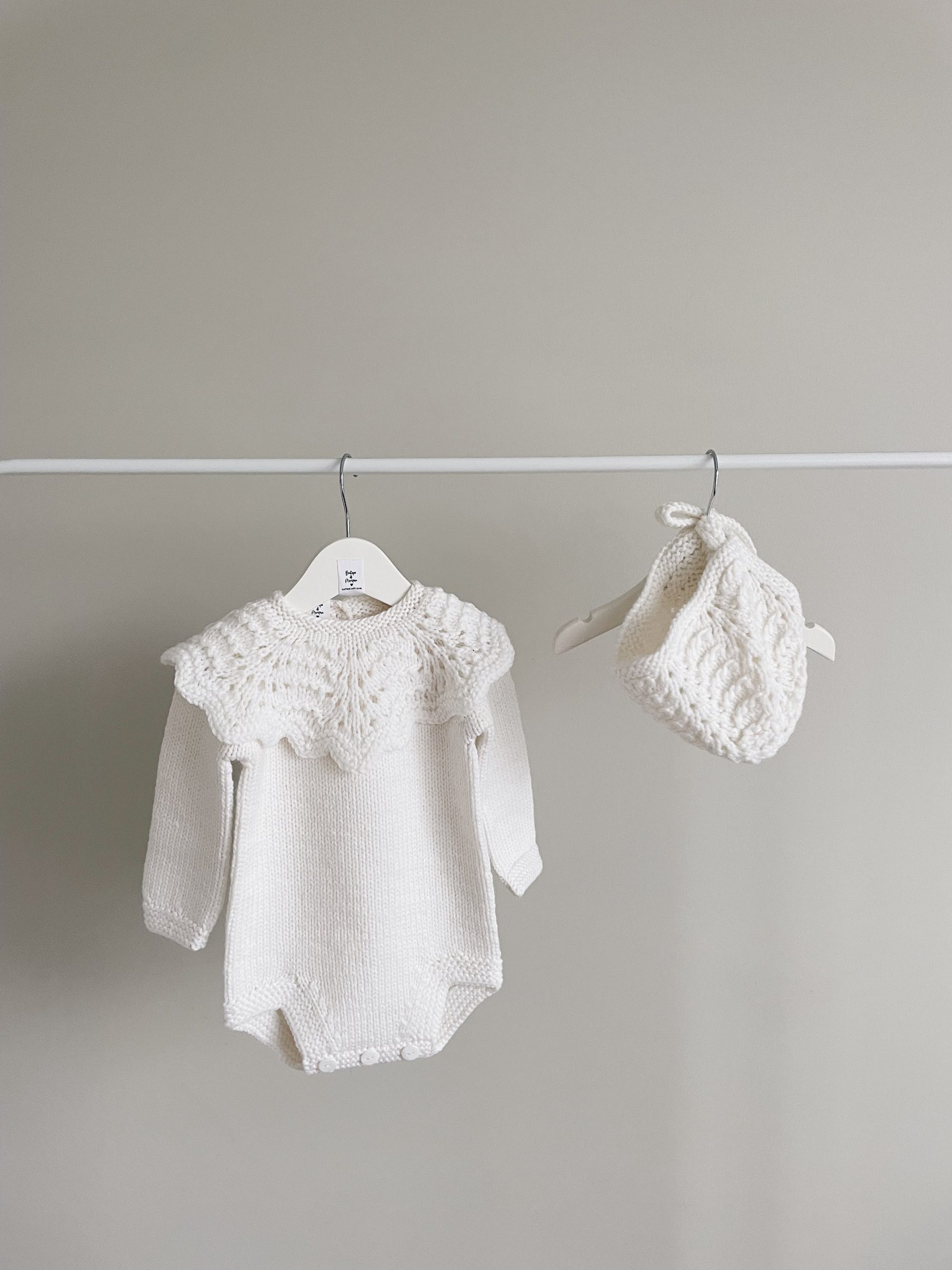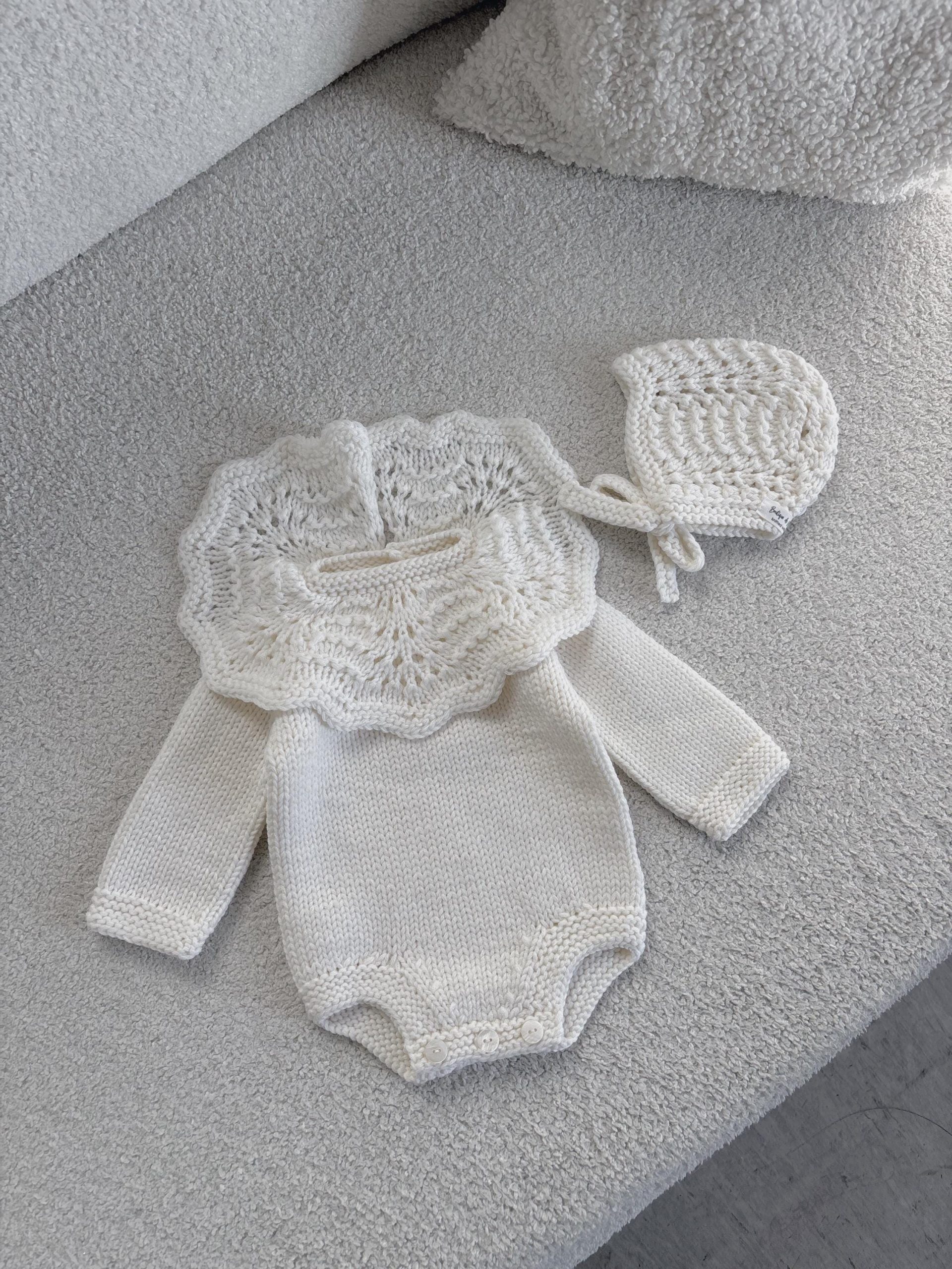 Hand Knitted Merino Baby Romper and Bonnet Set – White Photo Prop