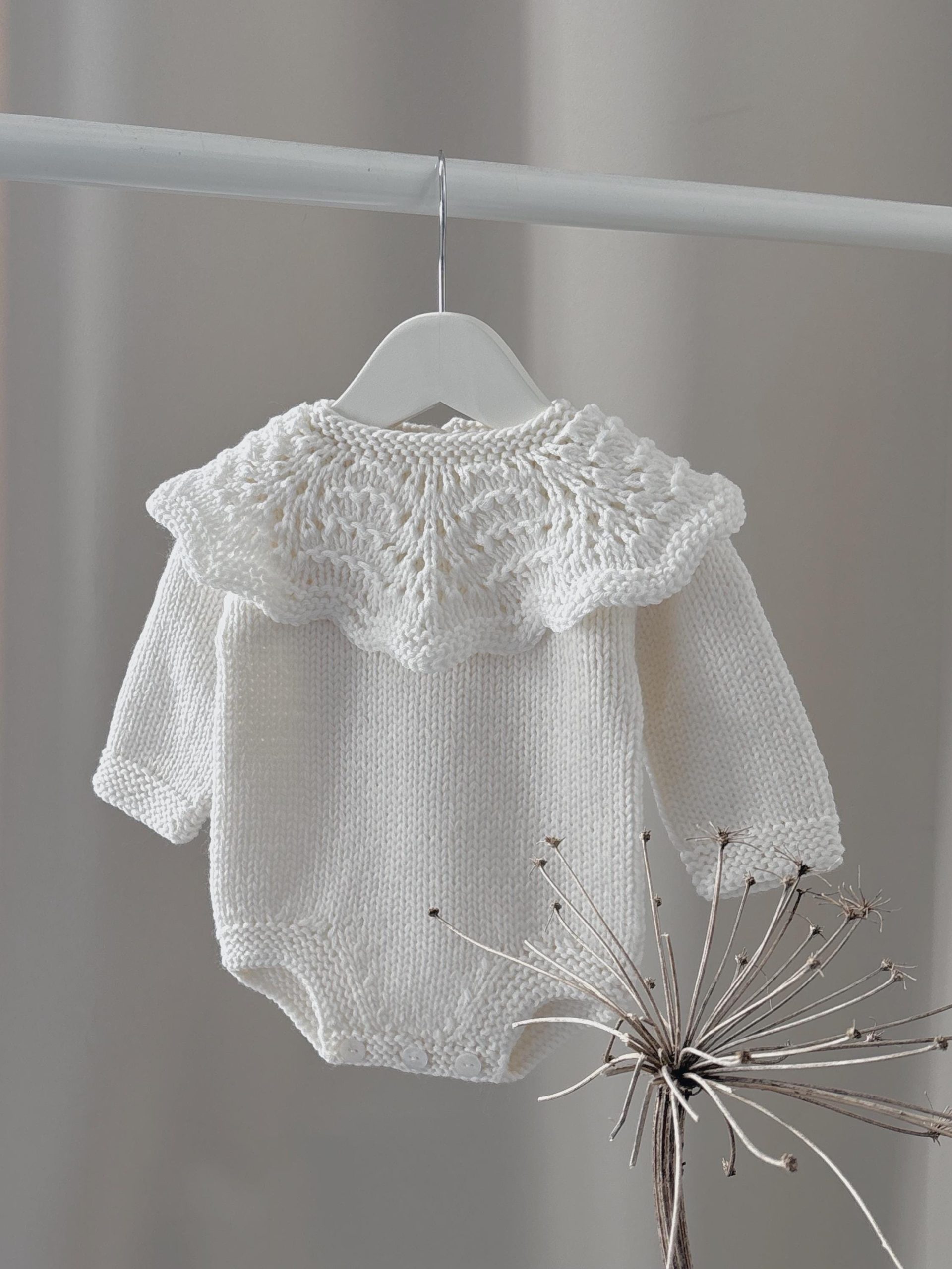 I have knitted this long sleeve romper with collar and bonnet from the wonderfully soft merino yarn.