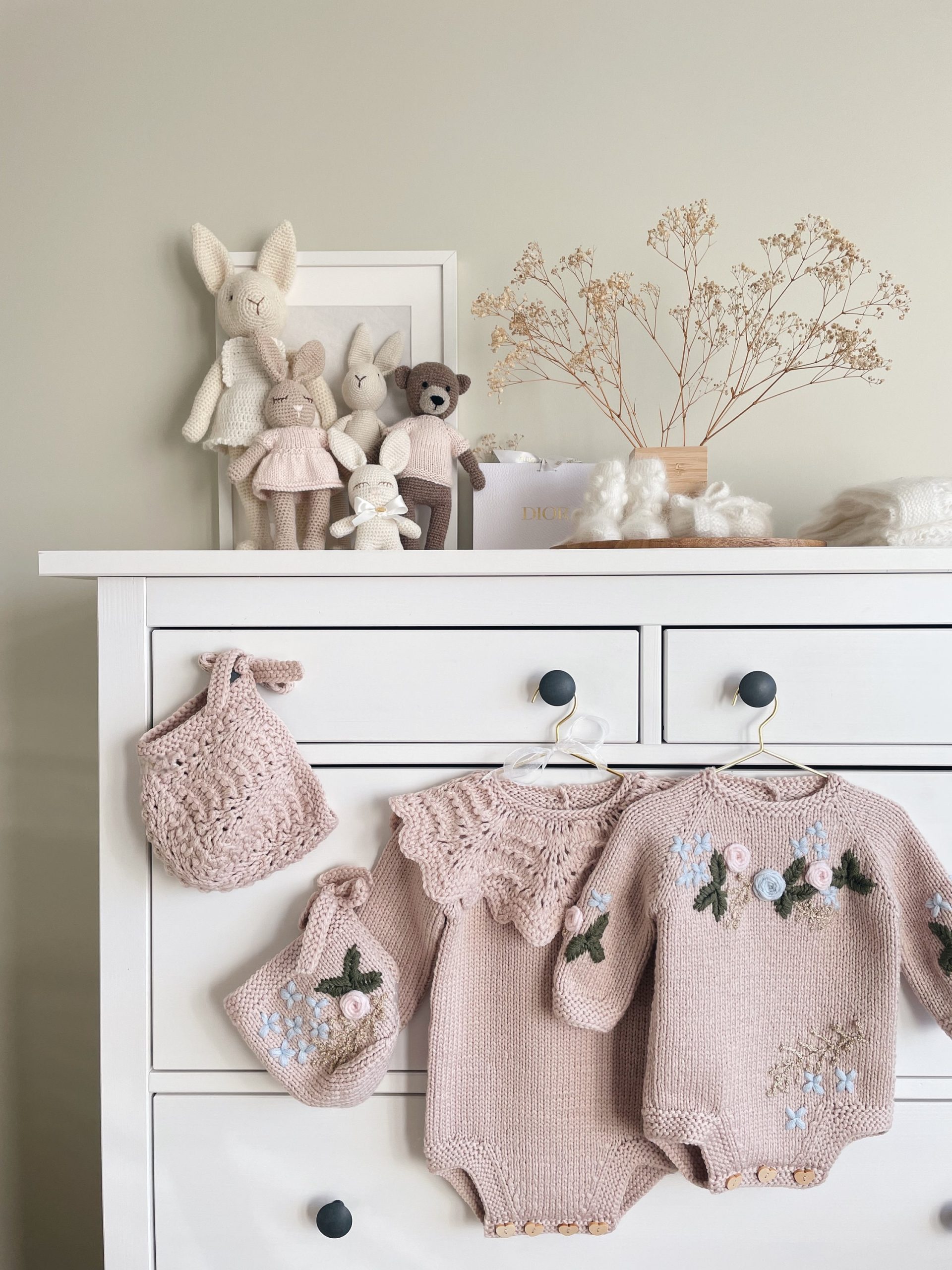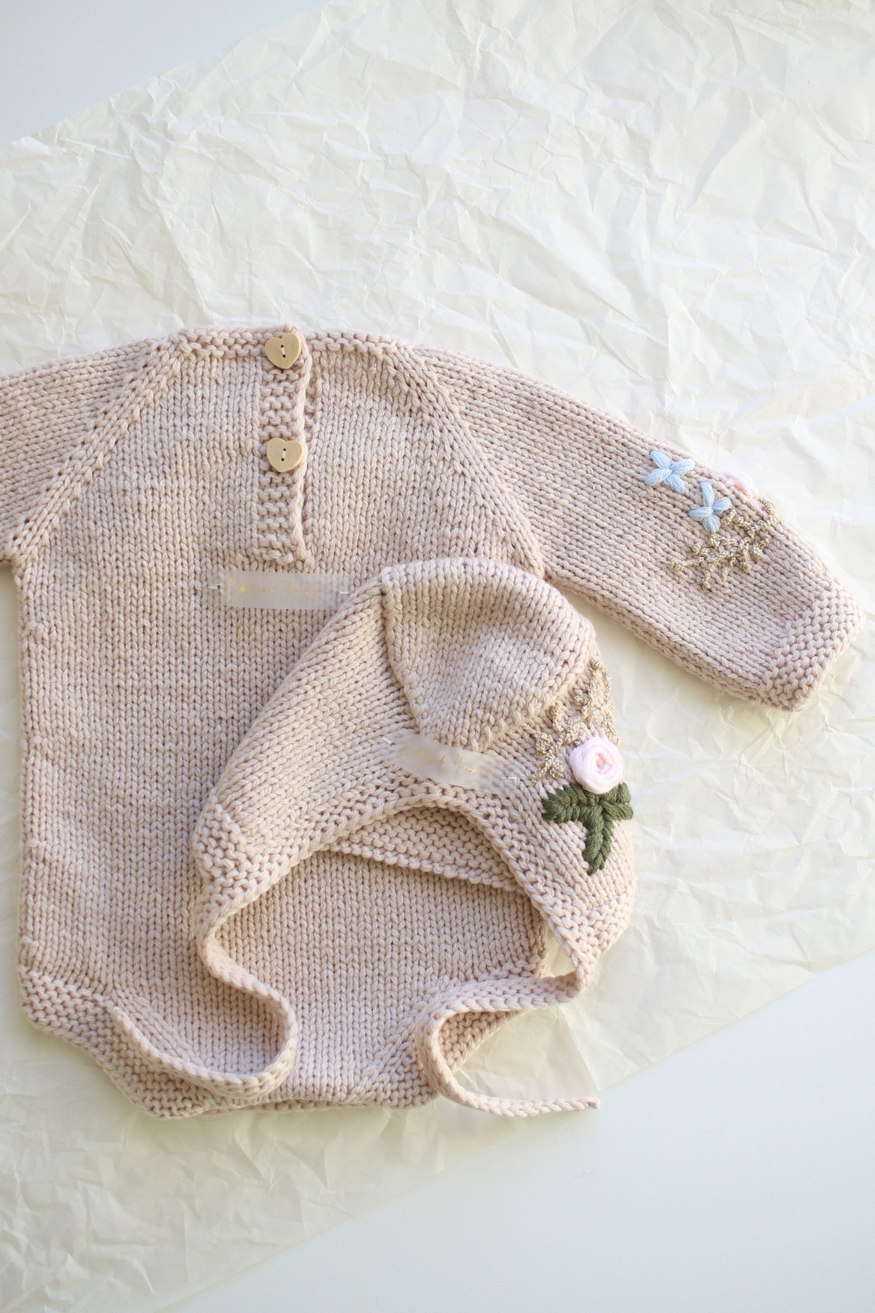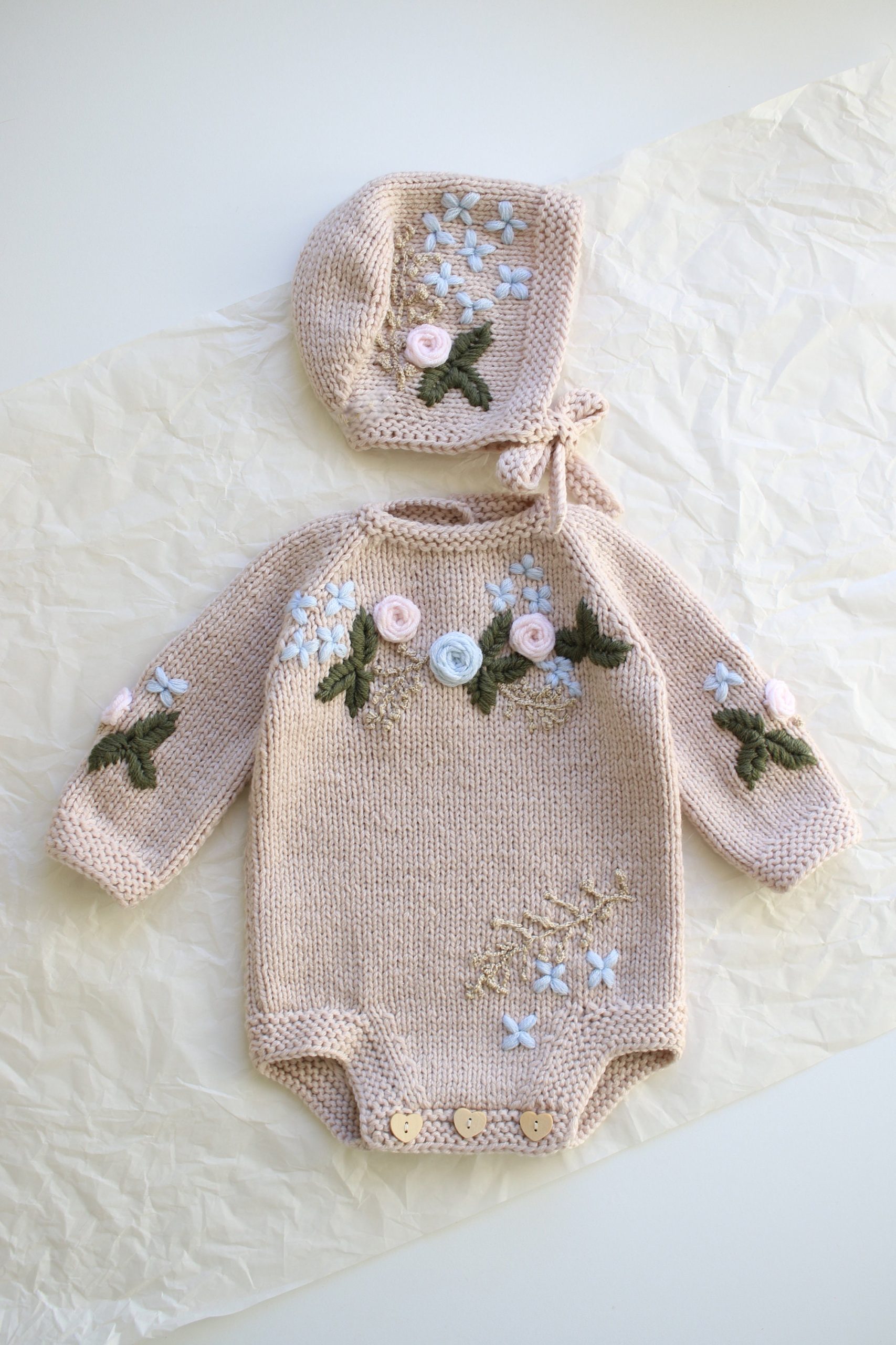 Embroidered Merino Baby Romper and Bonnet Set – Knitted Photo Prop