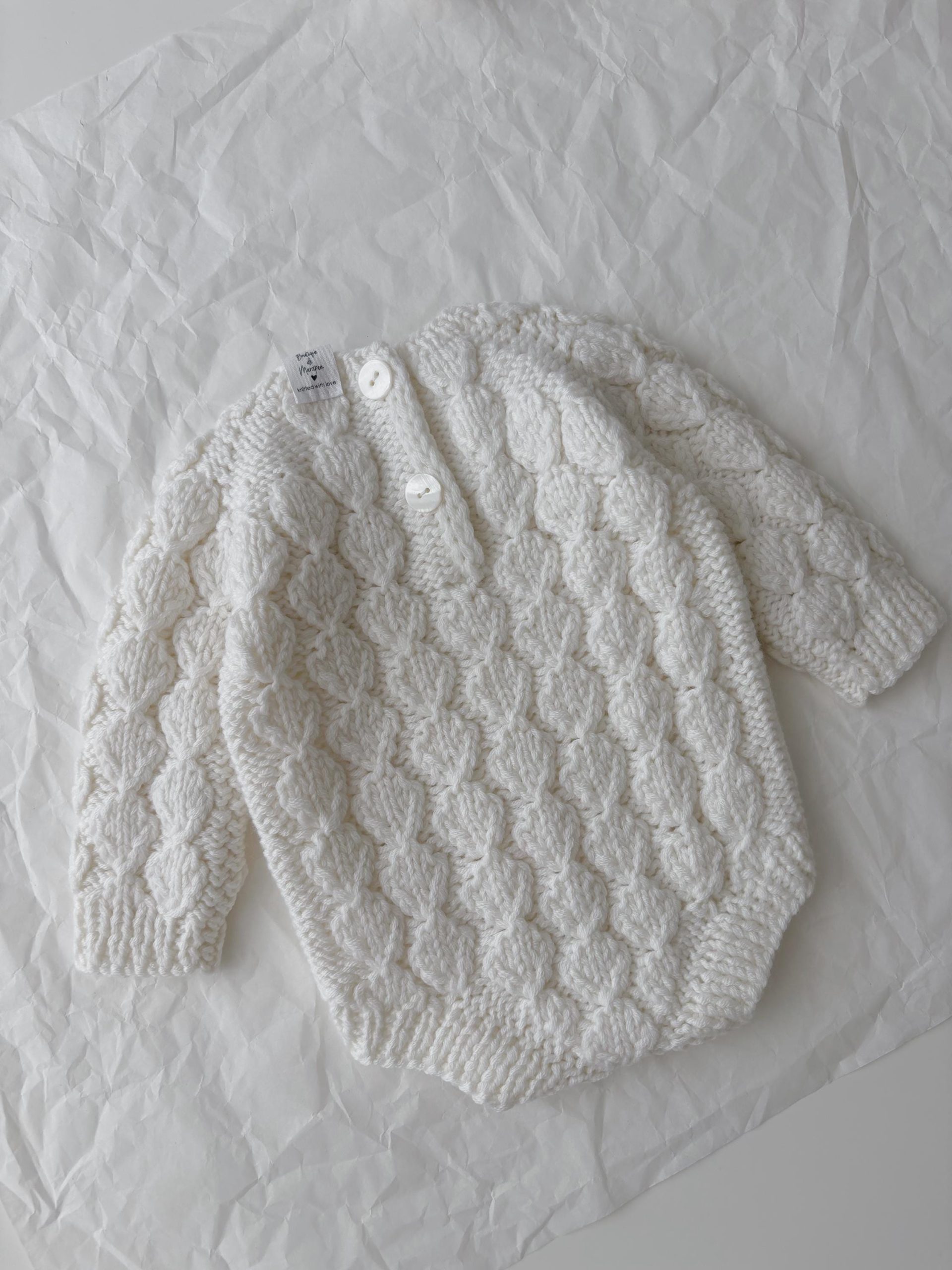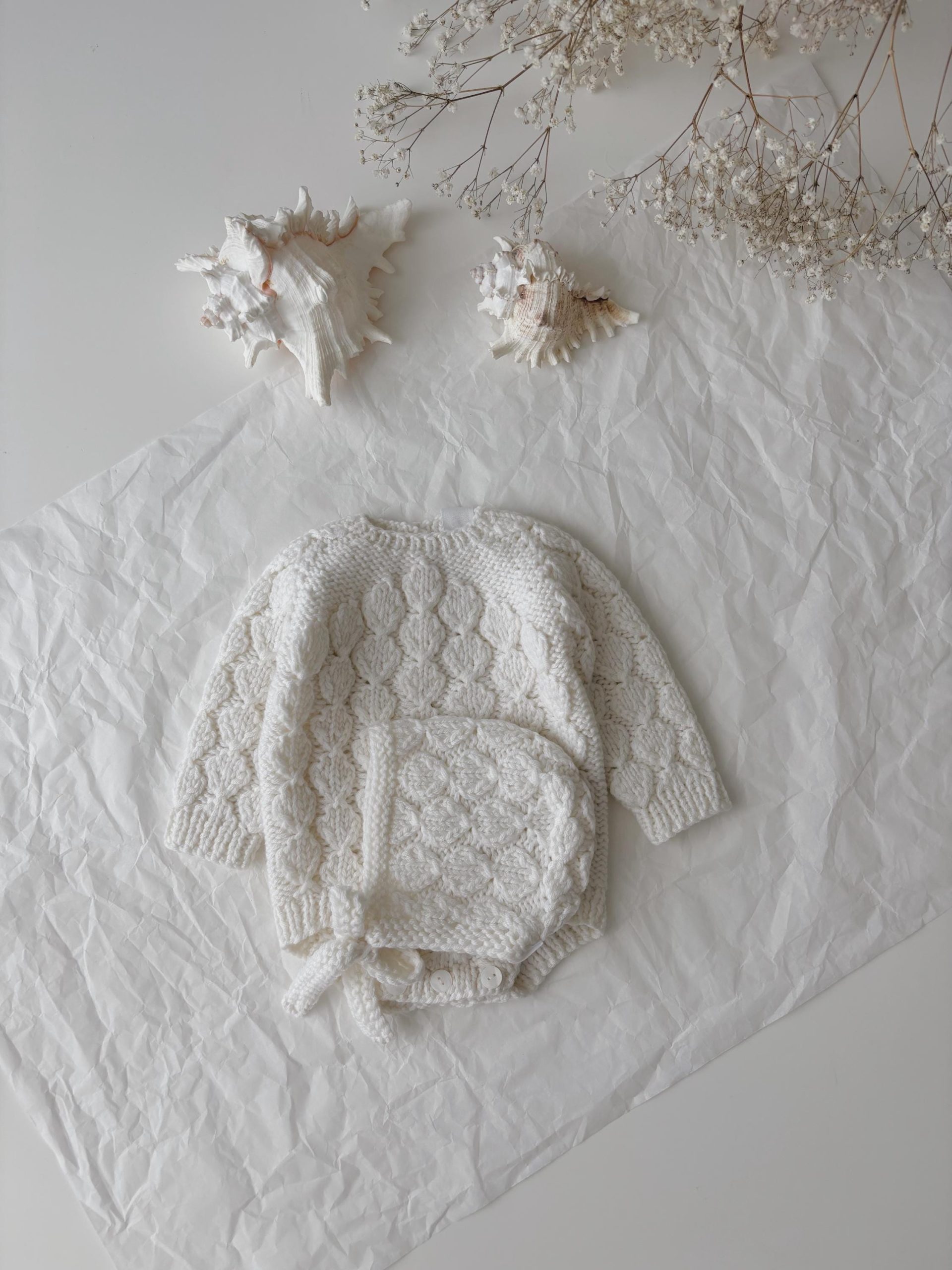 Alpaca Knit Baby Romper and Bonnet Set – Cream Outfit
