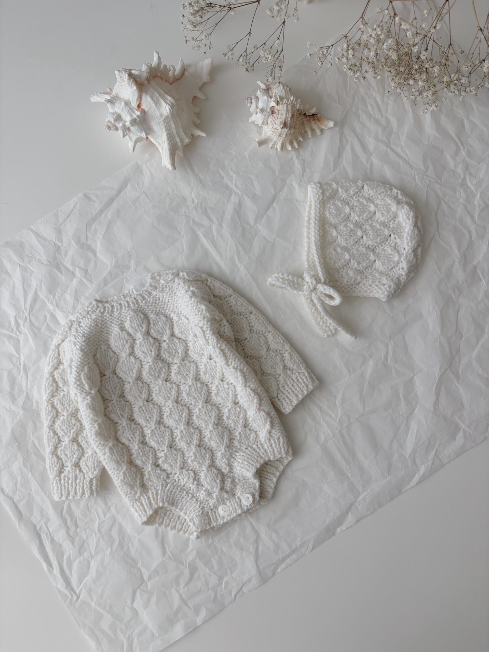 Cotton Baby Romper and Bonnet Set – Popcorn Knit Outfit