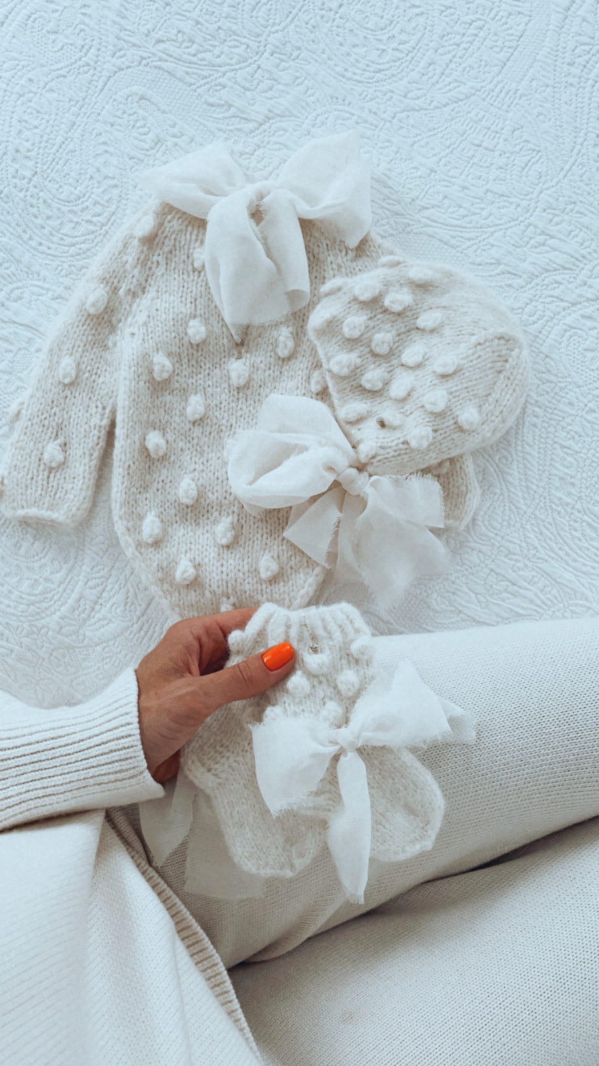 Knit Baby Romper Set – Alpaca Bonnet and Socks, Cream Photo Prop