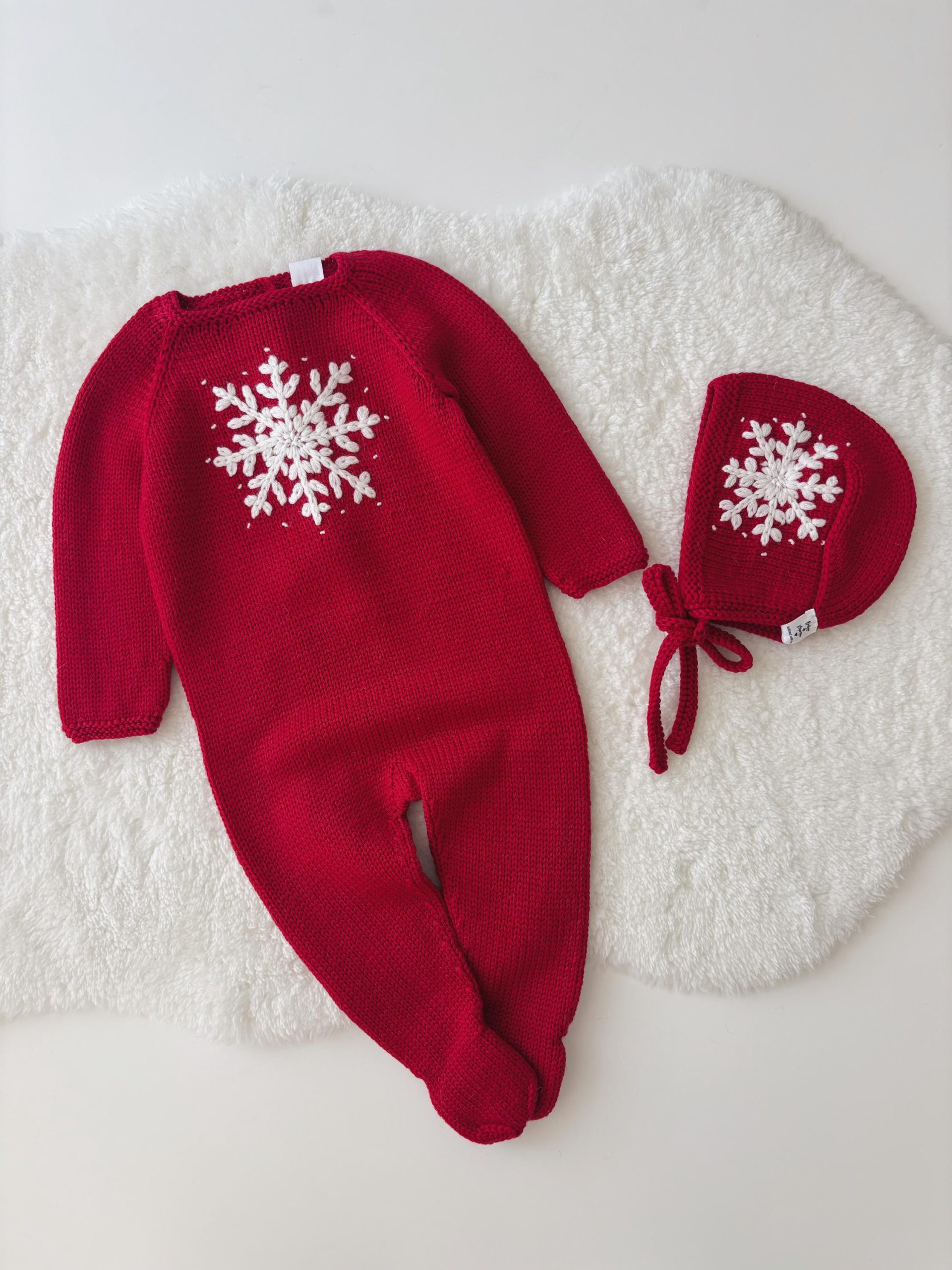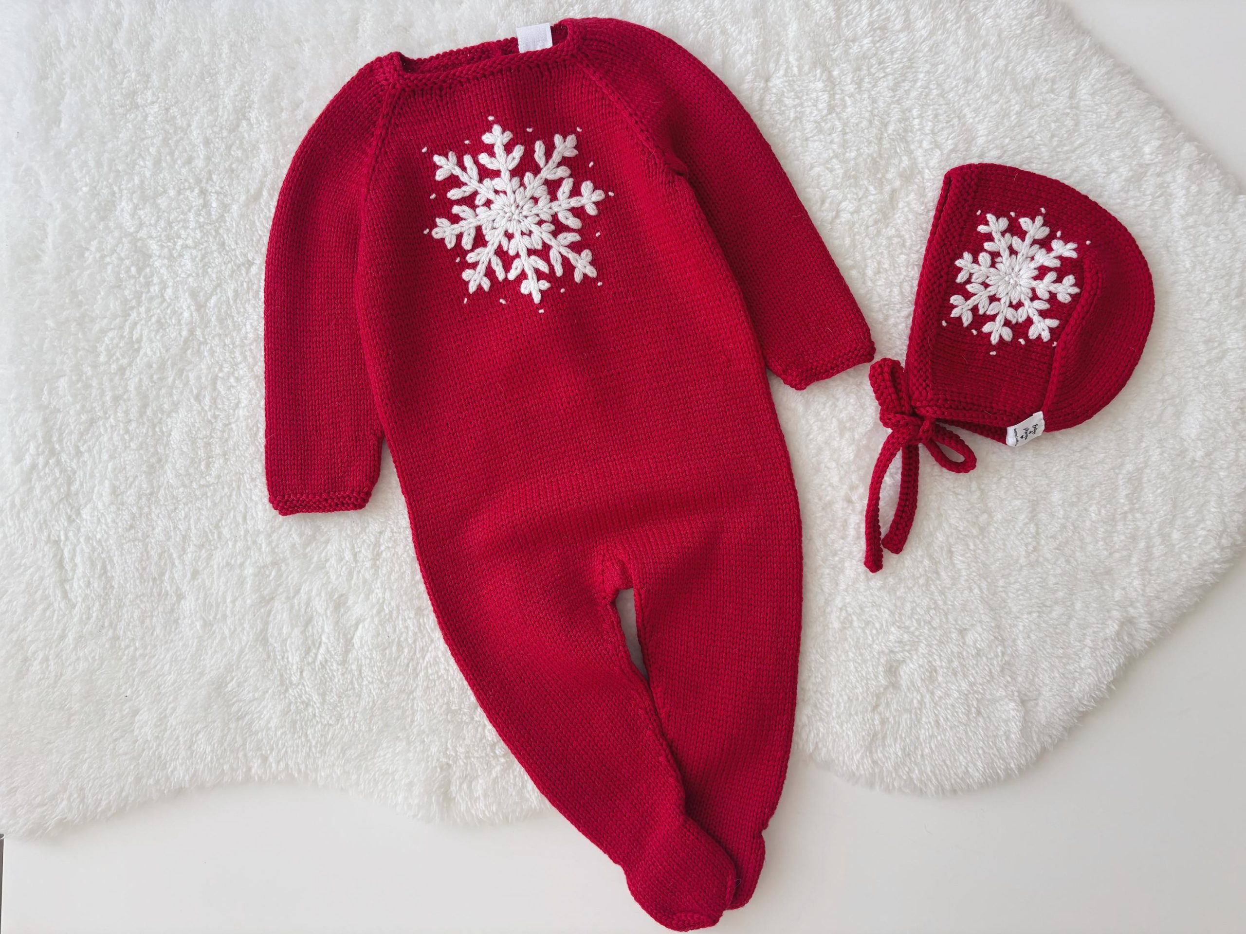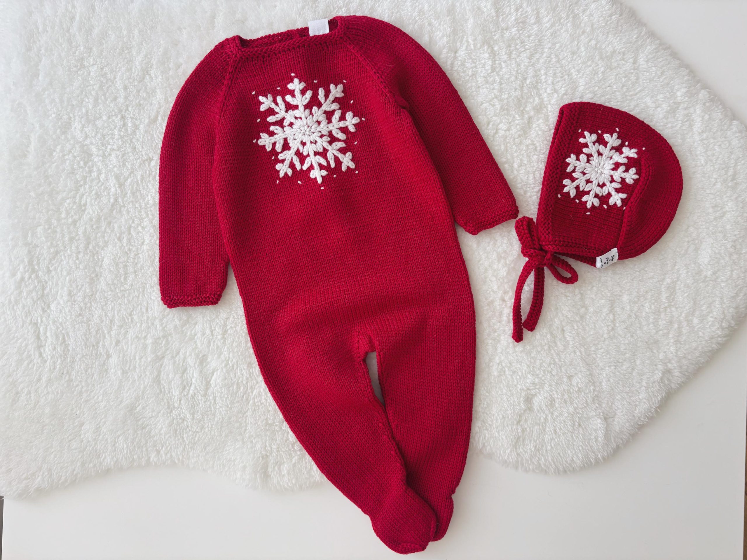 Knit Merino Baby Romper and Bonnet Set – Red Snowflake Outfit