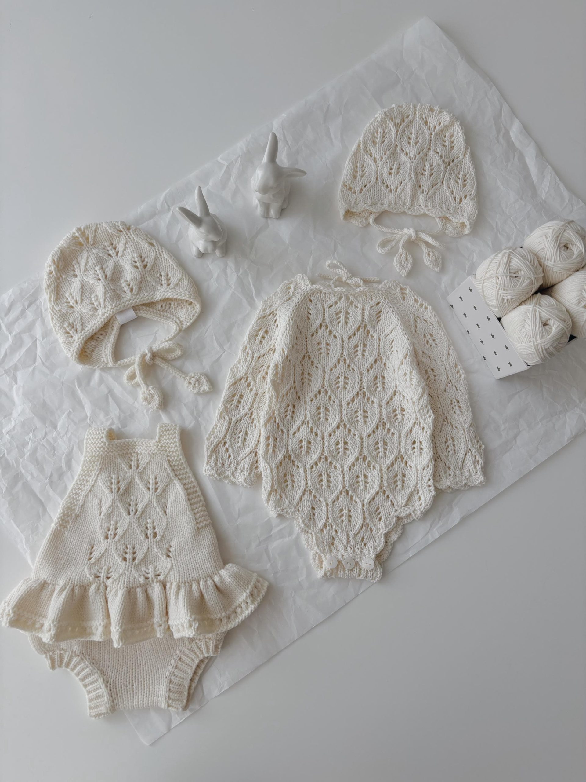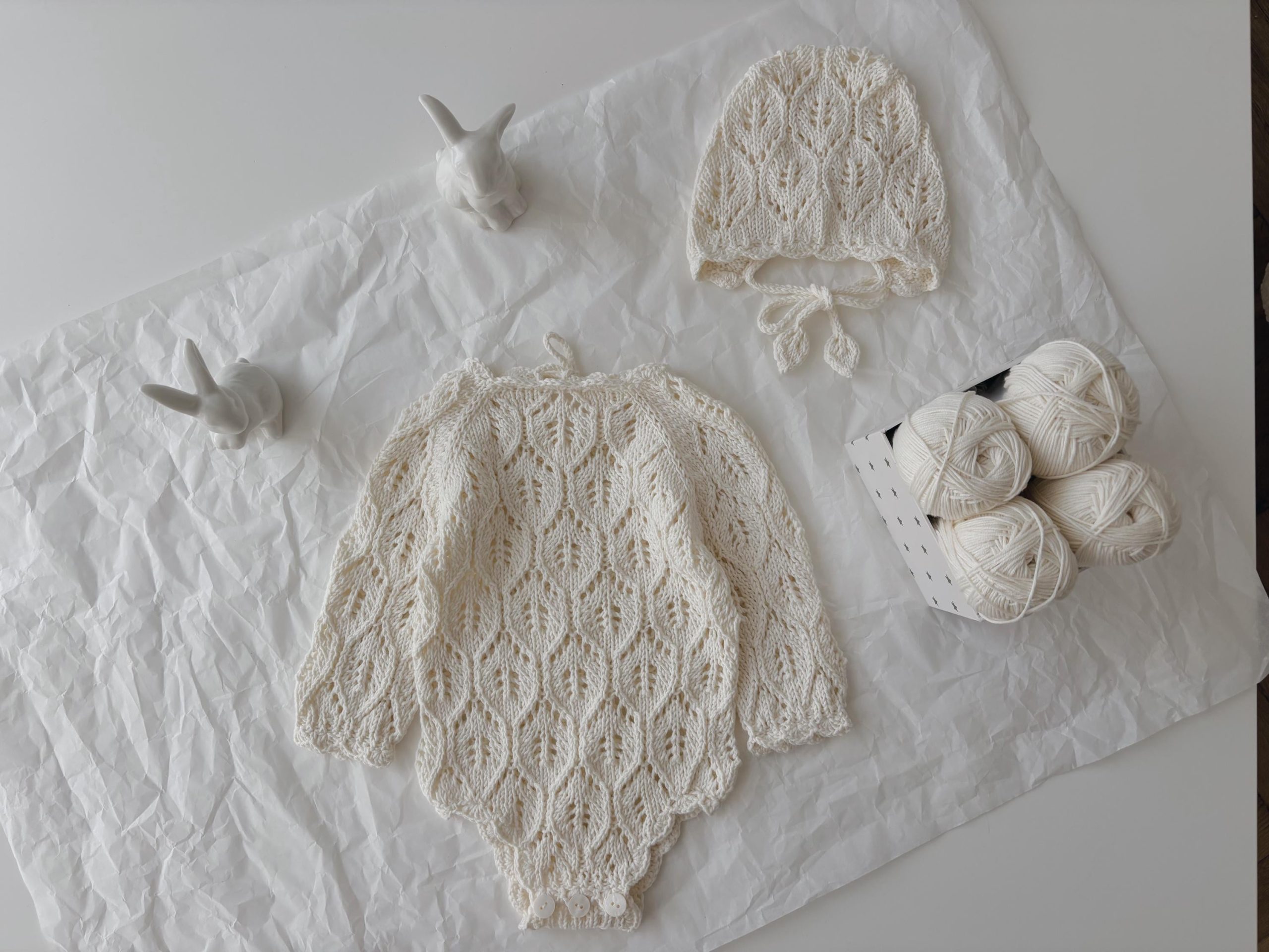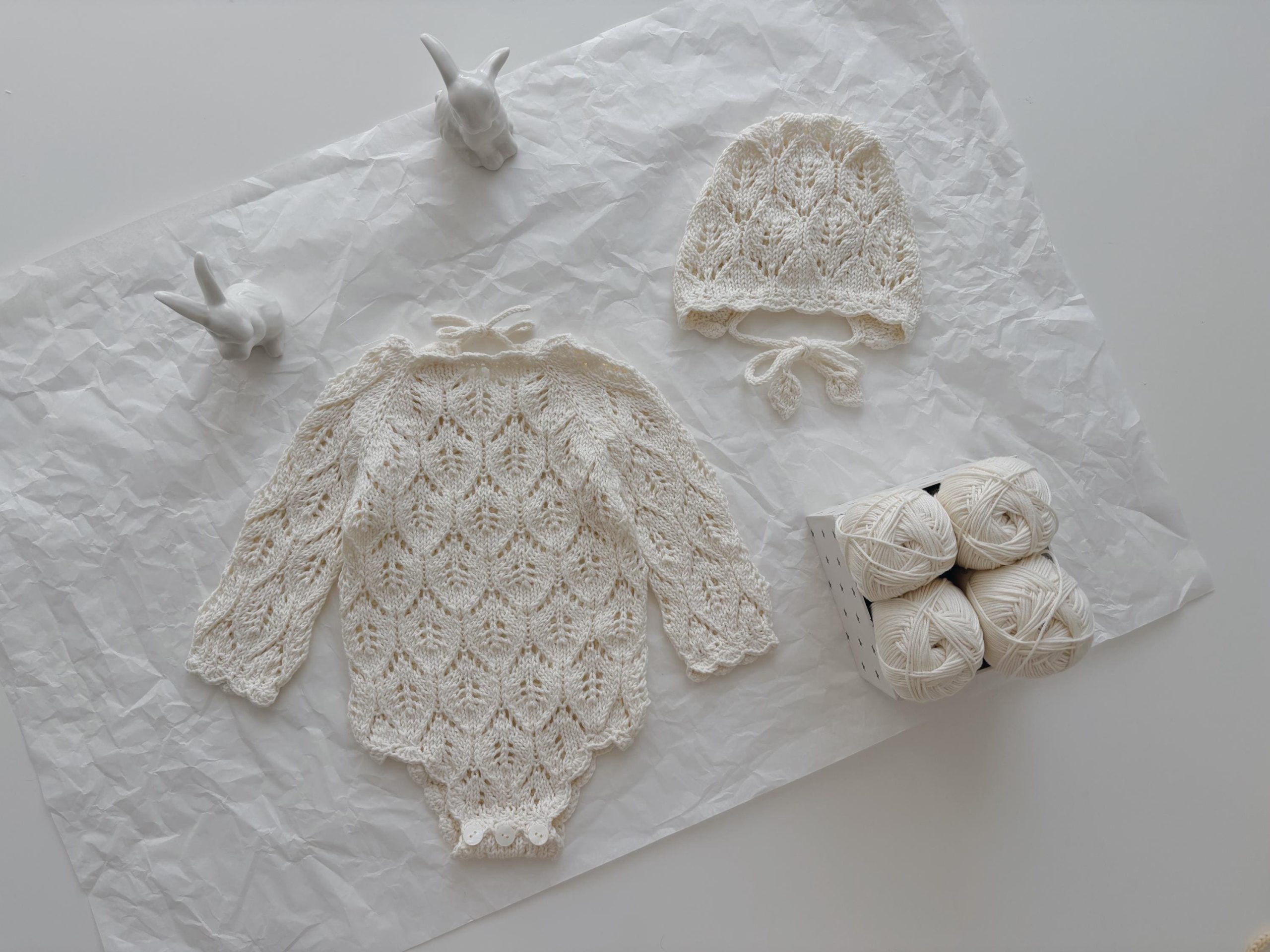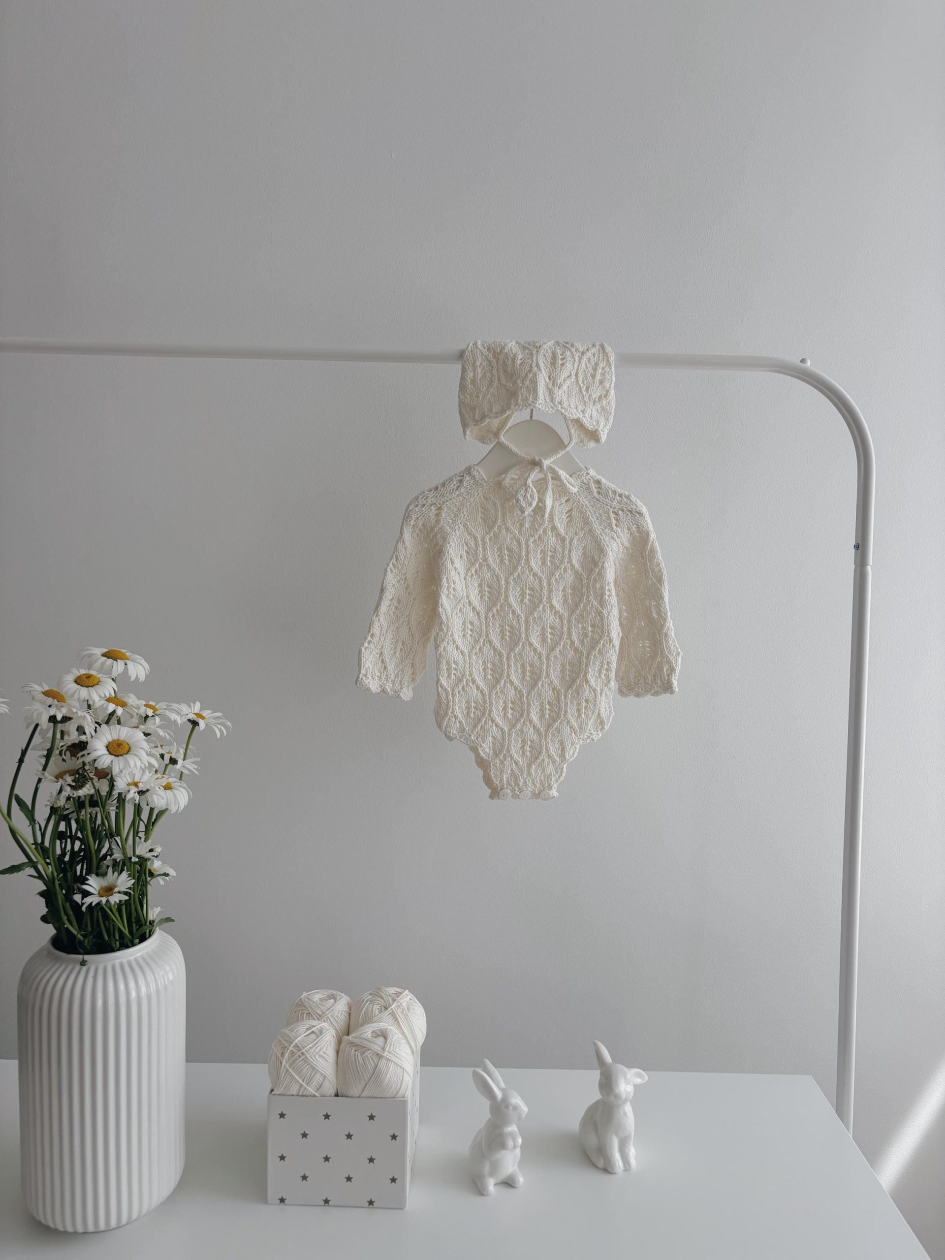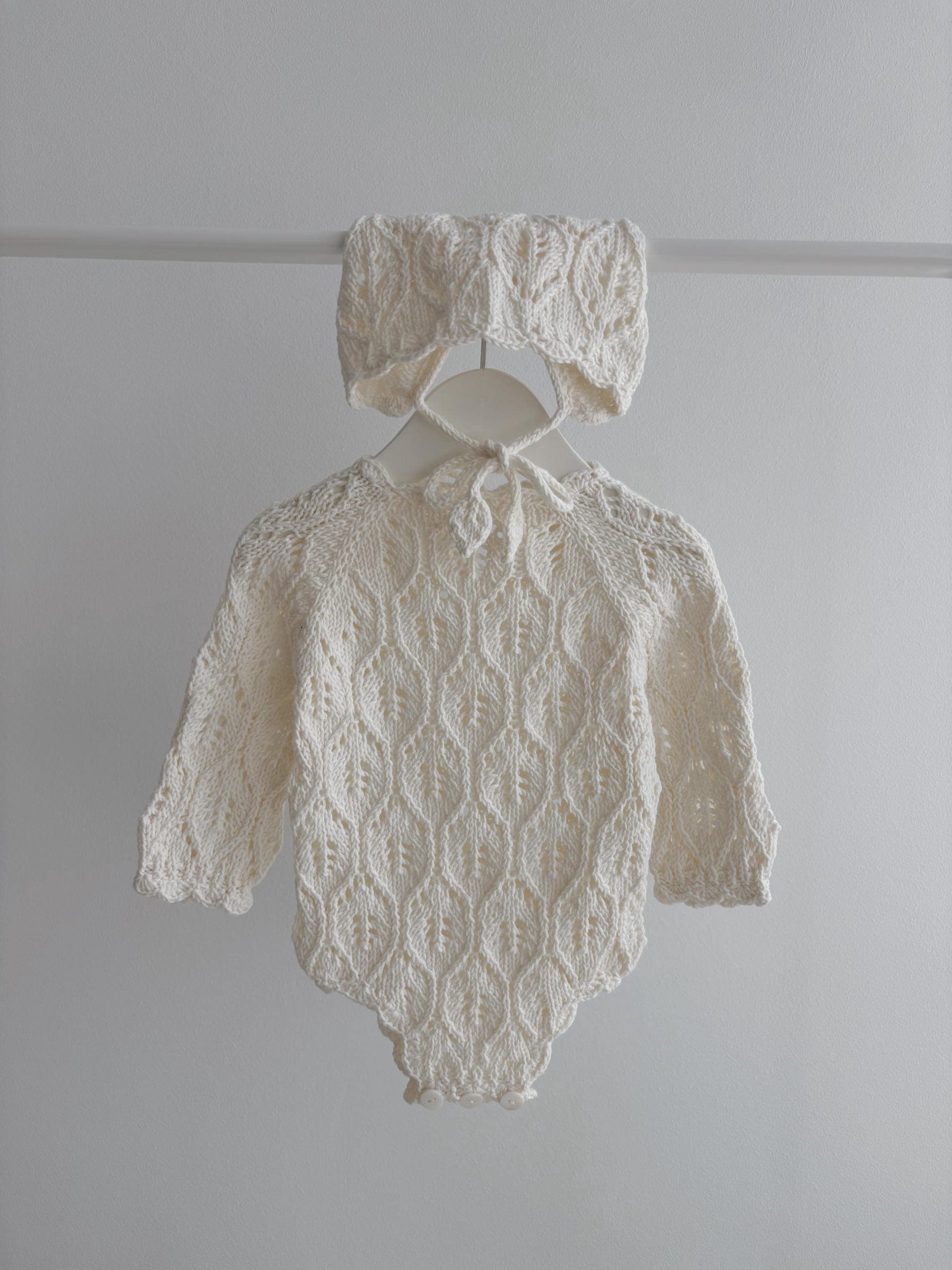 Knitted Baby Romper and Bonnet Set – Cream Cotton, Long Sleeve