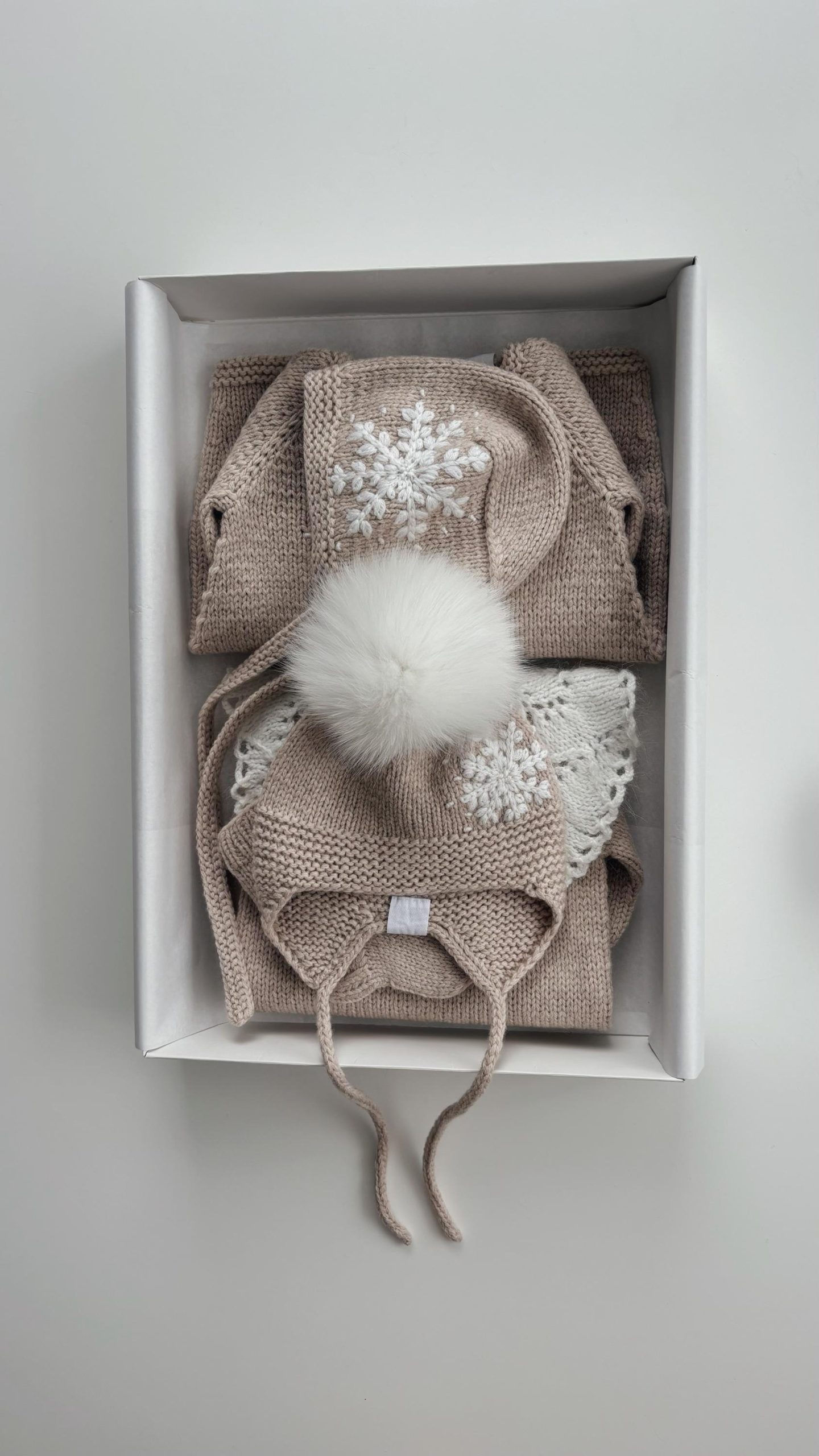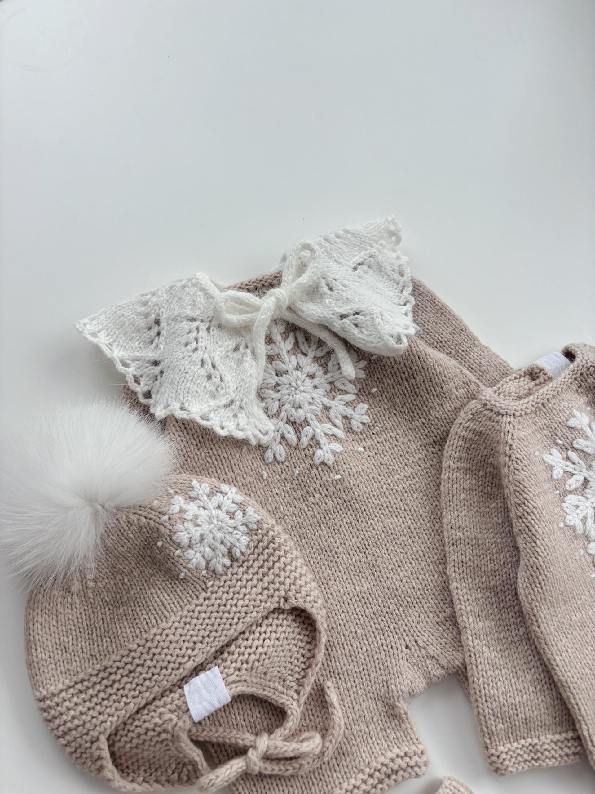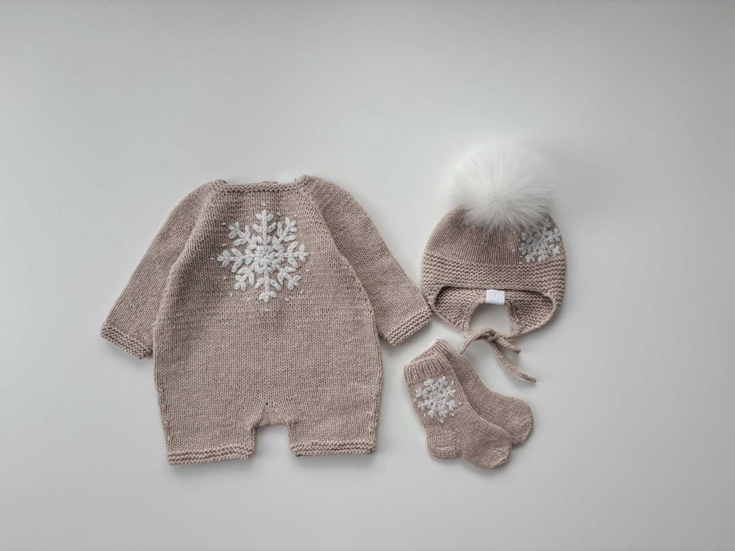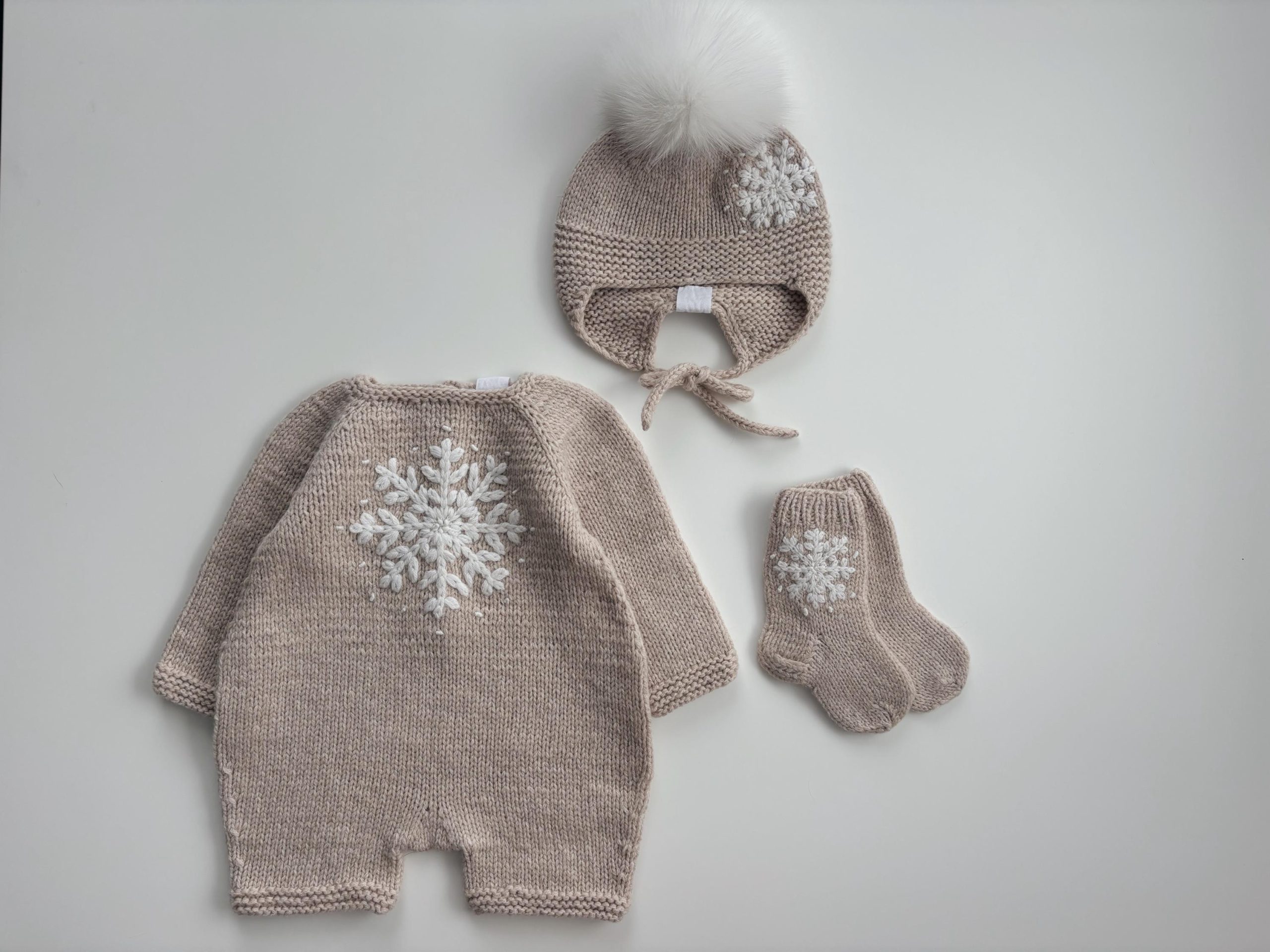 Knitted Merino Baby Romper, Bonnet, and Socks Set, Snowflake Outfit