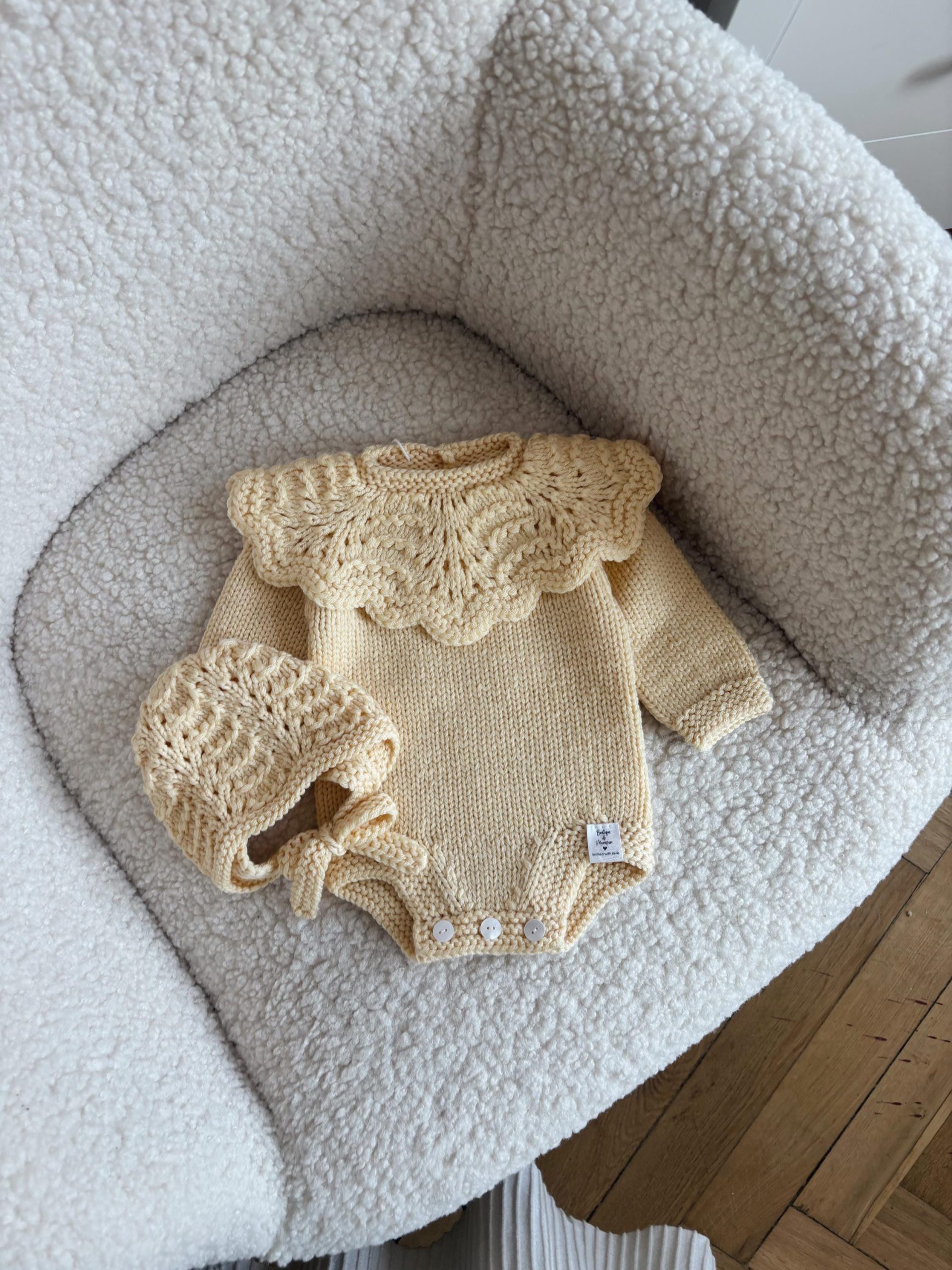 I have knitted this long sleeve romper with collar and bonnet from the wonderfully soft merino yarn.