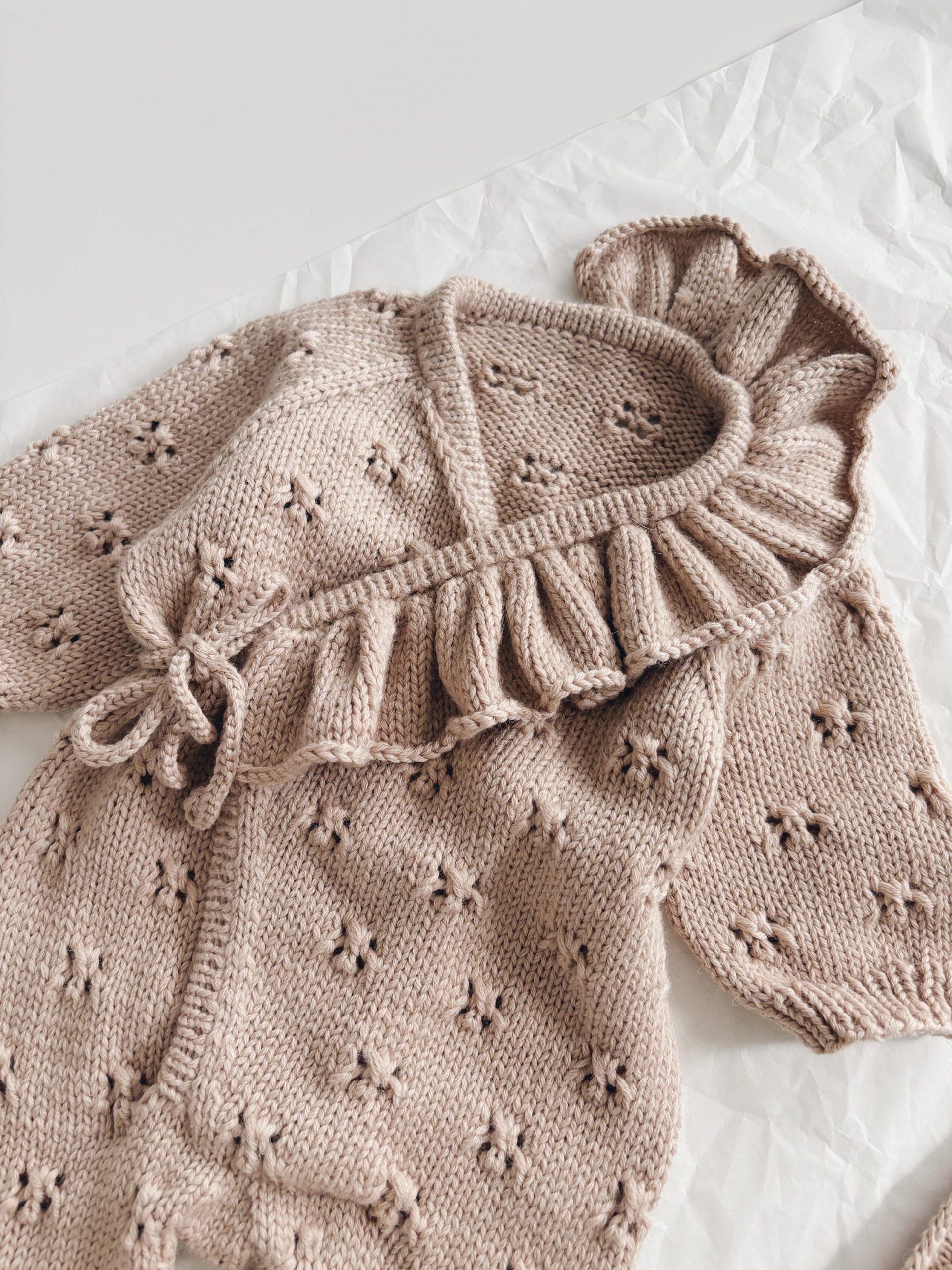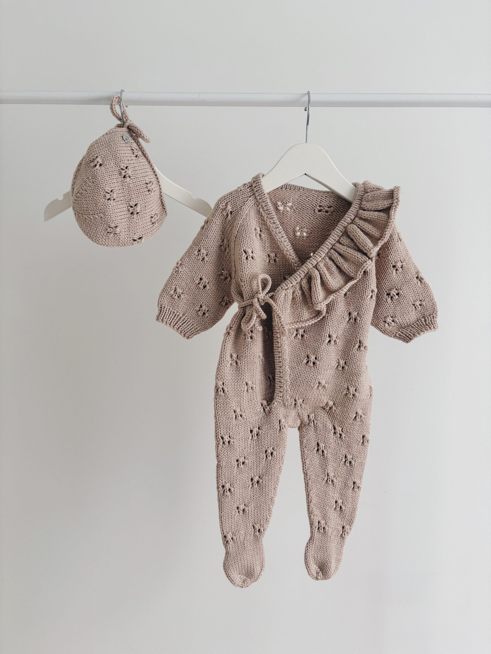 Alpaca Knit Baby Romper and Bonnet Set – Cream Outfit