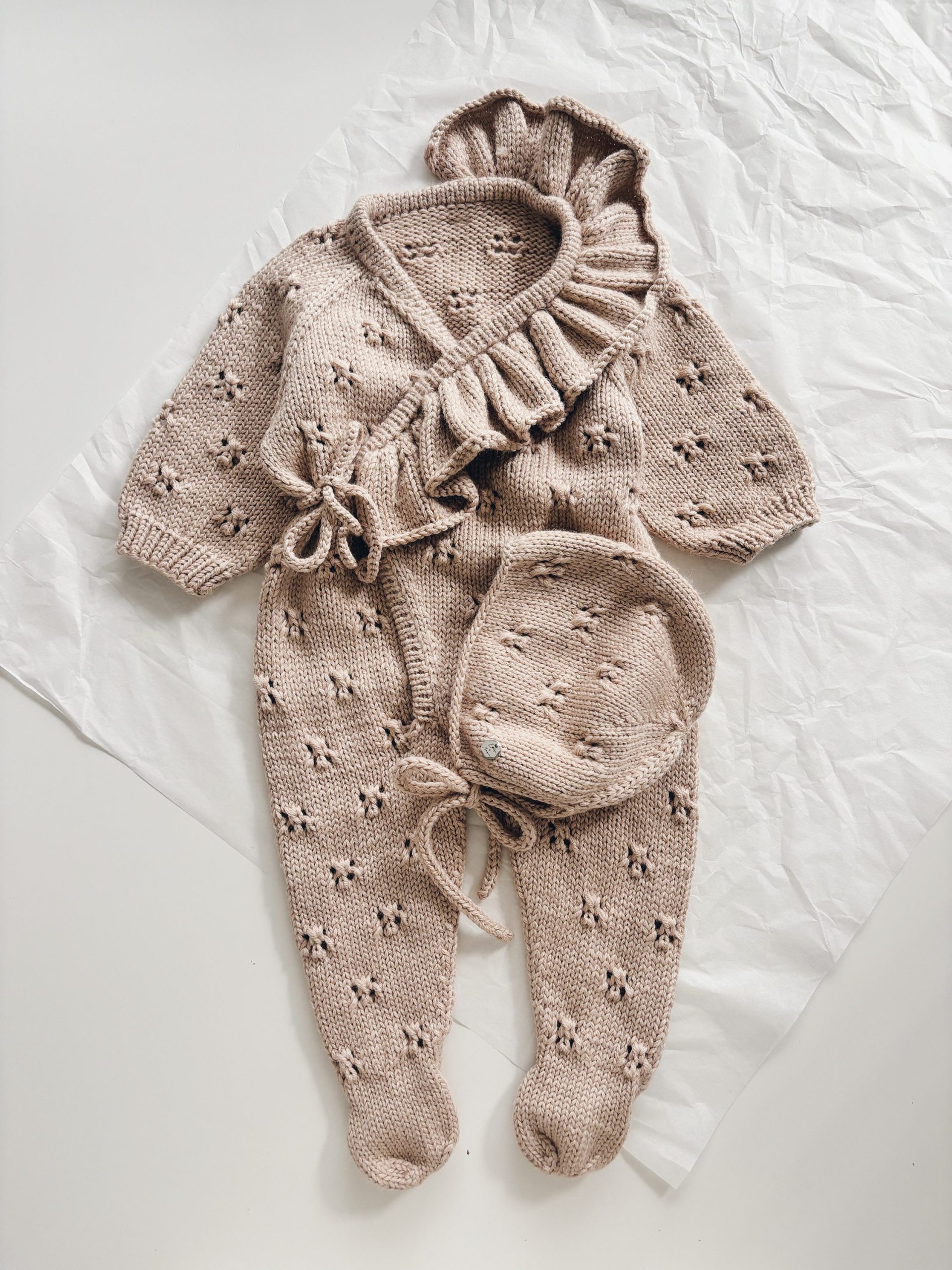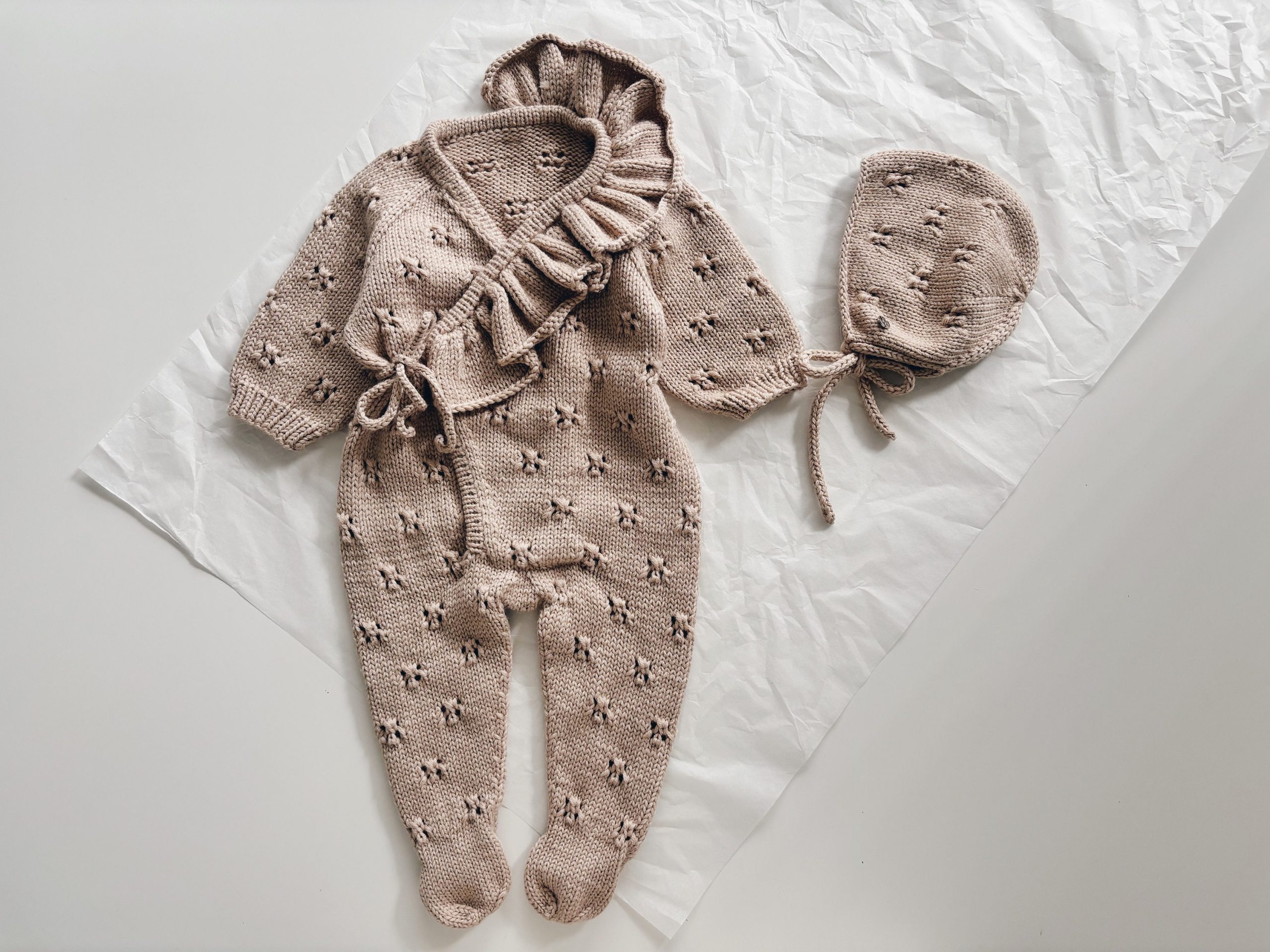 Embroidered Merino Baby Romper and Bonnet Set – Knitted Photo Prop