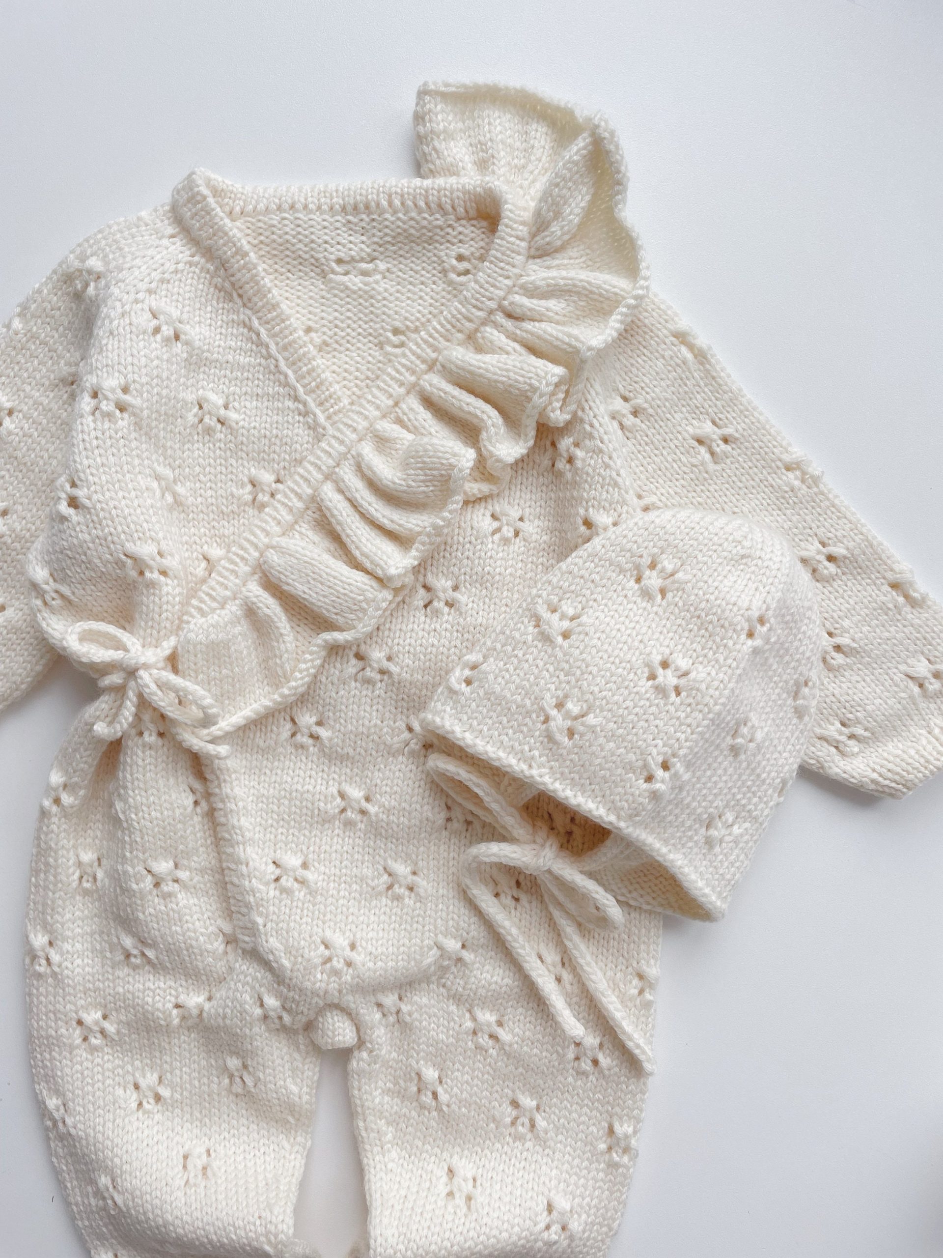 Merino Baby Romper and Bonnet Set – Cream Knit with Ruffles