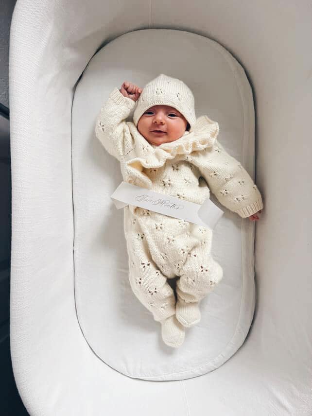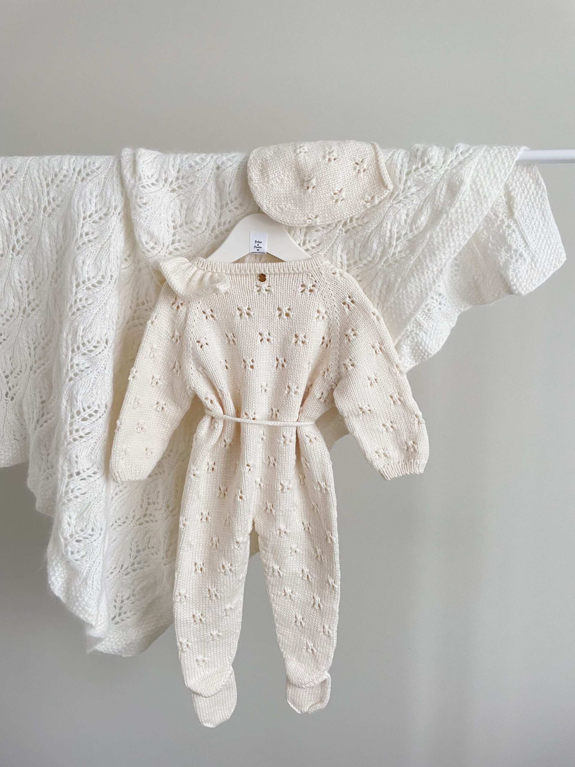 Alpaca Knit Baby Romper and Bonnet Set – Cream Outfit