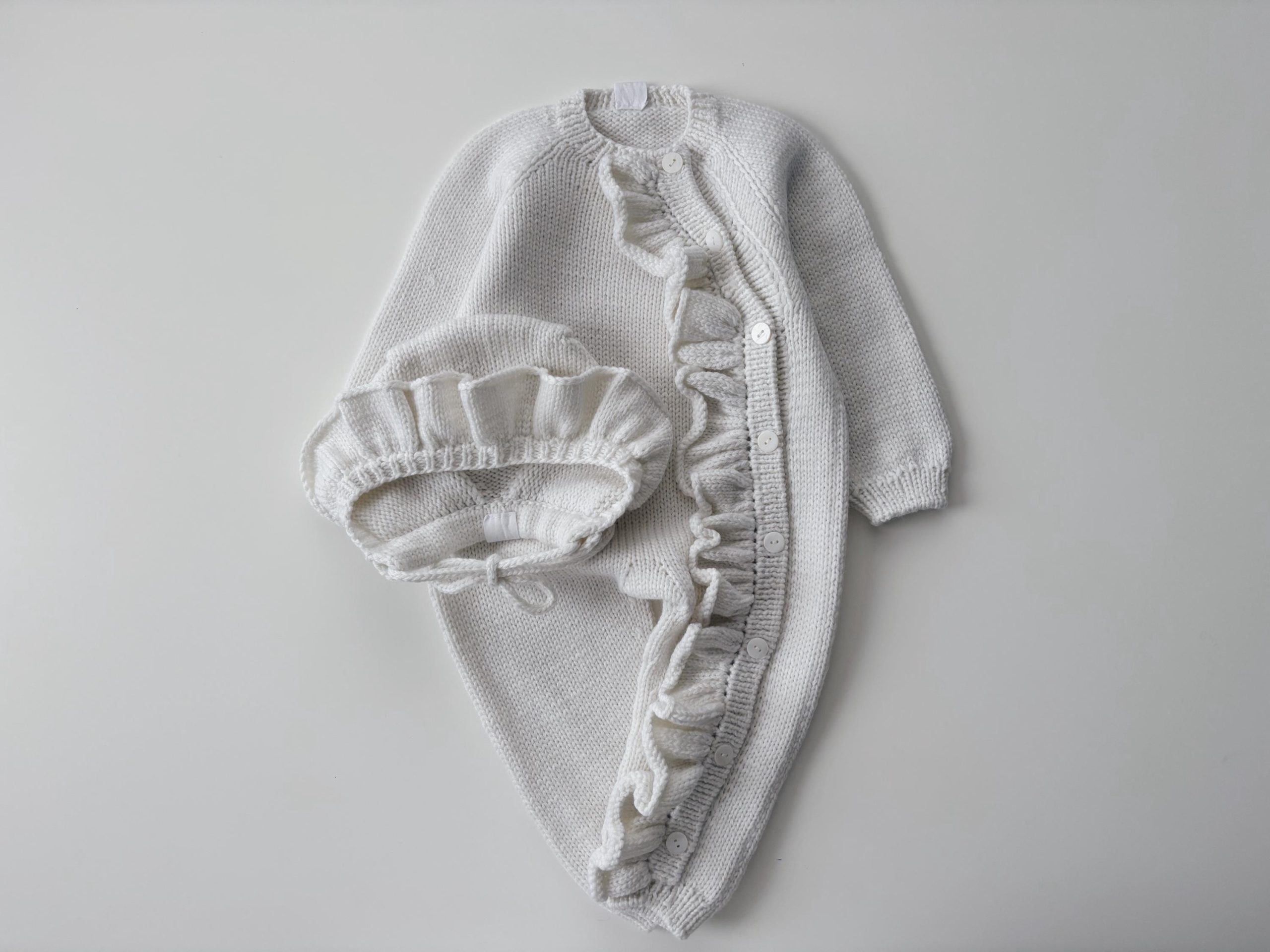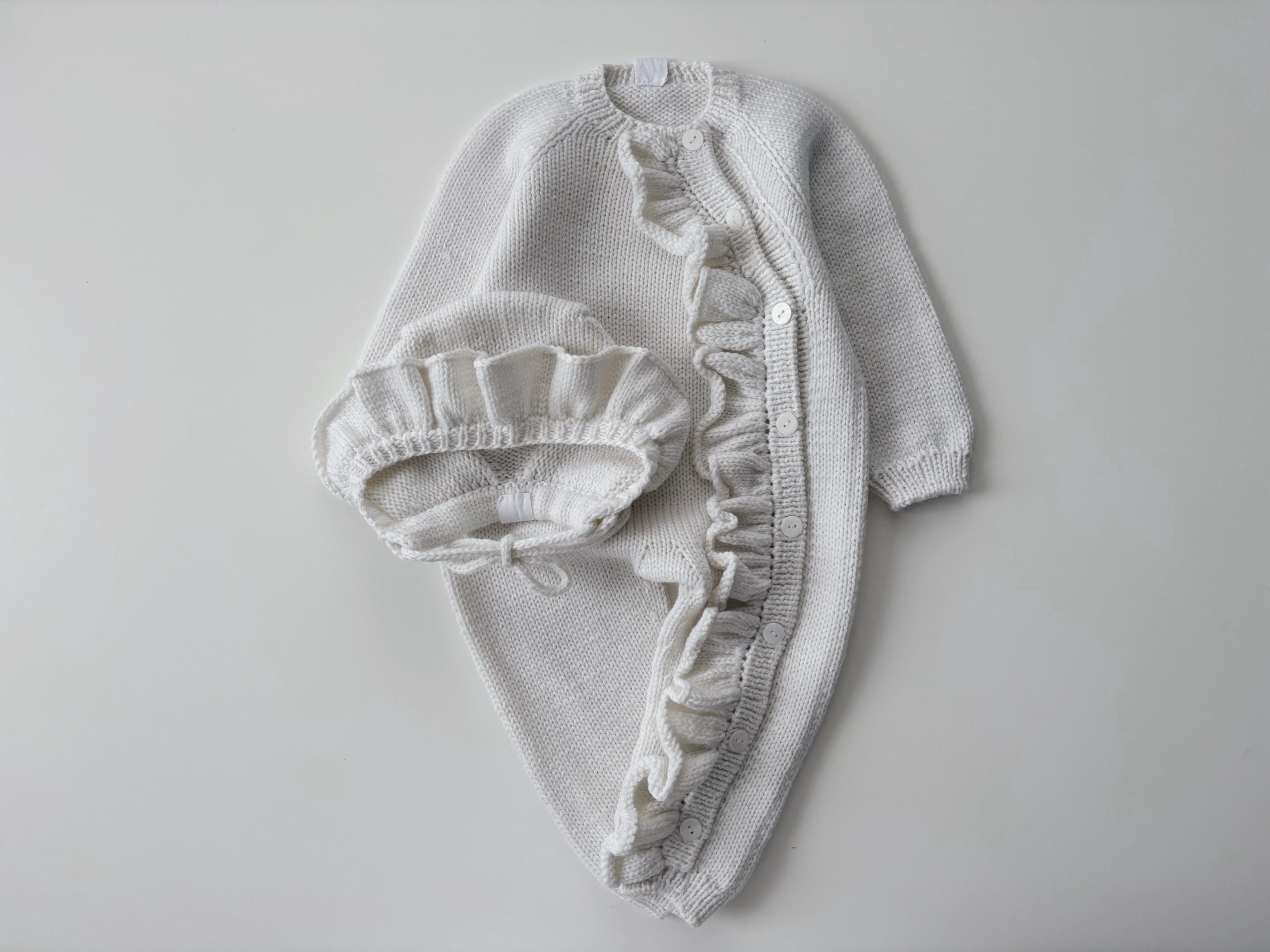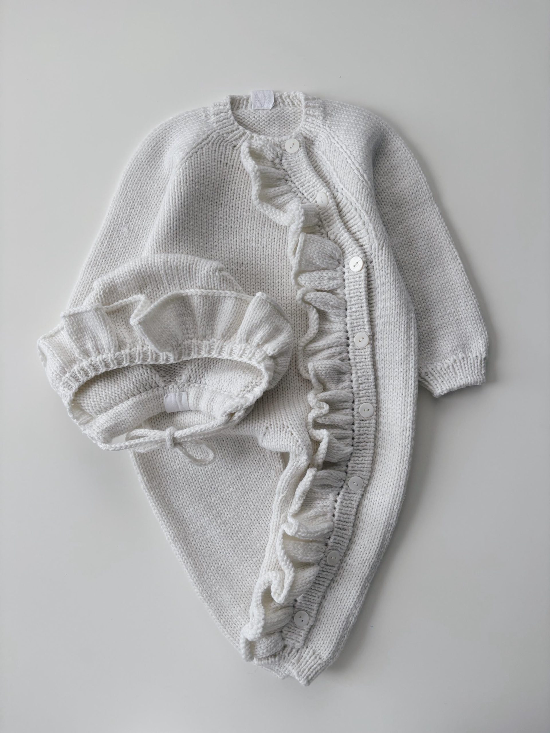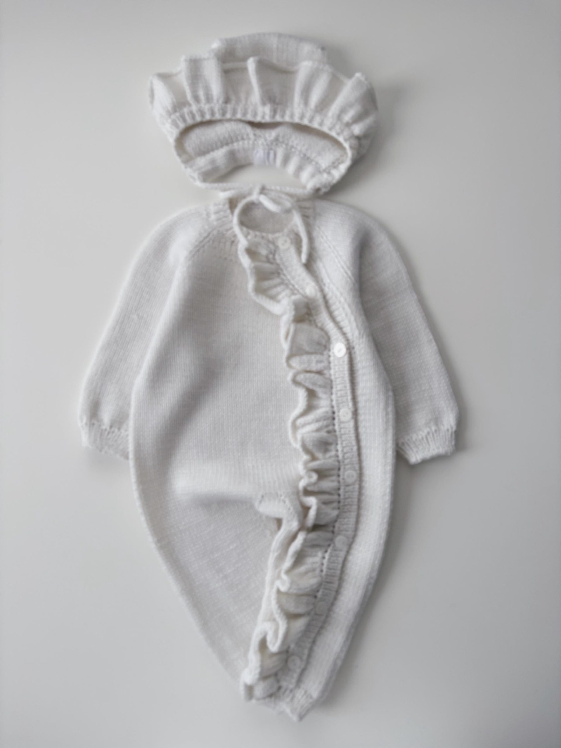 Merino Baby Romper and Bonnet Set – Ruffle Details, 3-6 Months