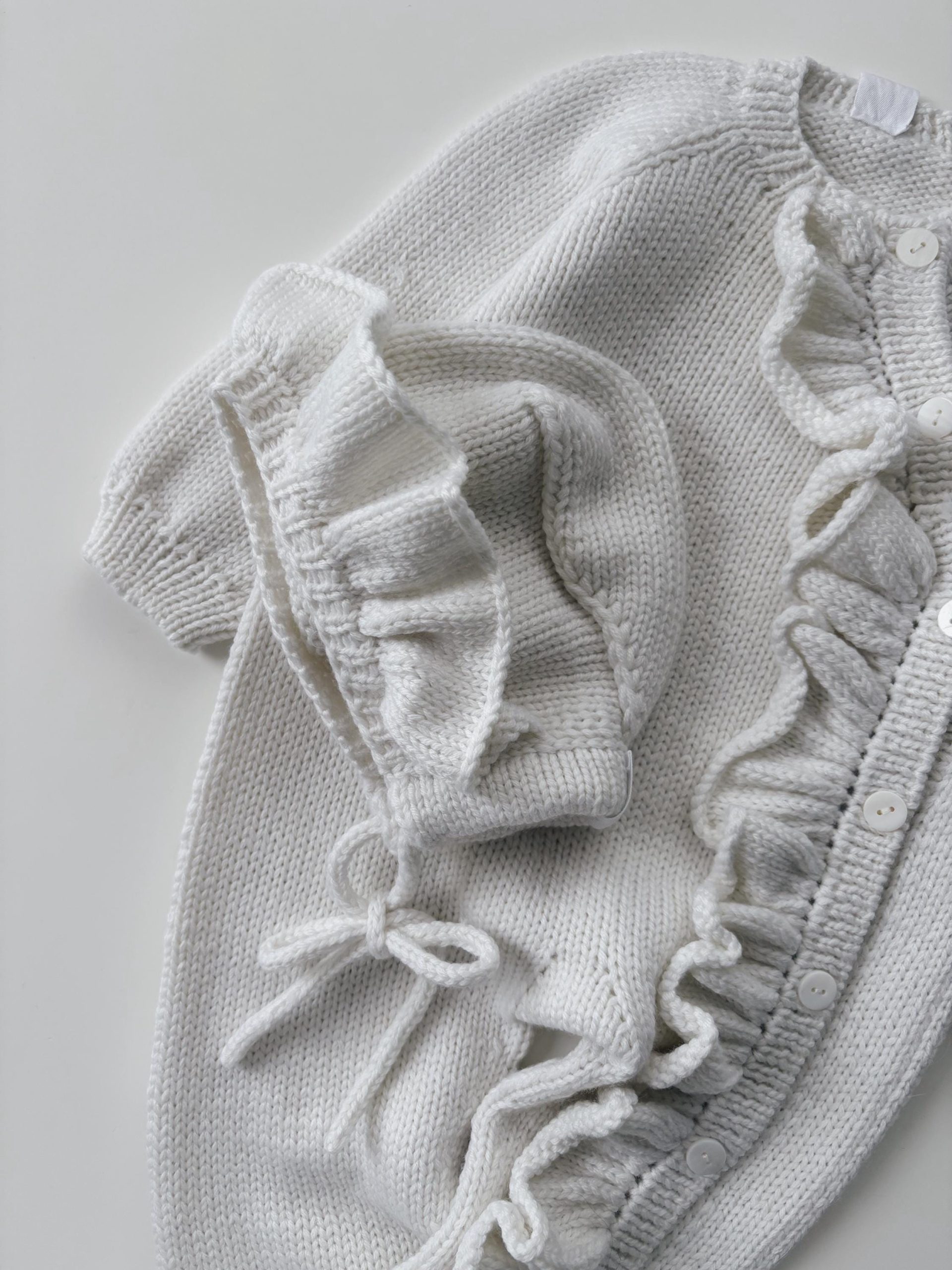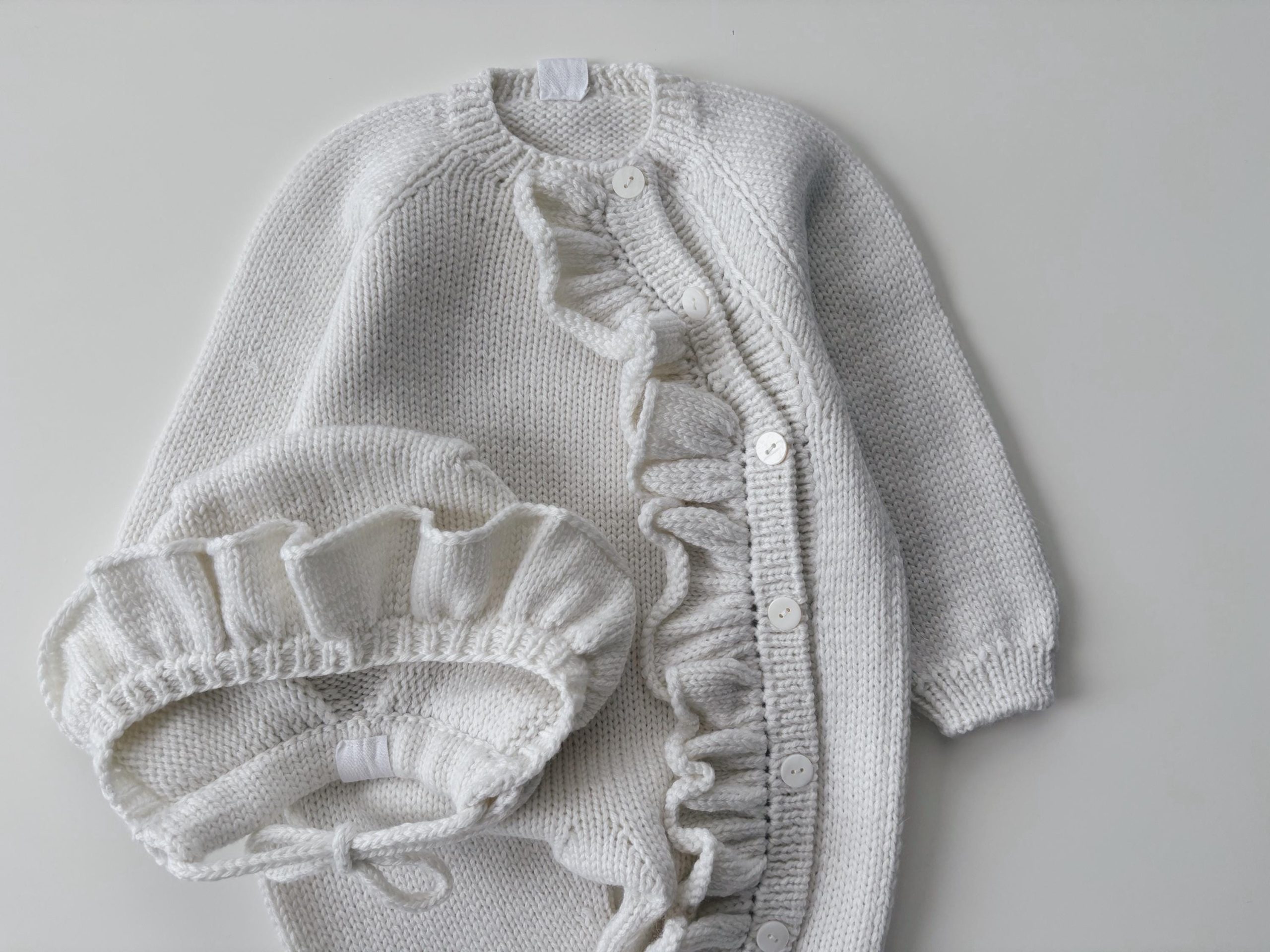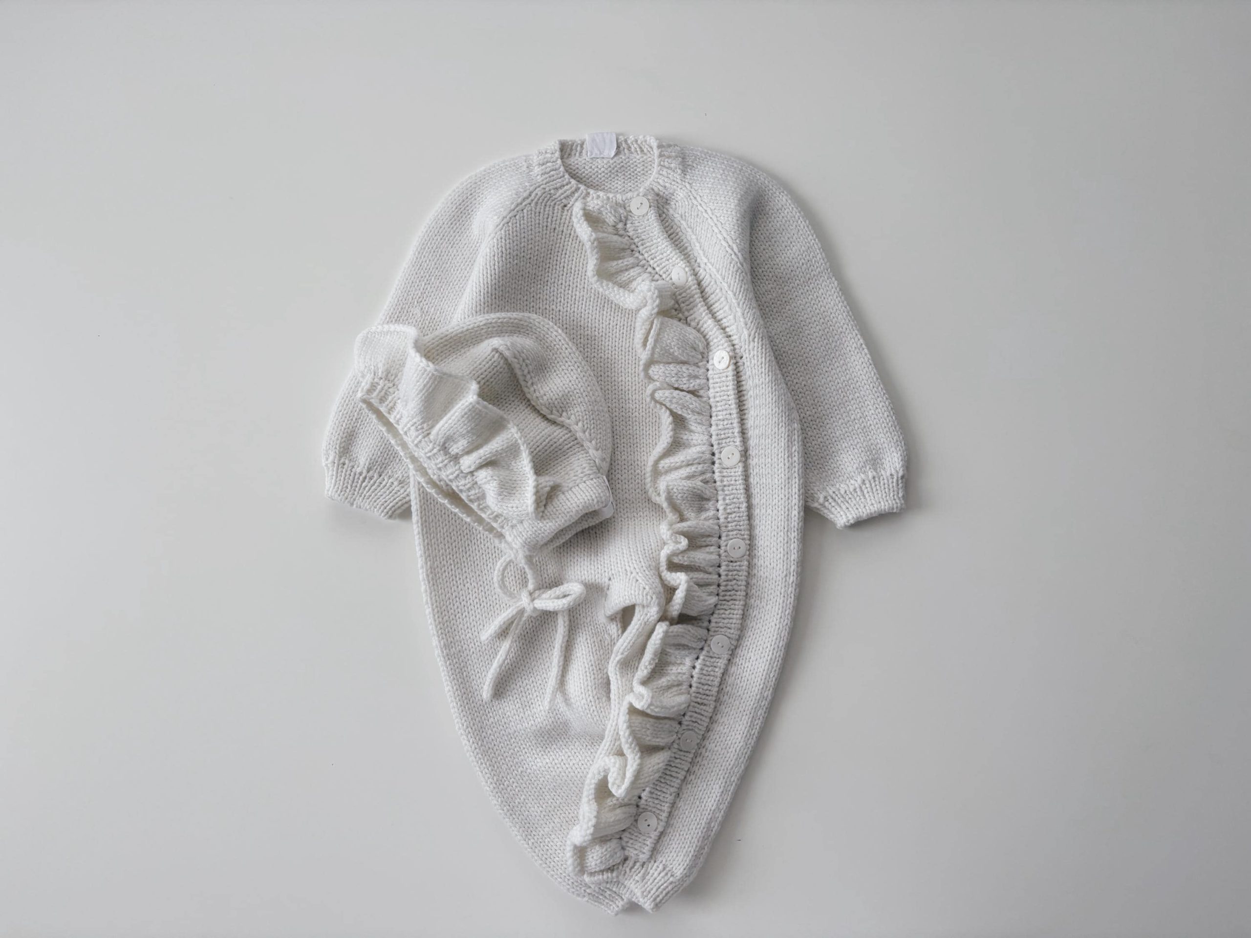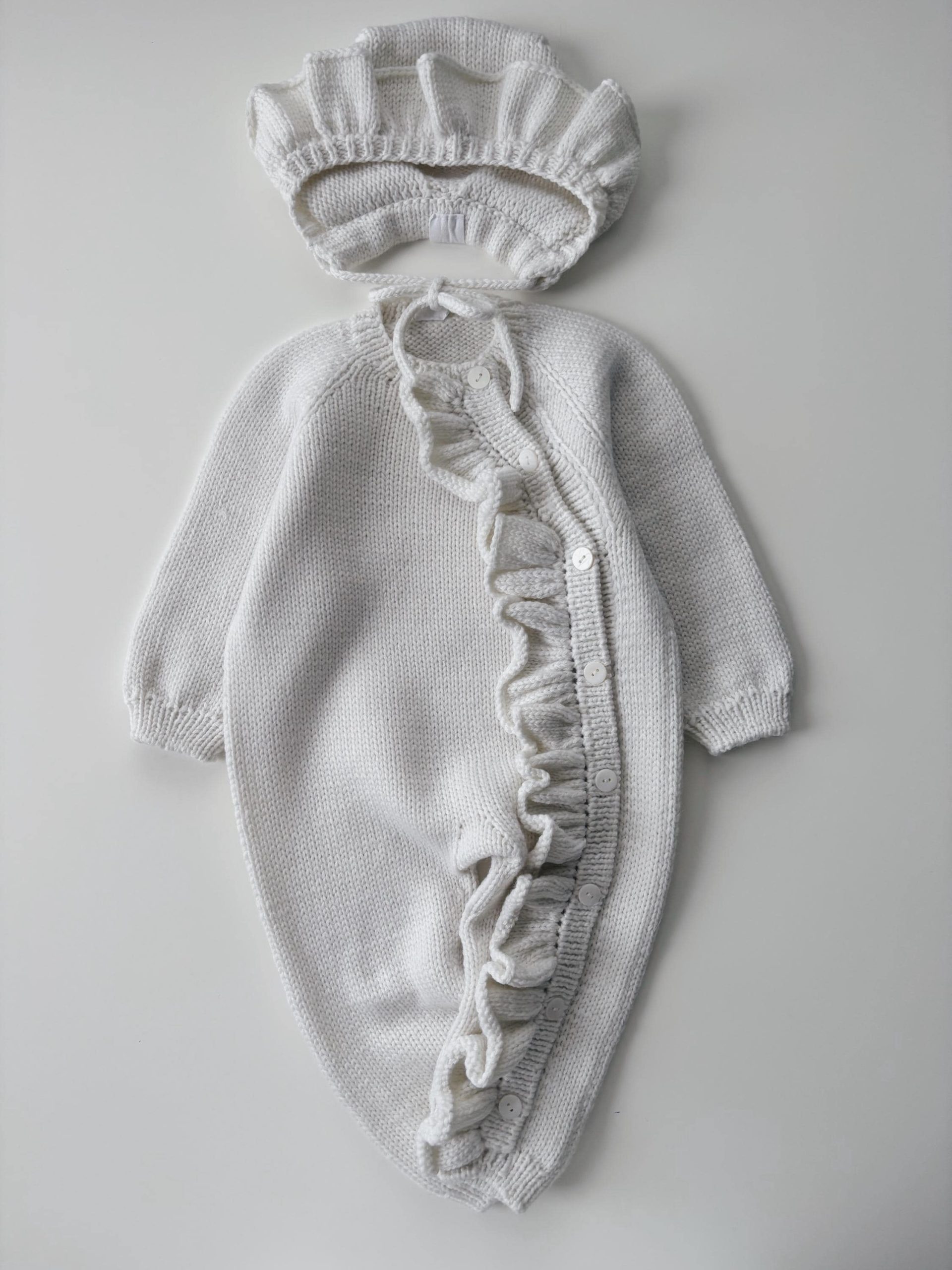 Merino Baby Romper and Bonnet Set – Ruffle Details, 3-6 Months