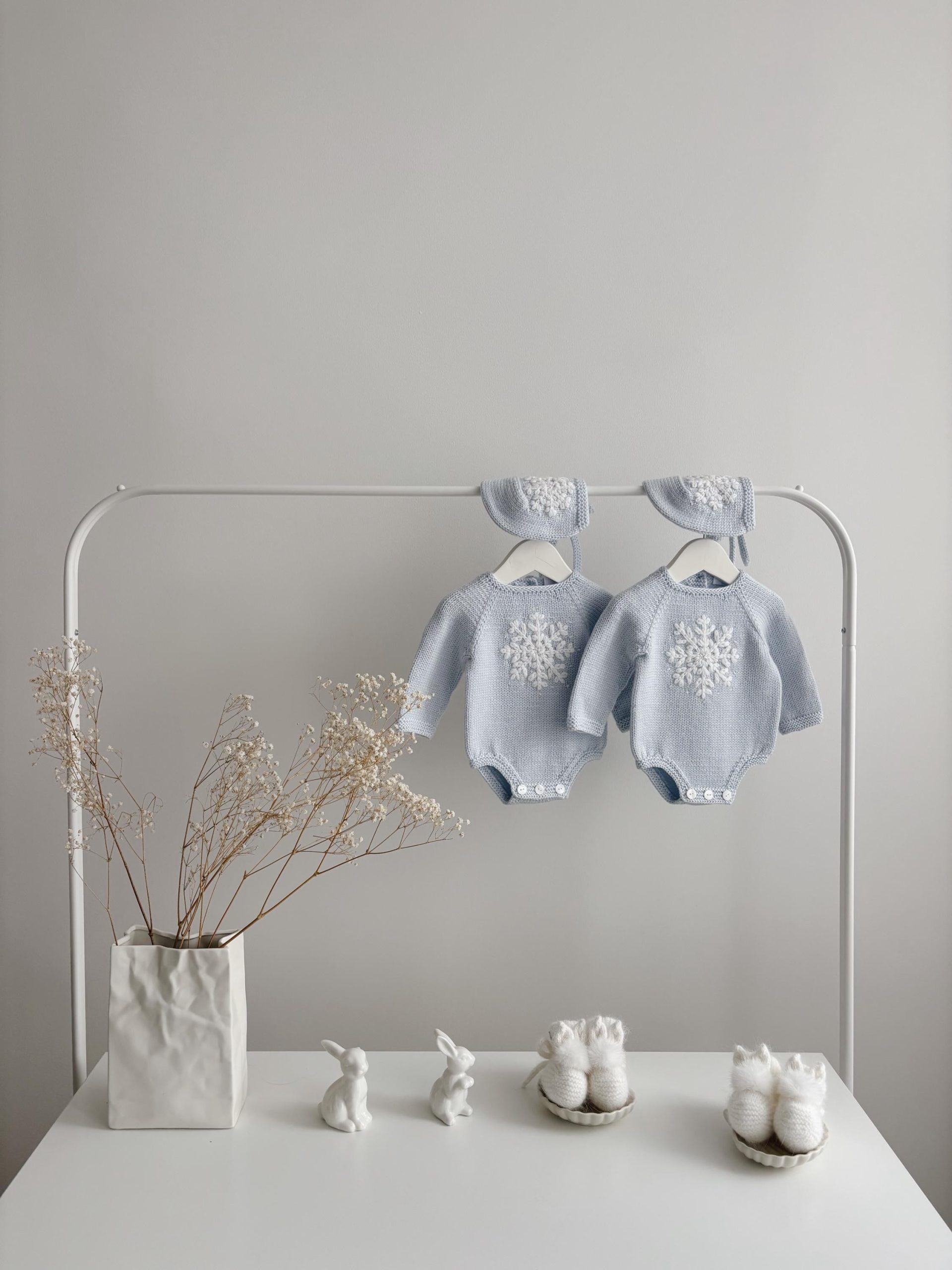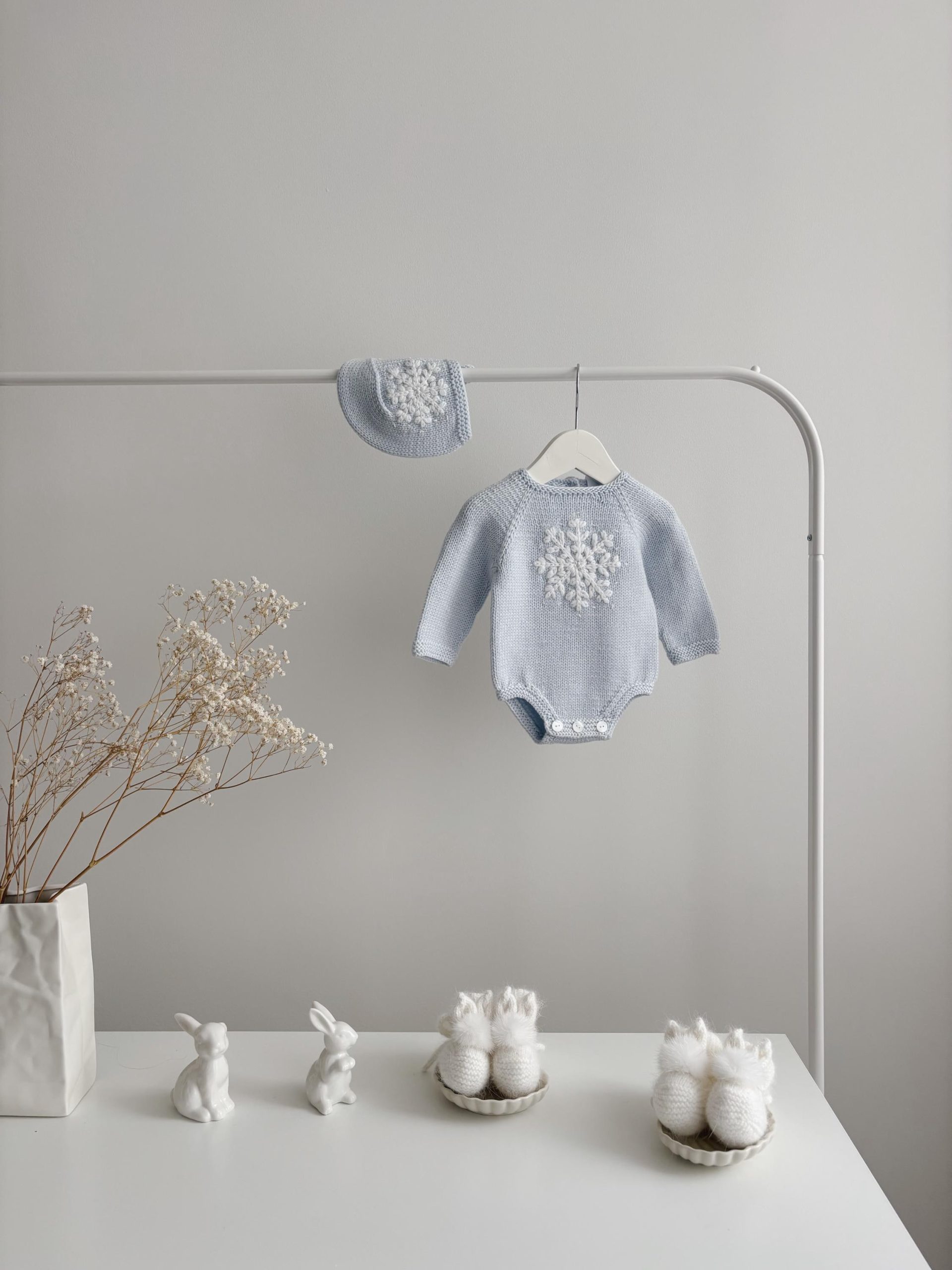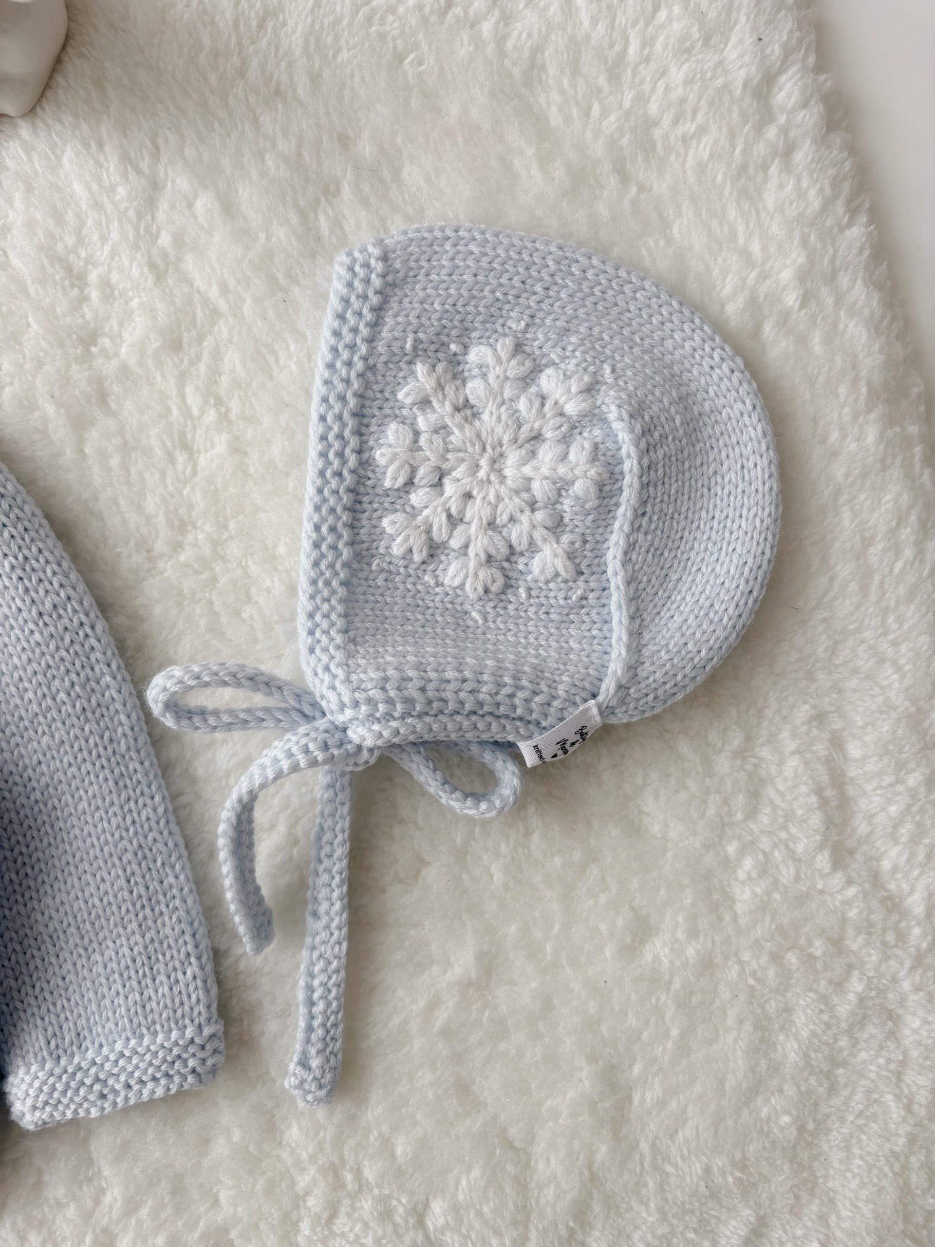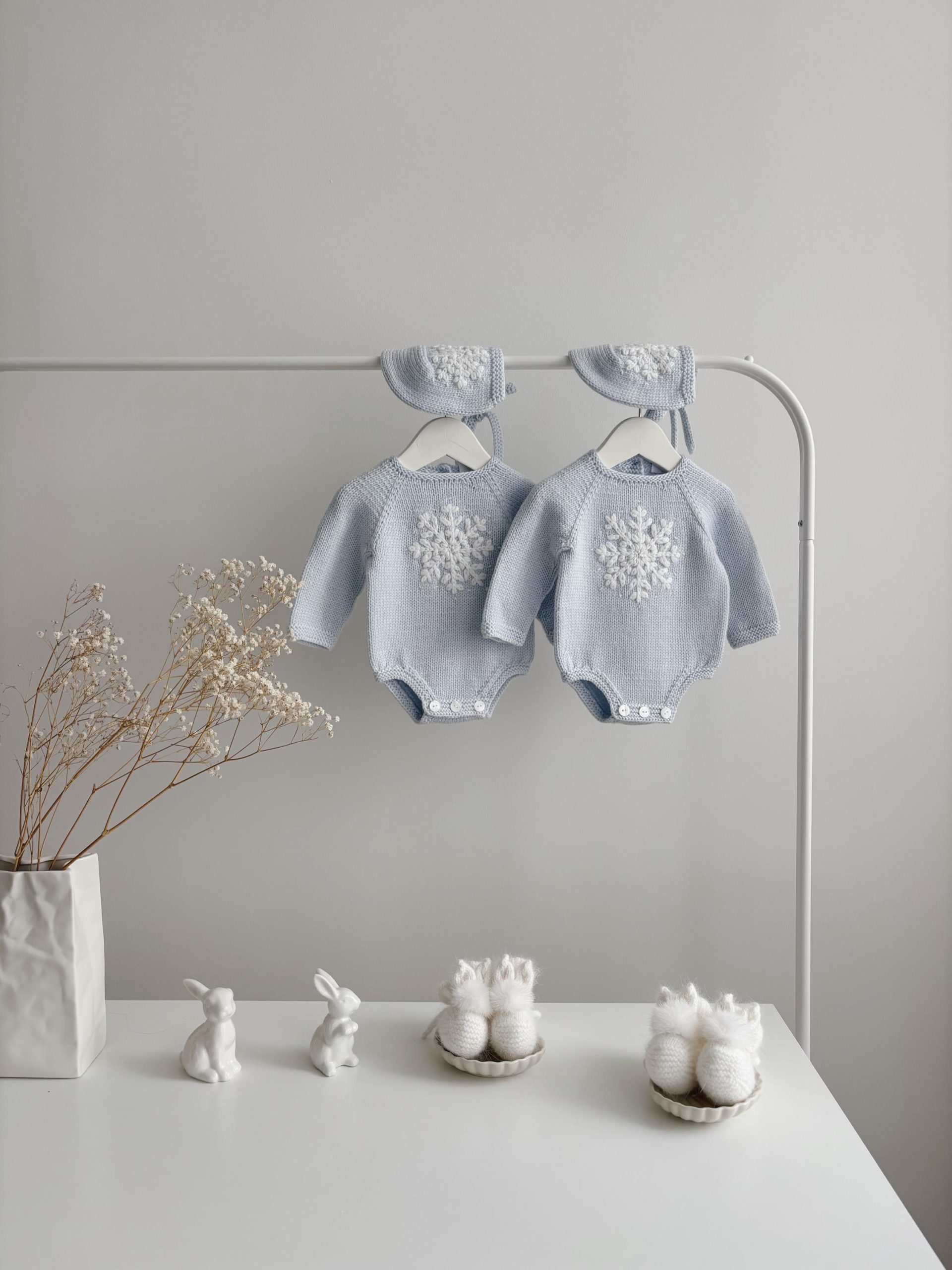 Merino Baby Romper and Bonnet Set – Snowflake Embroidery, 0-3 Months