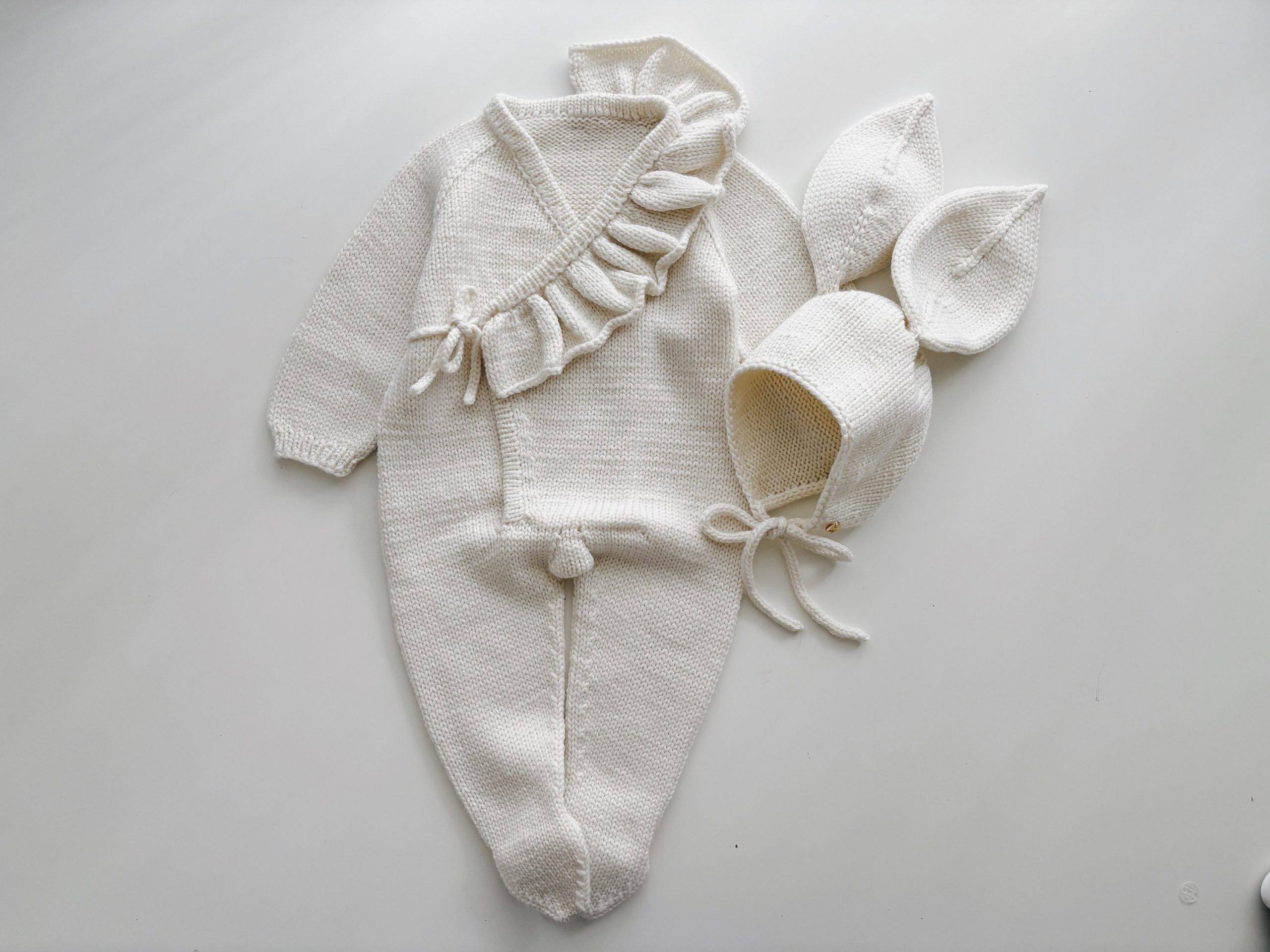 Embroidered Merino Baby Romper and Bonnet Set – Knitted Photo Prop