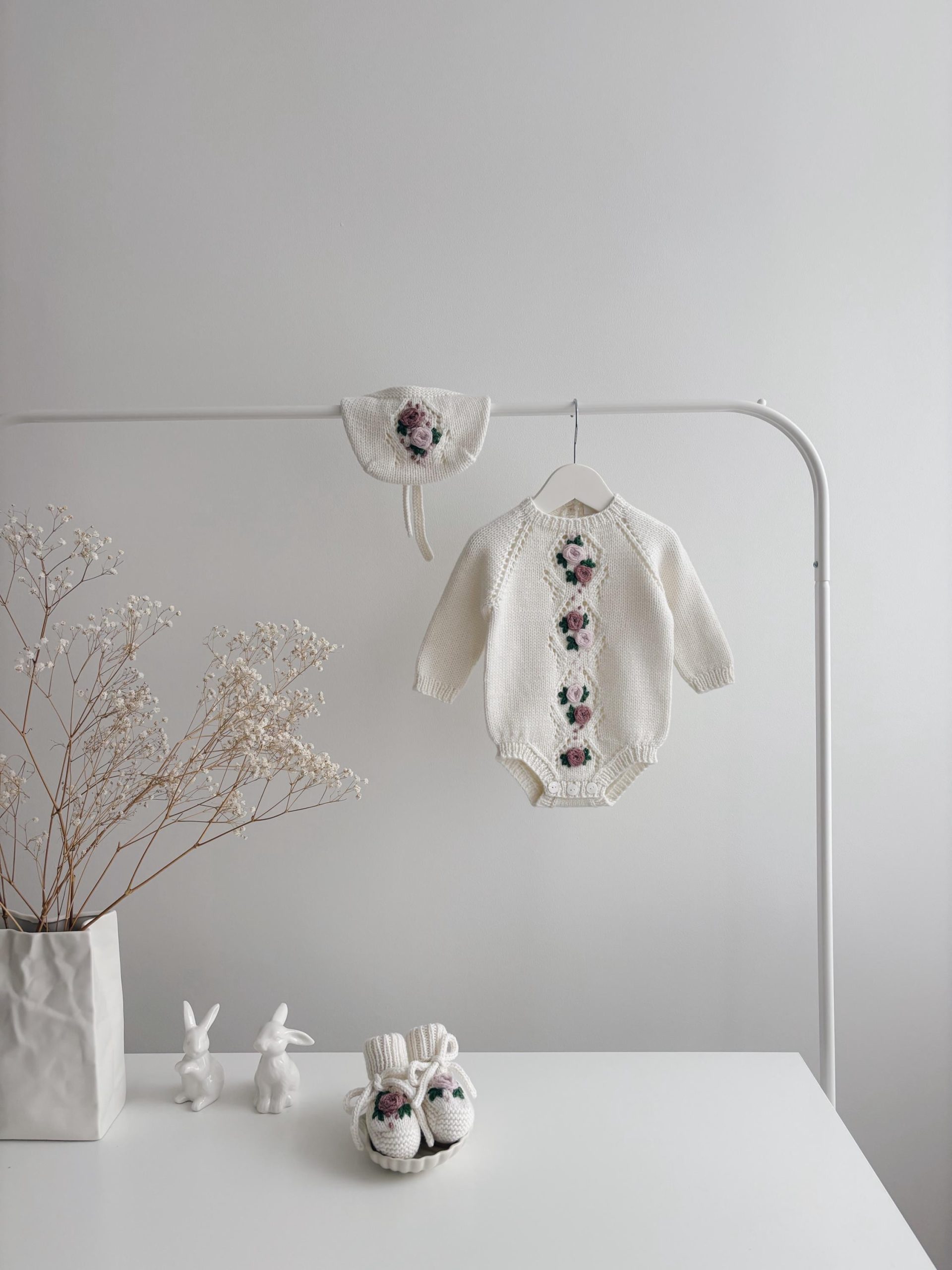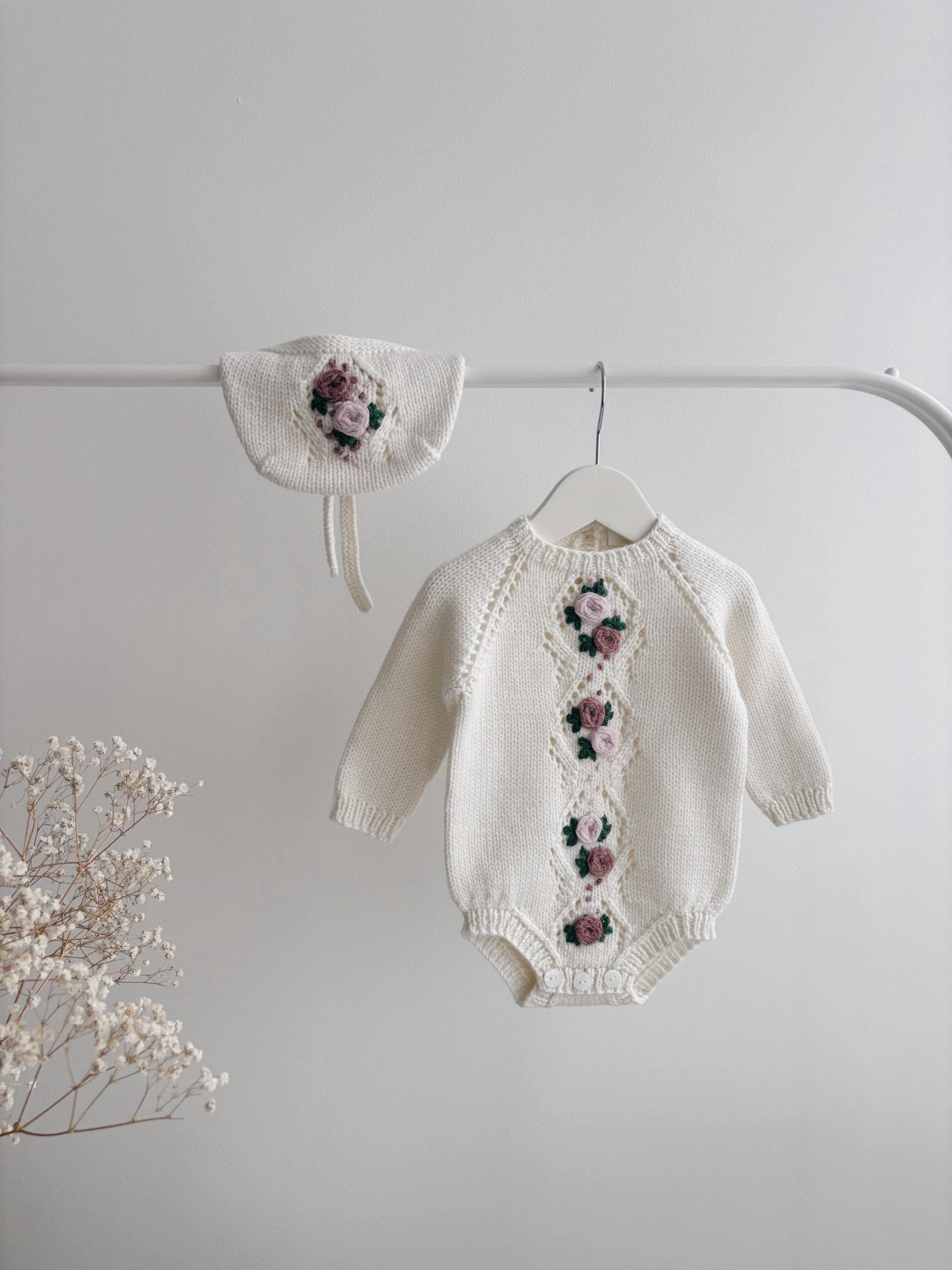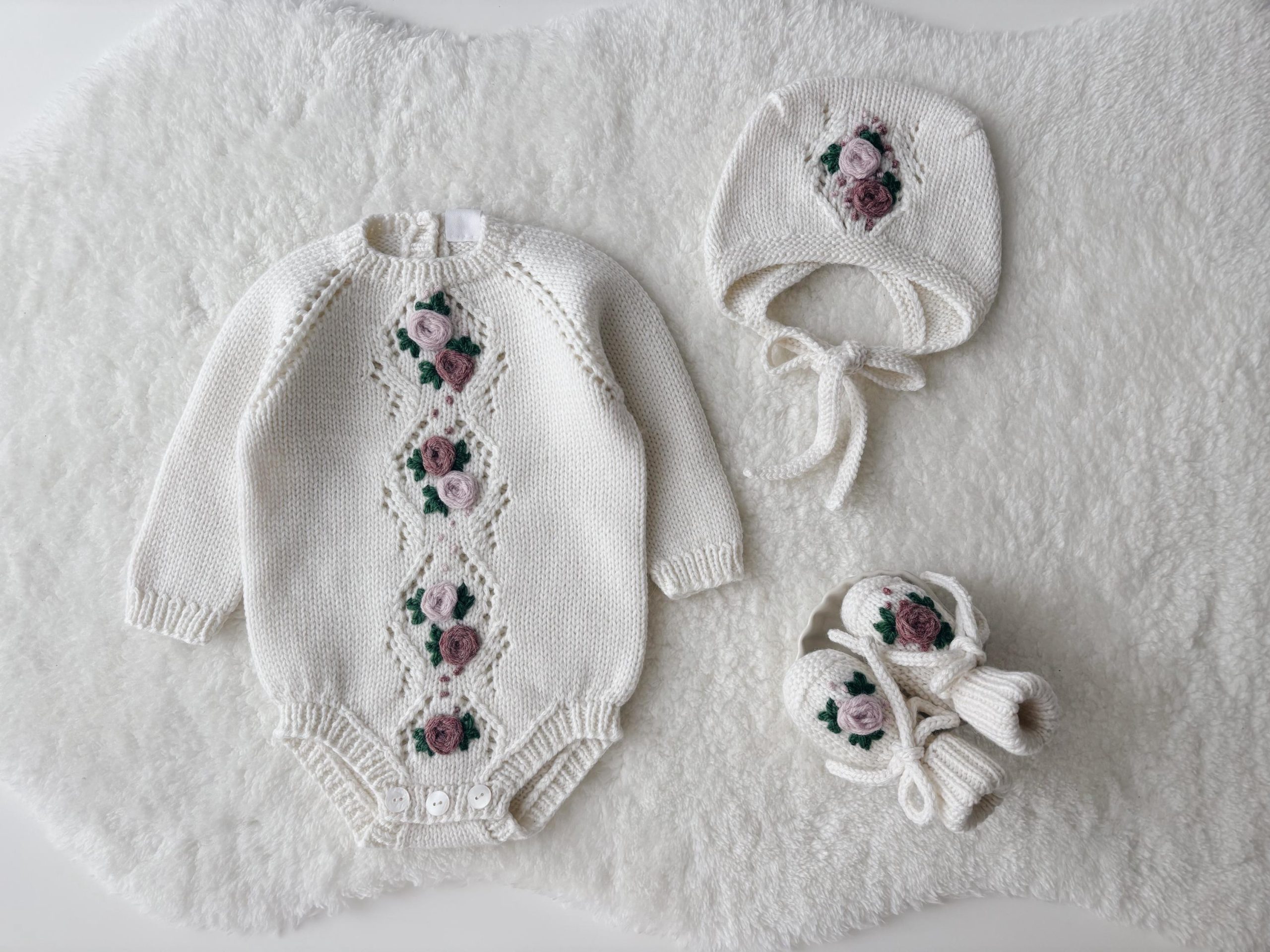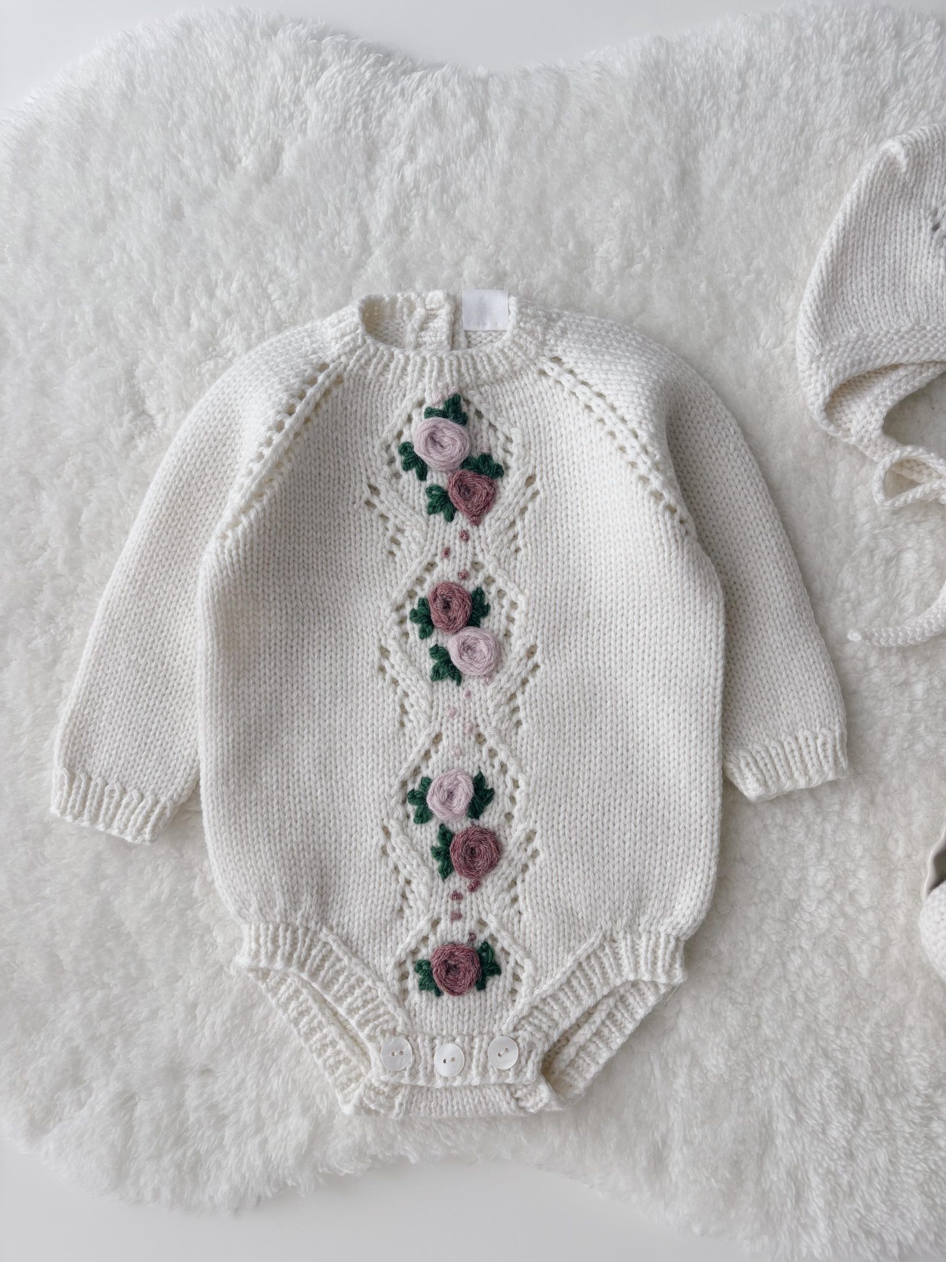 Embroidered Merino Baby Romper and Bonnet Set – Knitted Photo Prop