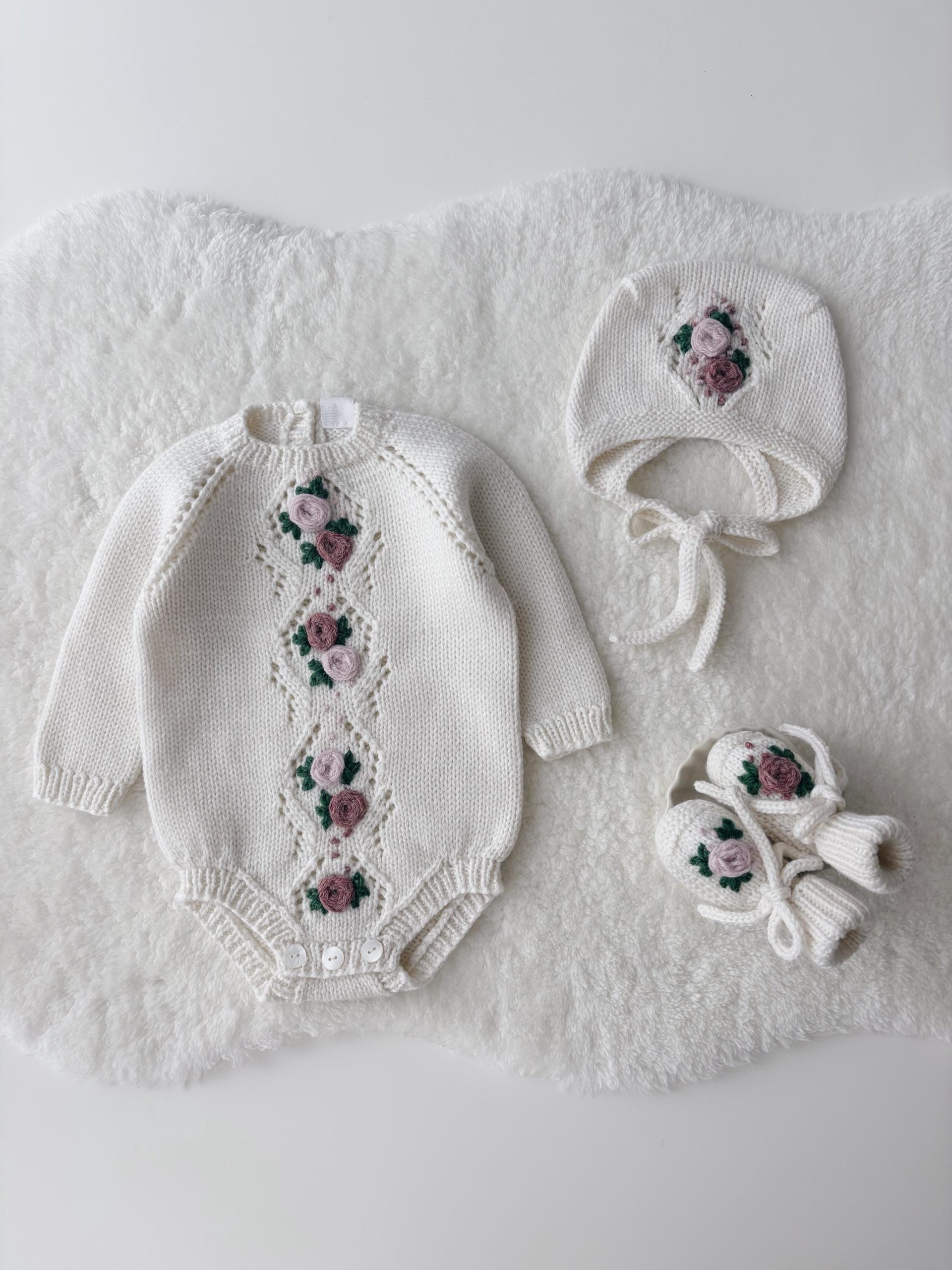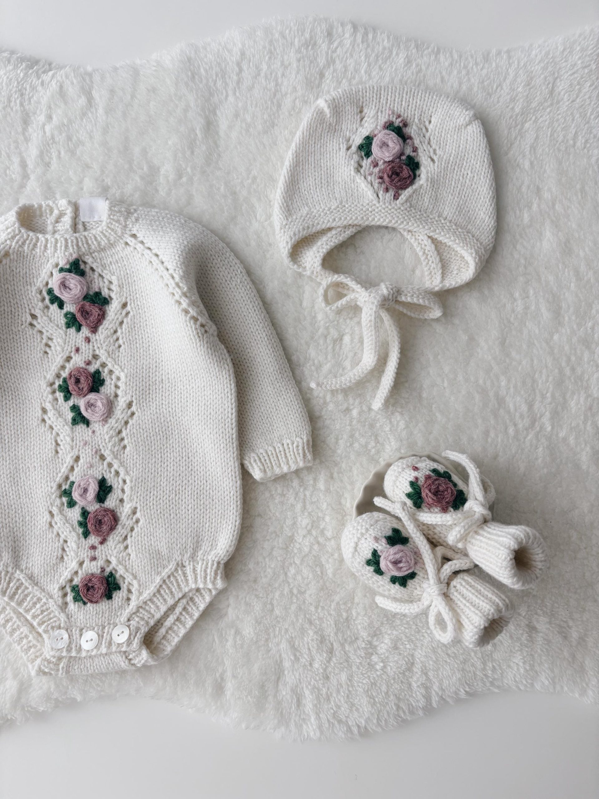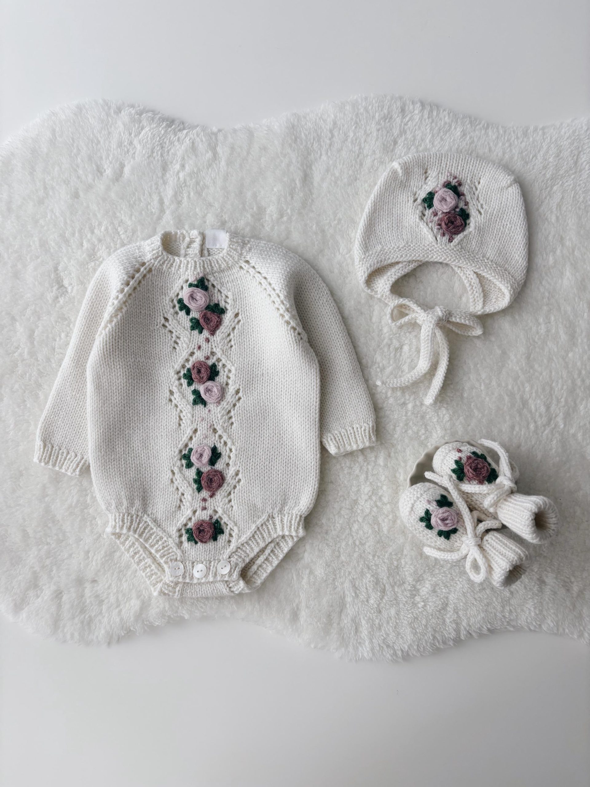 Merino Baby Romper Set, Embroidered Flowers, Bonnet and Socks