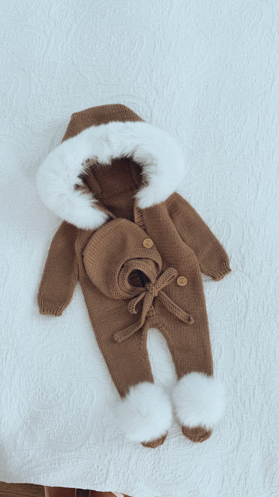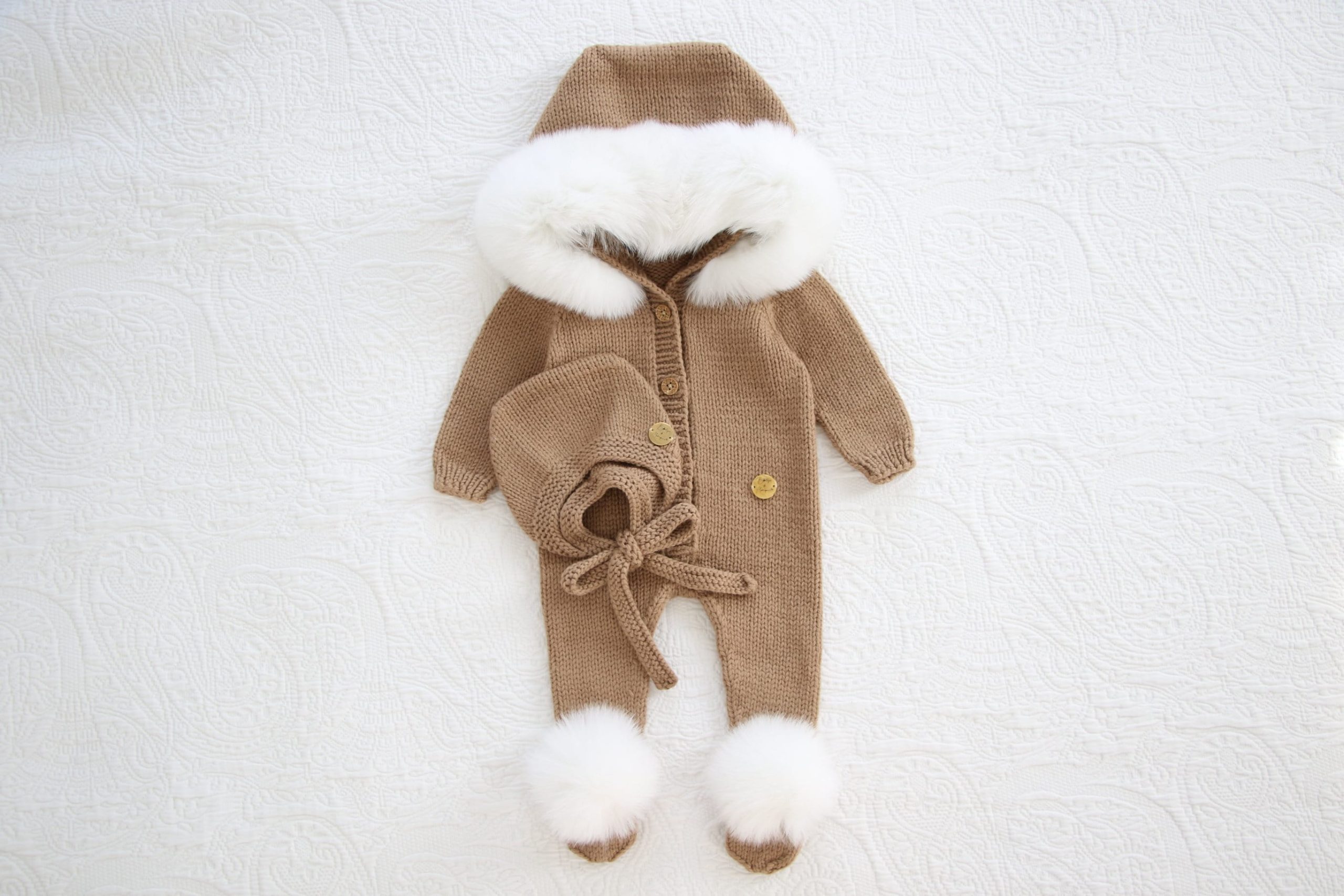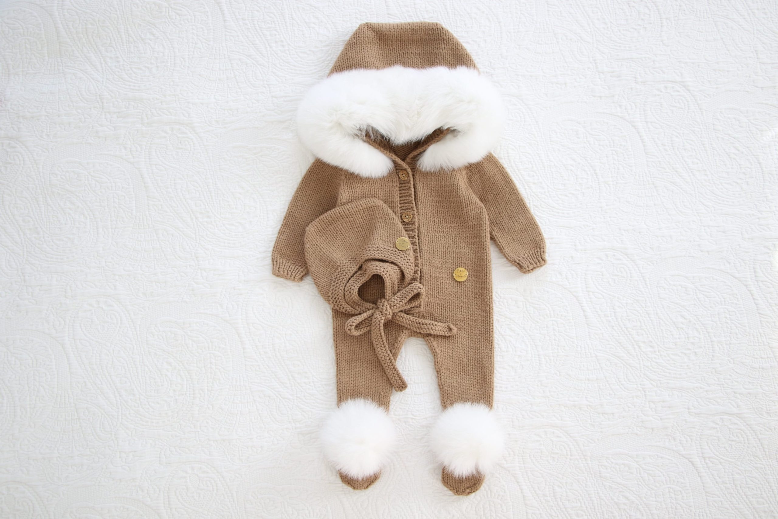 Merino Baby Romper Set – Fur Trim Hood & Bonnet