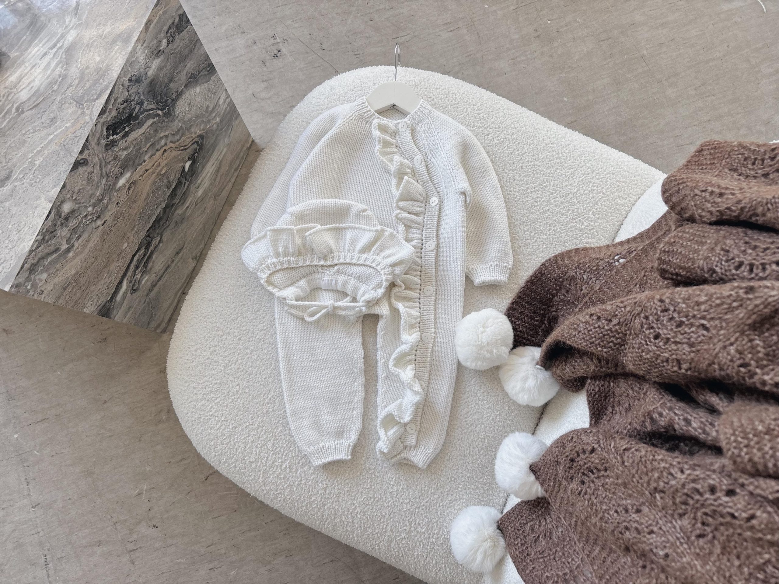 Merino Baby Romper Set – Ruffle Bonnet, Newborn Outfit