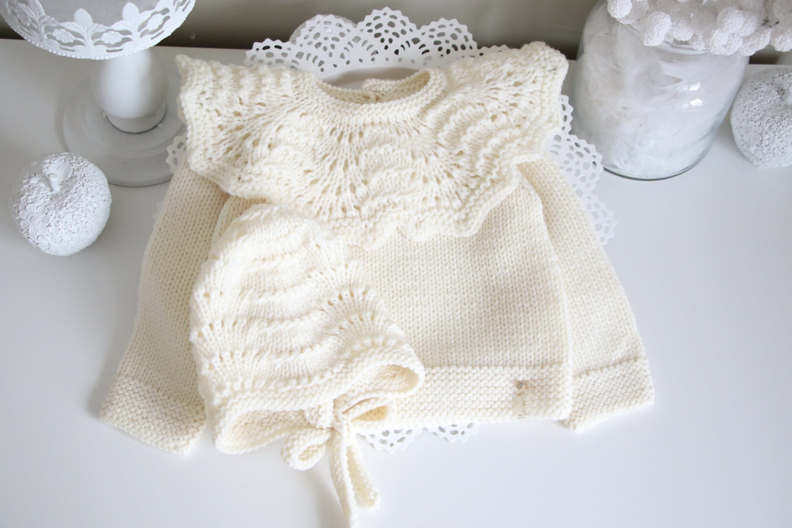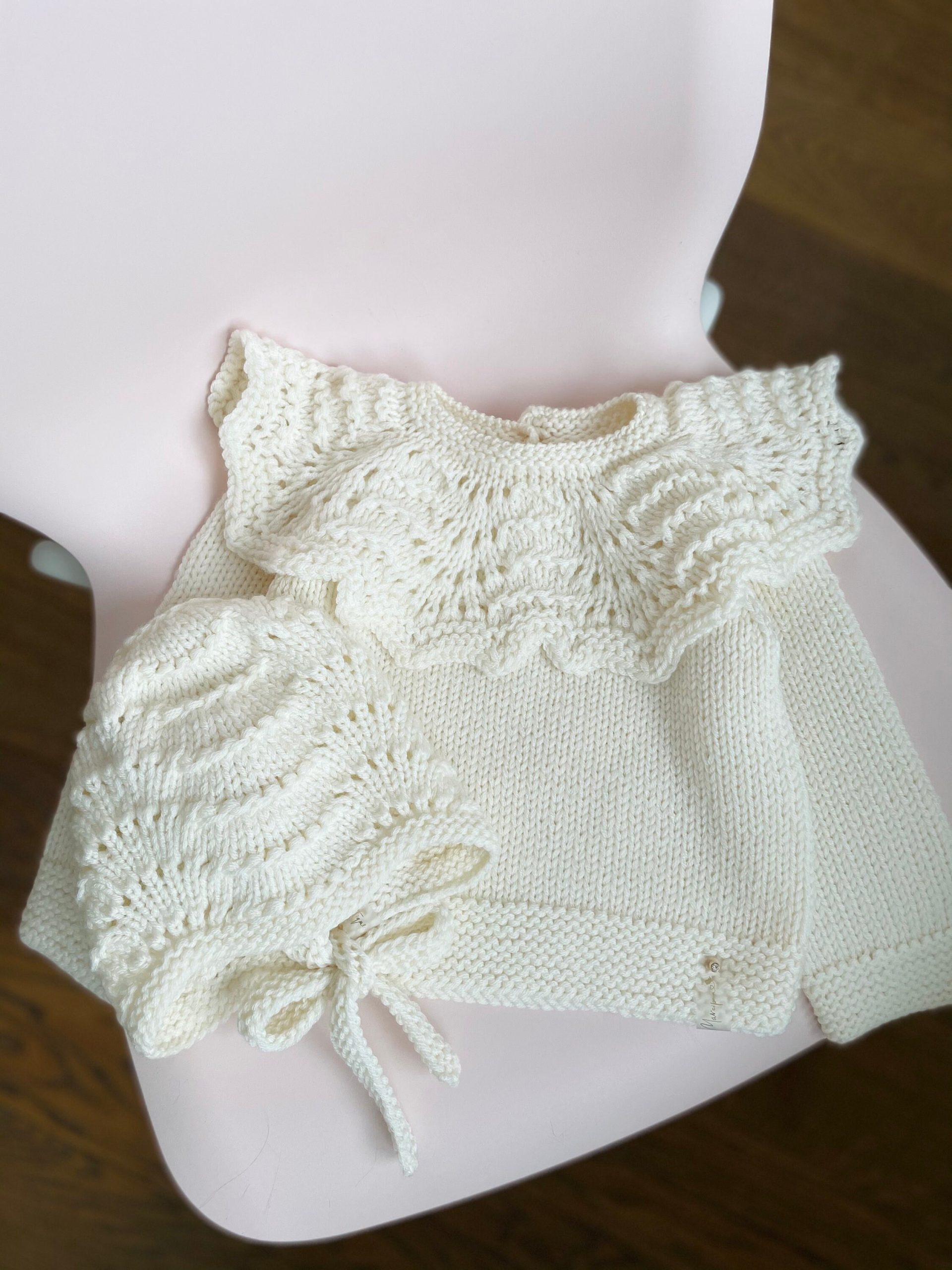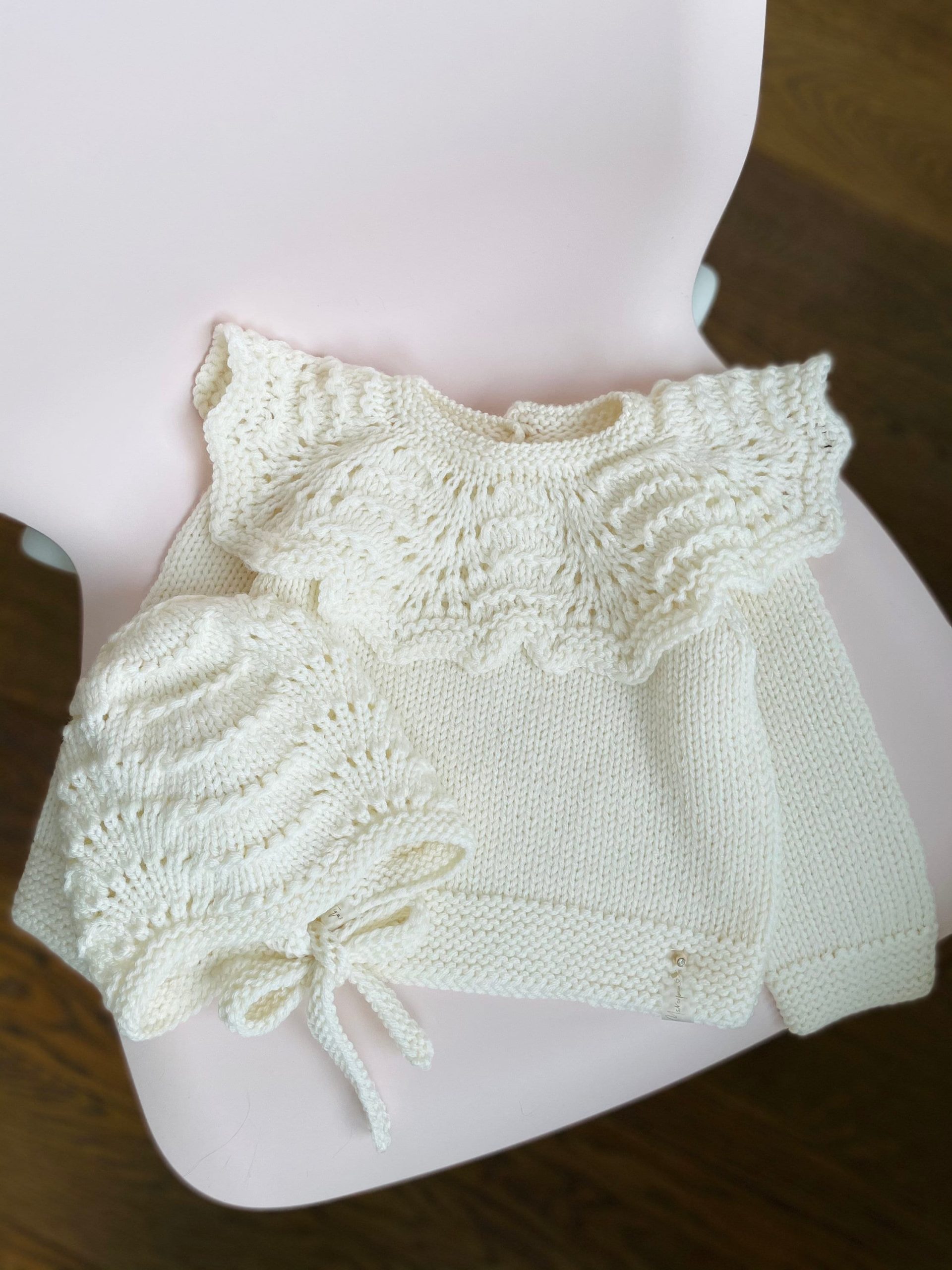 Merino Wool Baby Sweater and Bonnet Set – Cream Ruffle Neck