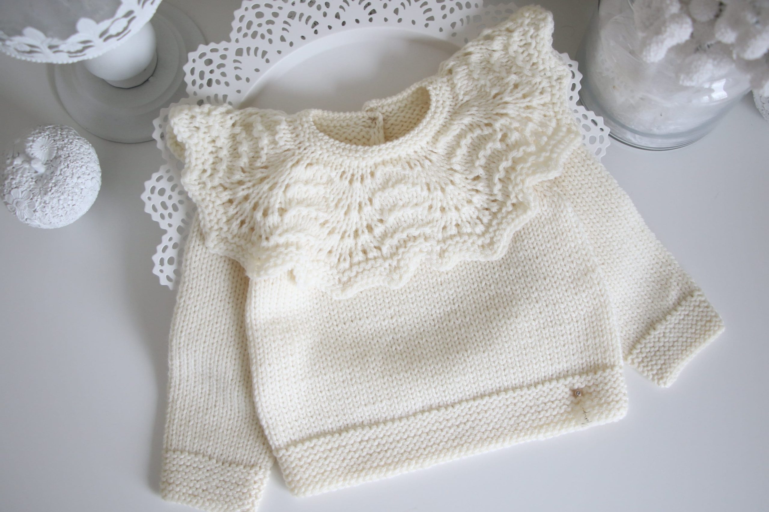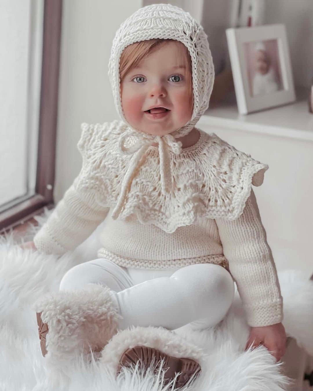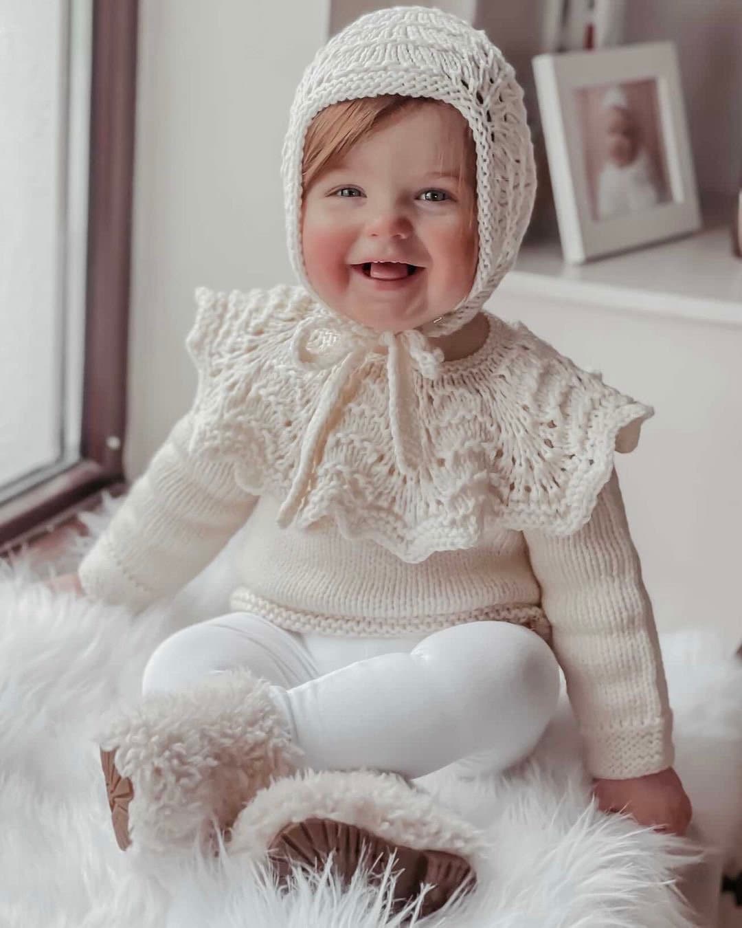 Merino Wool Baby Sweater and Bonnet Set – Cream Ruffle Neck