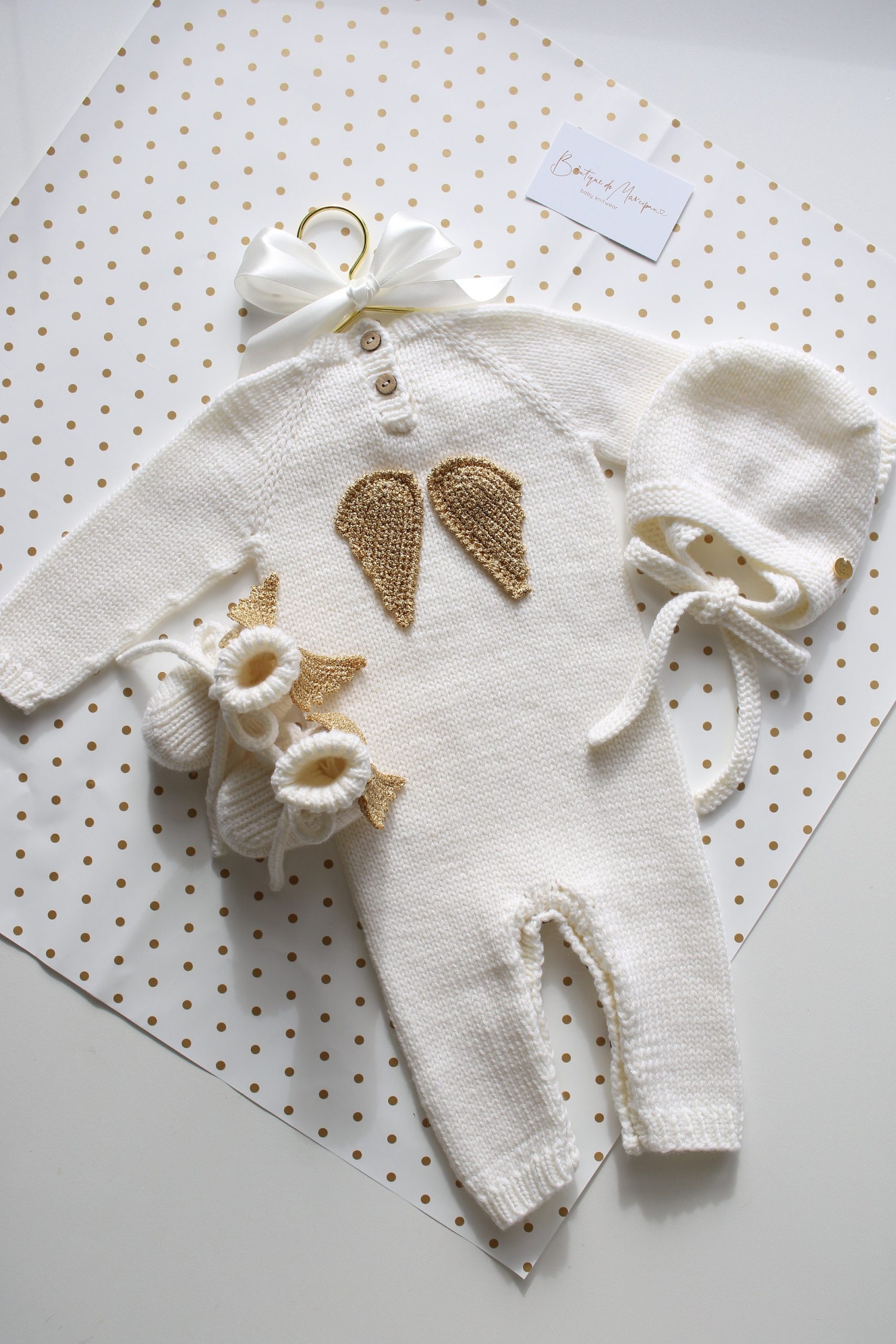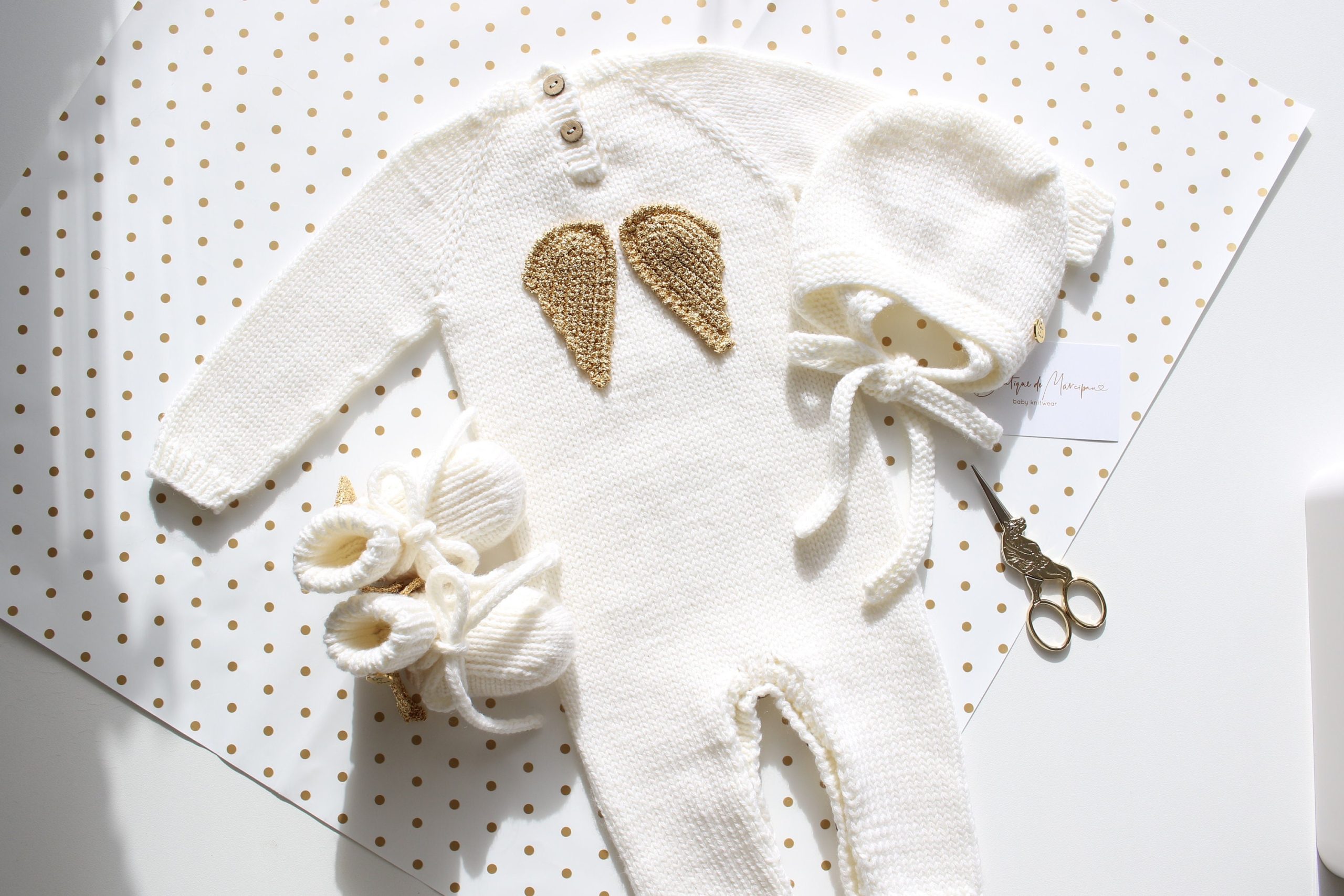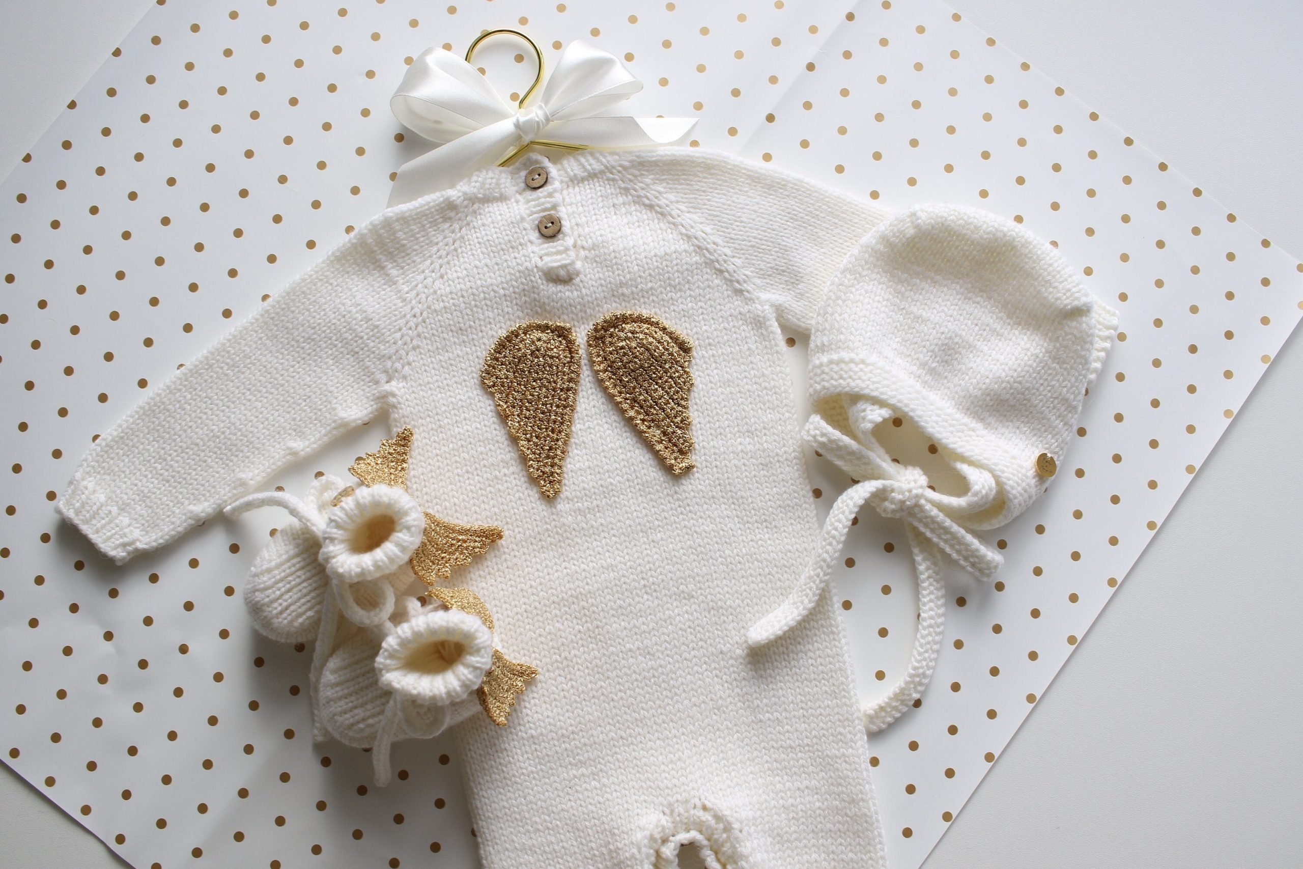 Merino Knit Baby Angel Outfit – Romper, Bonnet & Booties