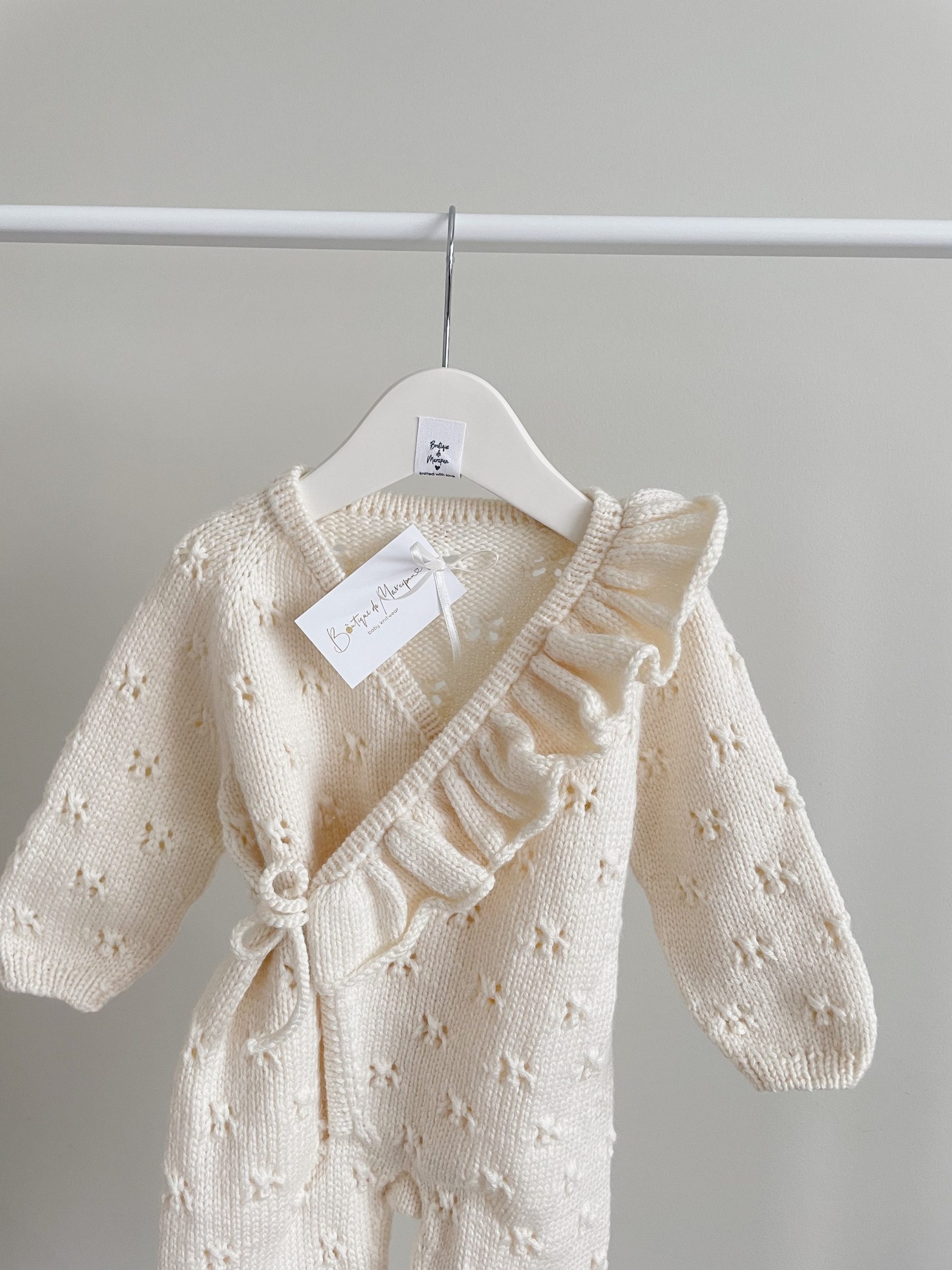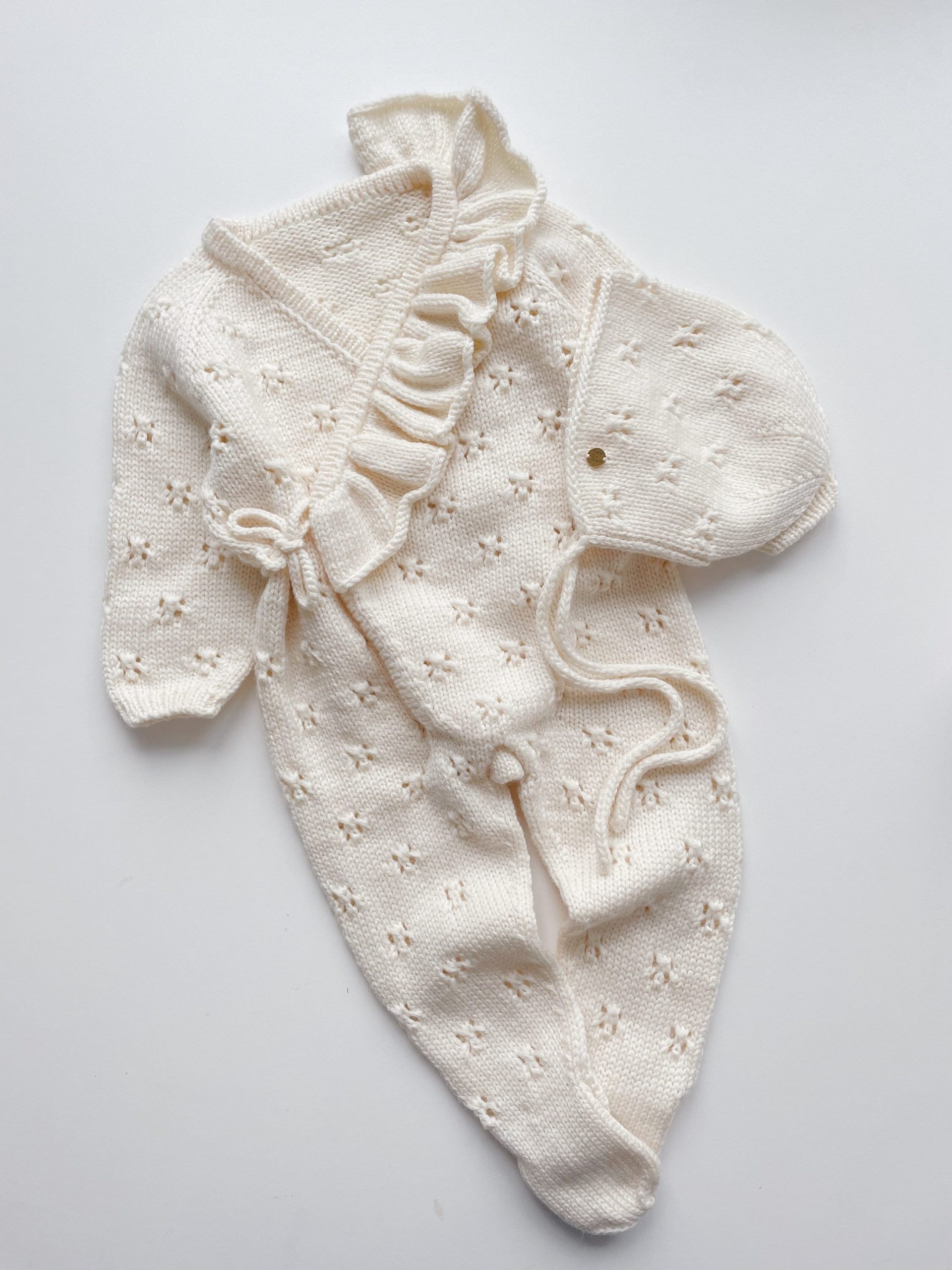 Merino Knit Baby Romper and Bonnet Set – Cream Ruffle Outfit