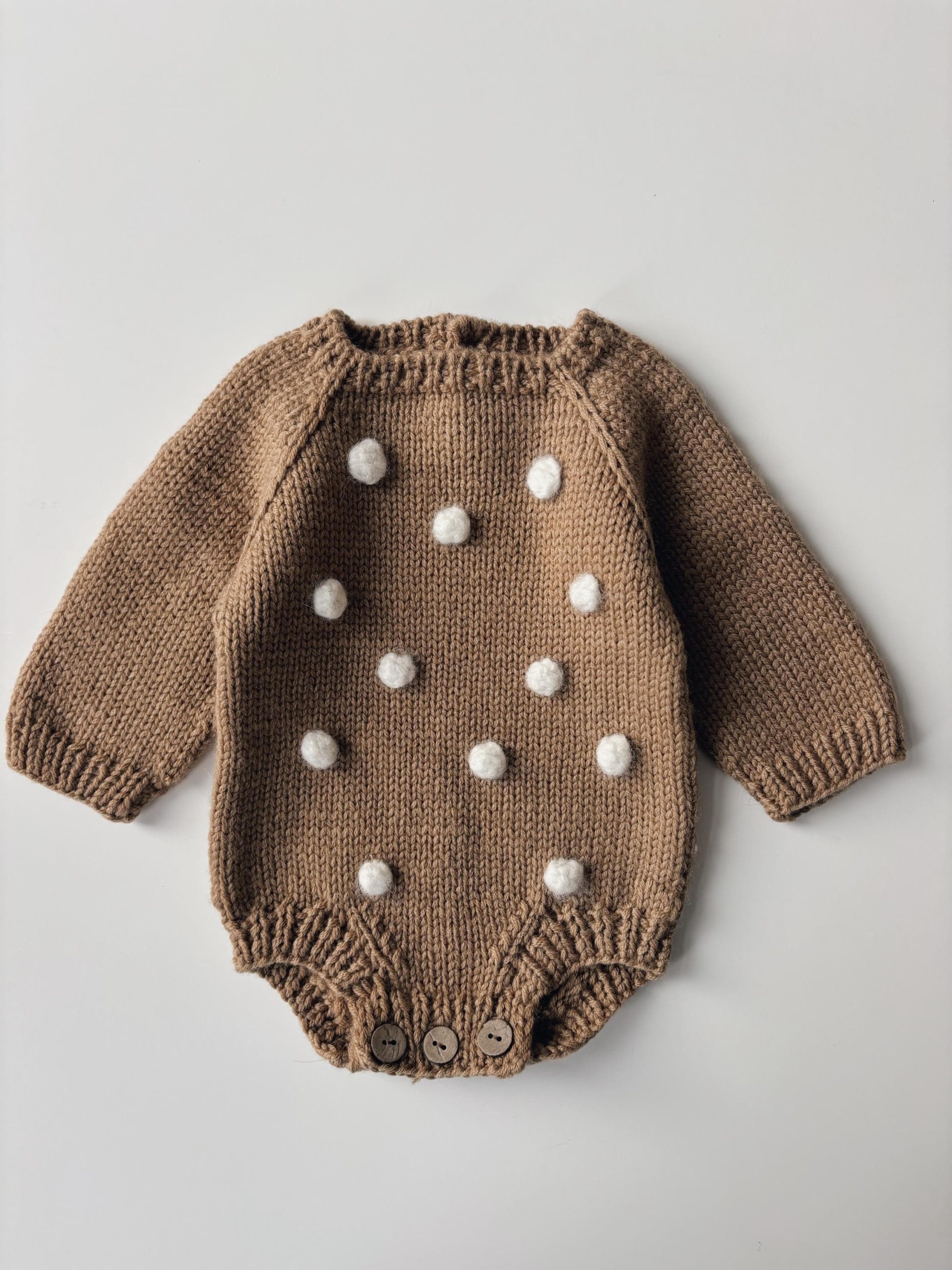 Cotton Baby Romper Set – Camel Knit Bonnet & Booties, Mink Pom Poms