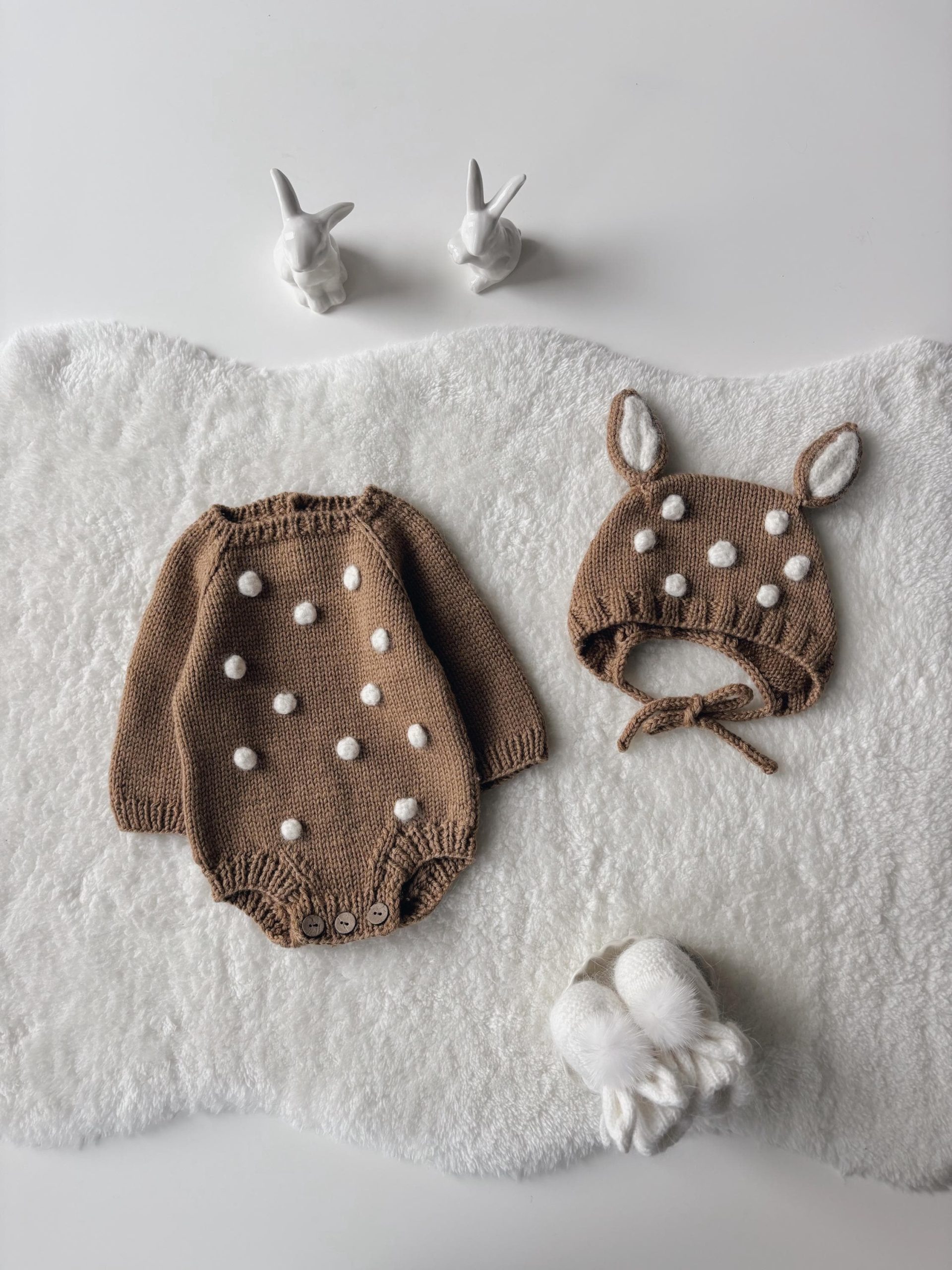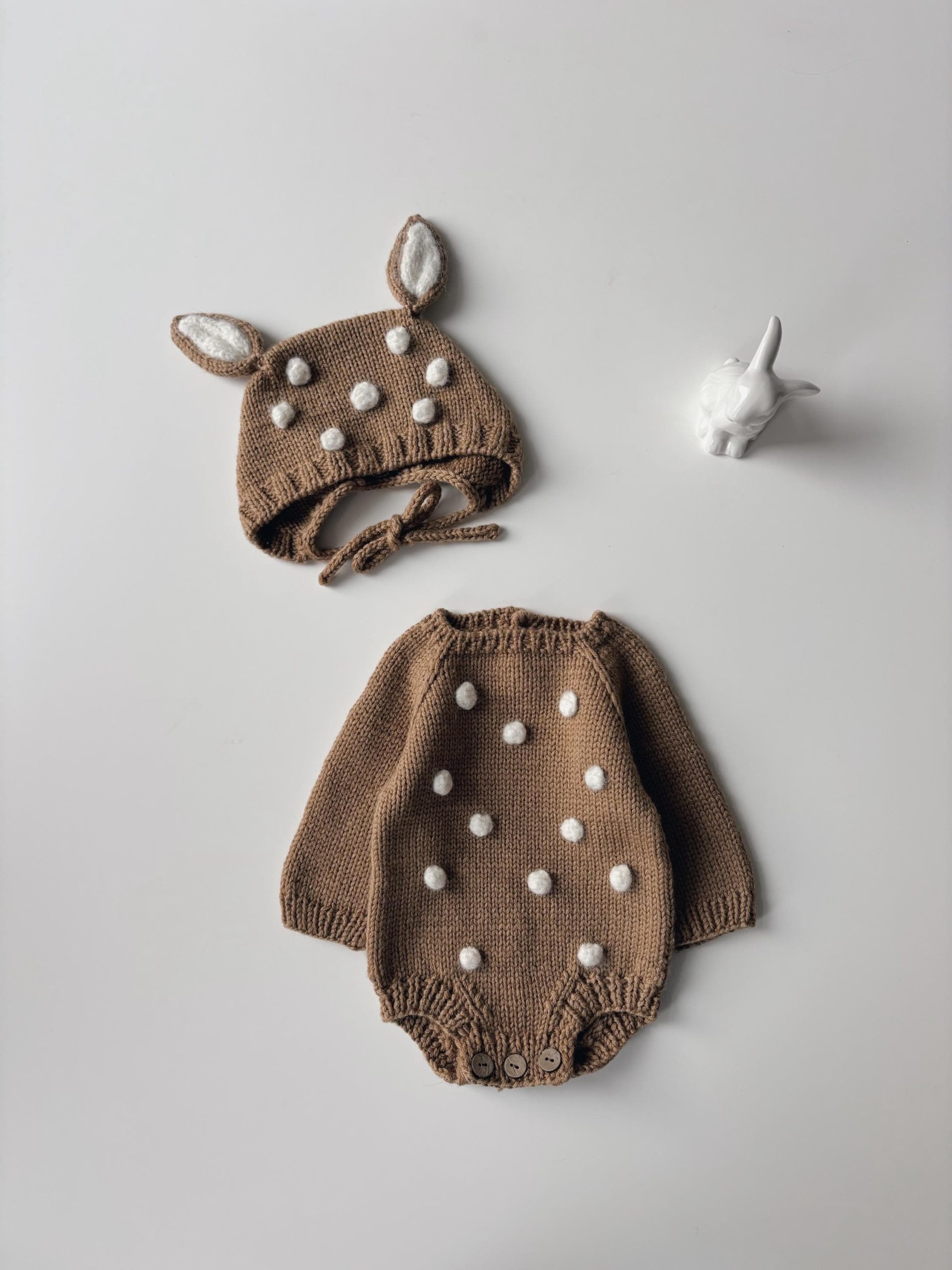 Merino Wool Deer Romper and Bonnet Set – Newborn Outfit, 0-3 Months