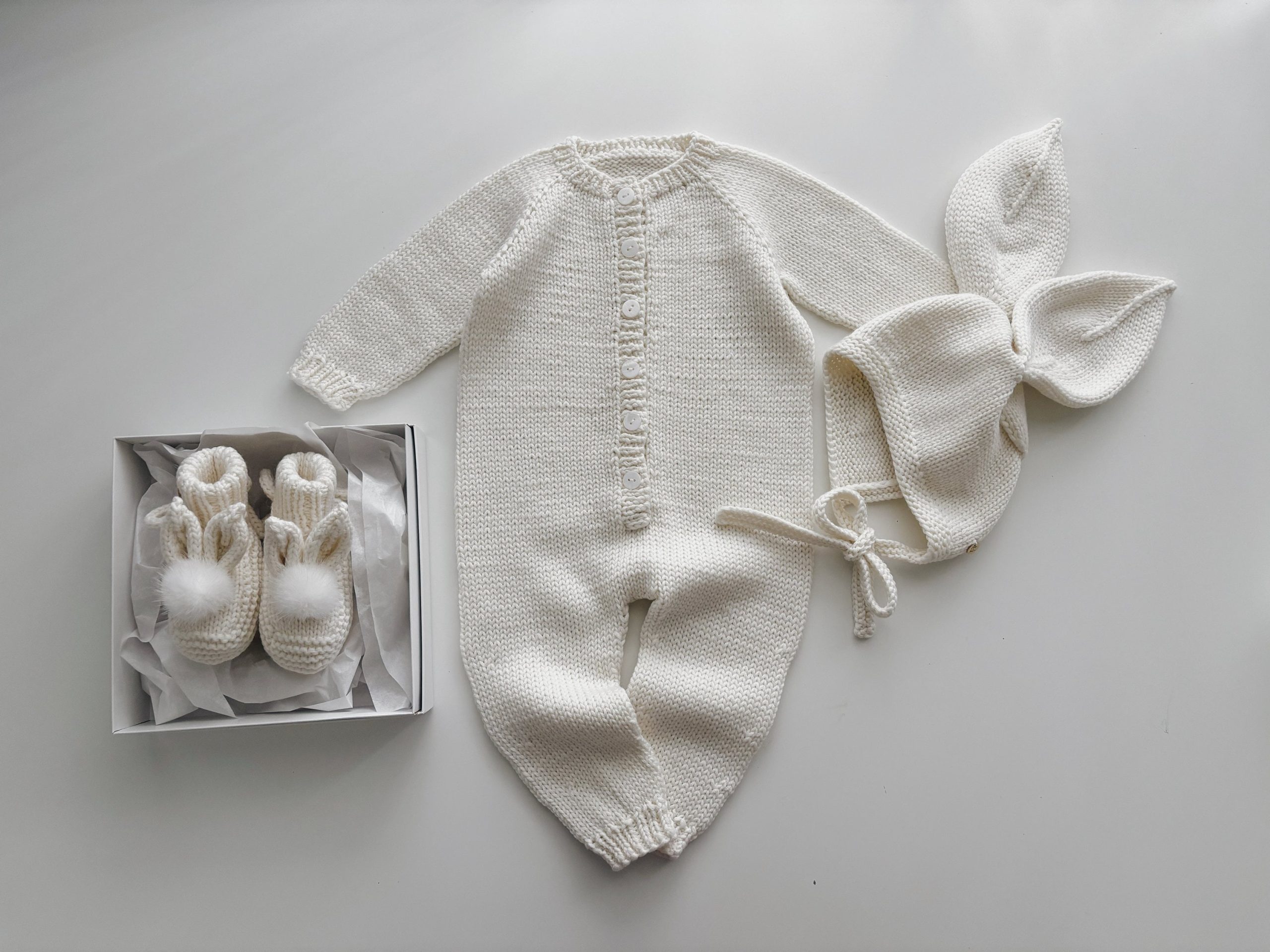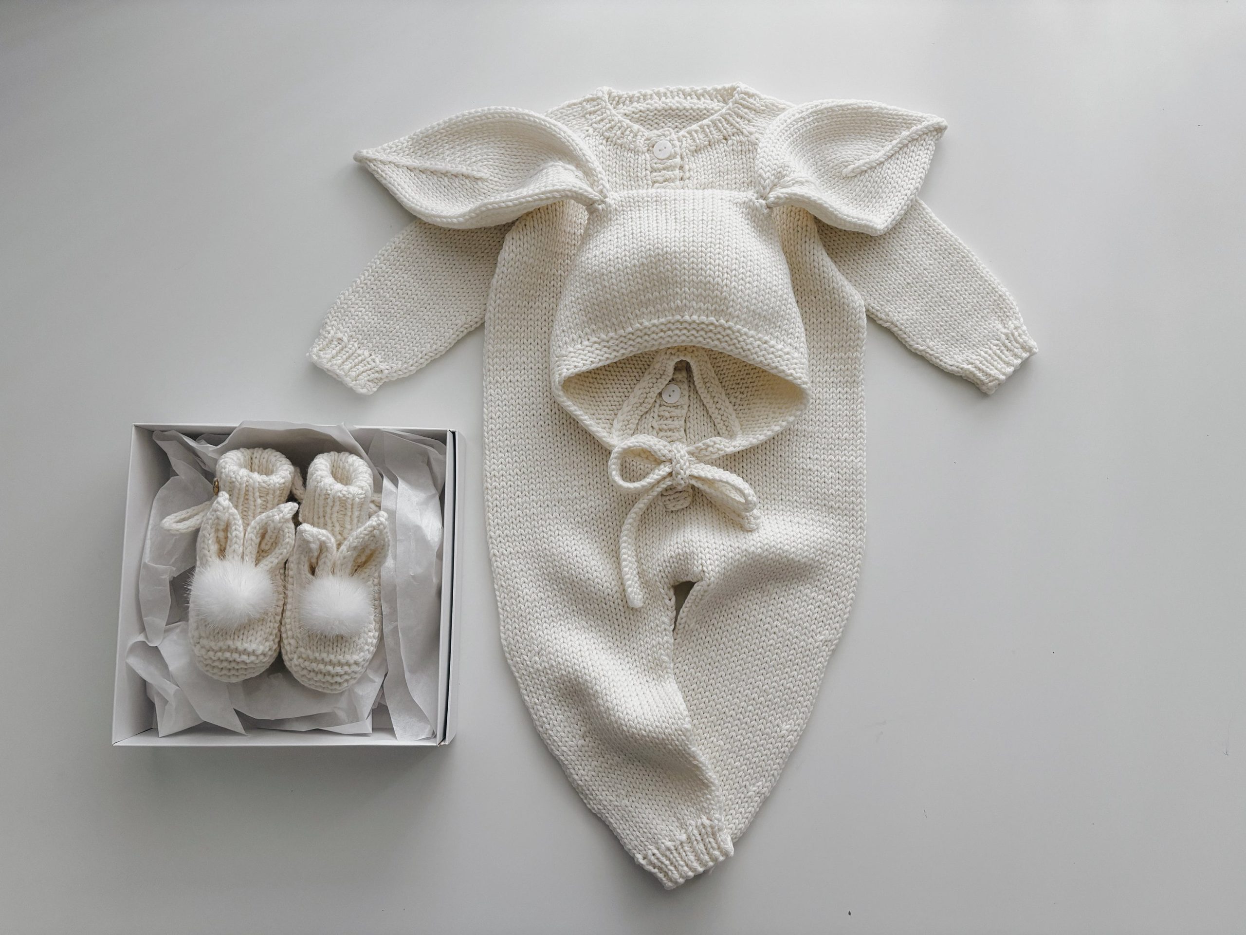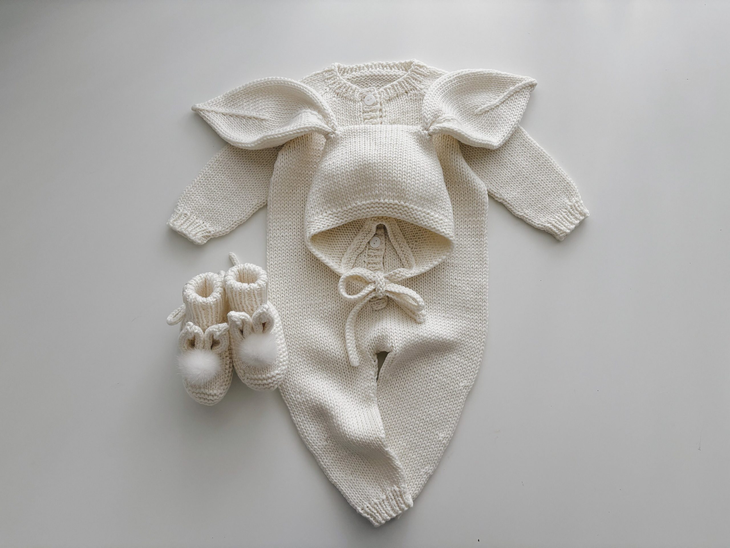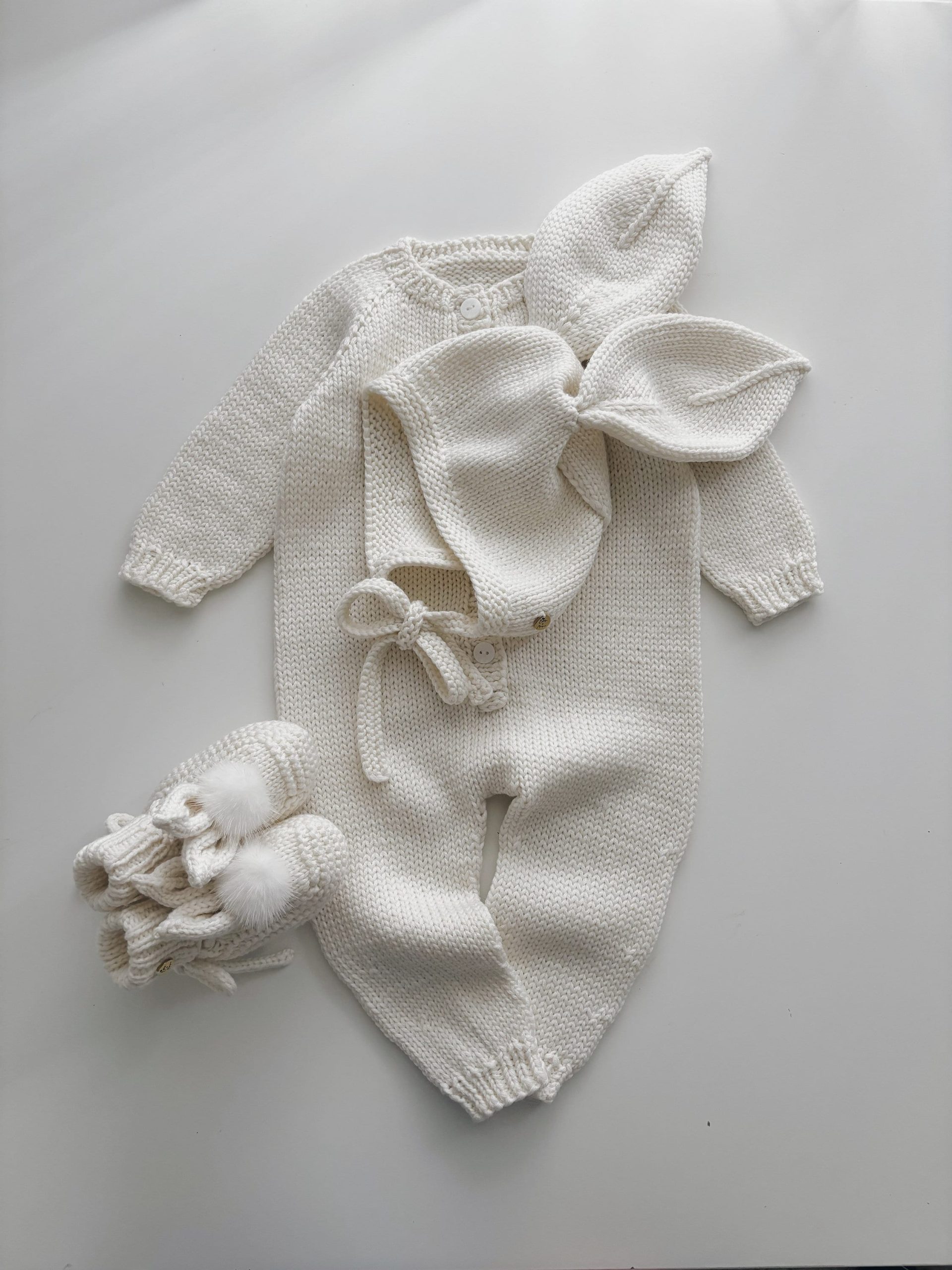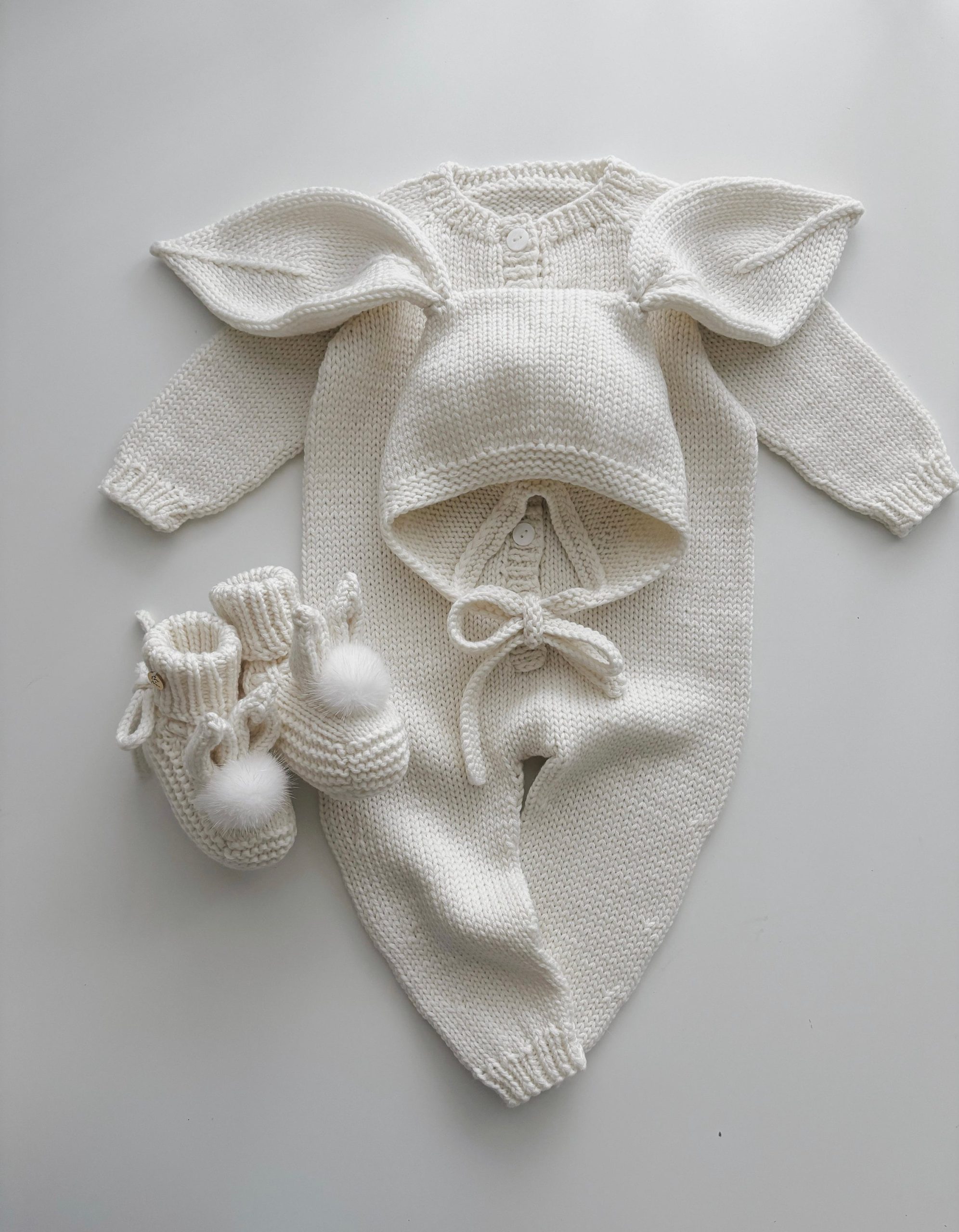 Merino Wool Knit Baby Bunny Outfit – Cream Romper, Bonnet & Booties