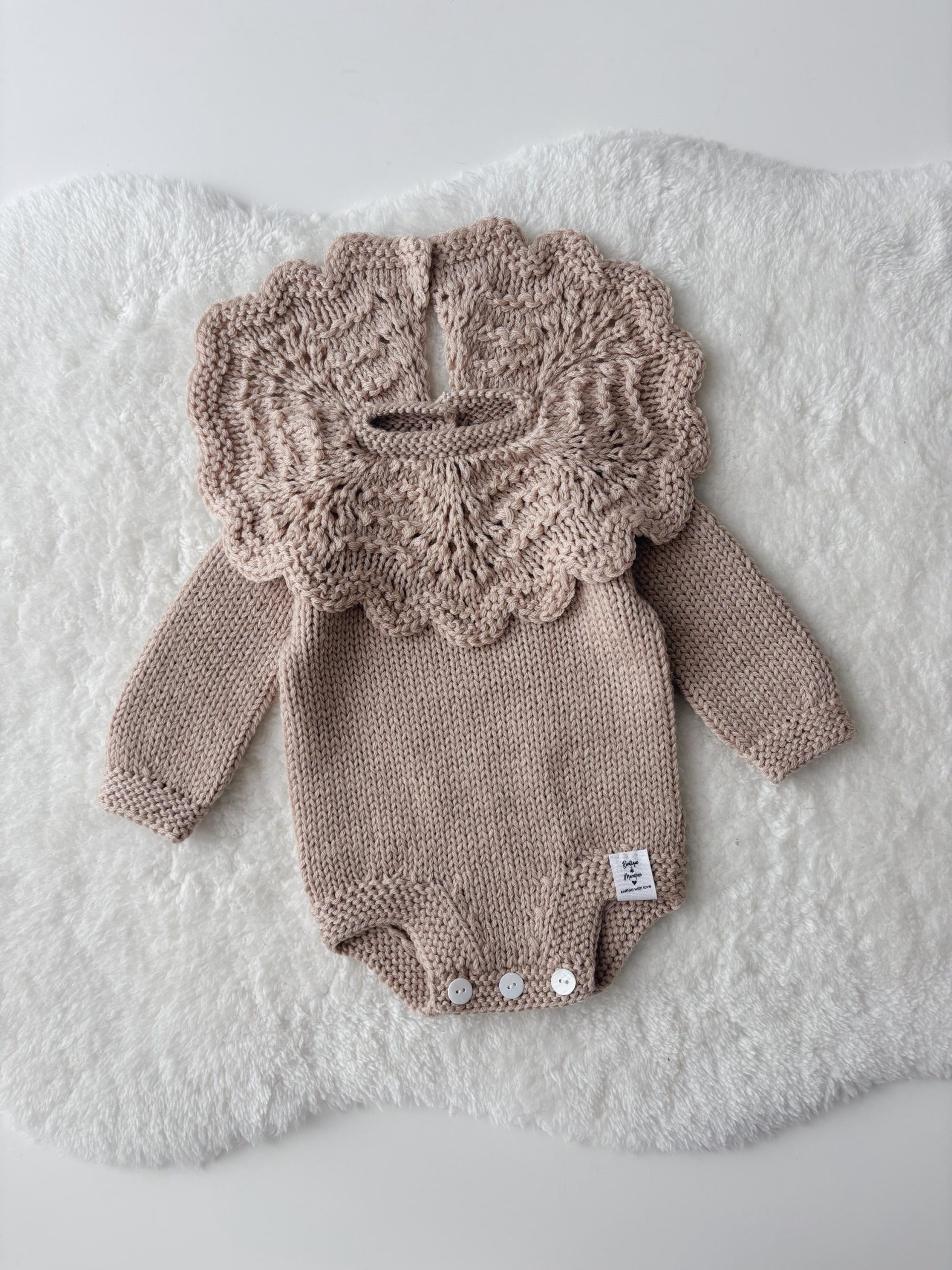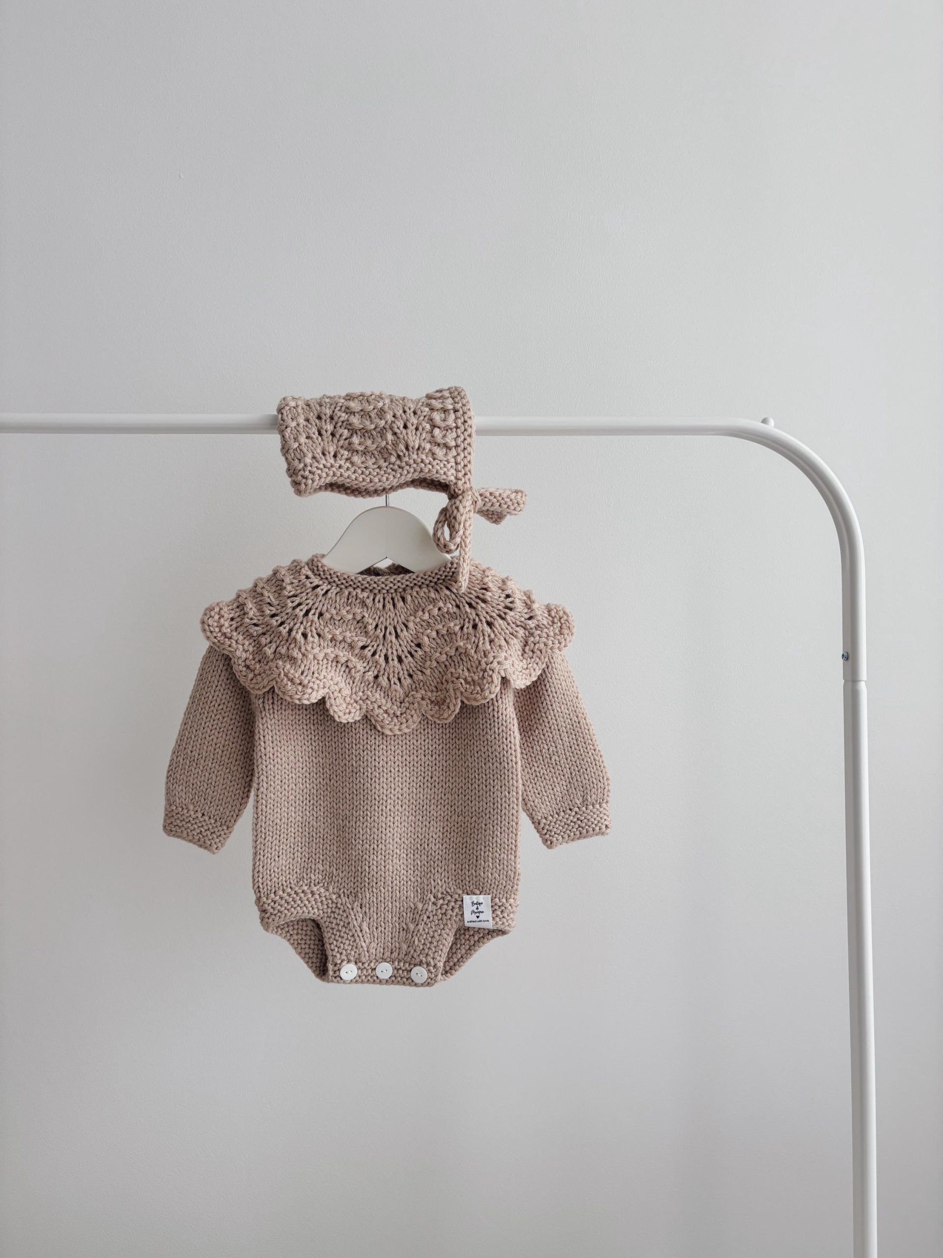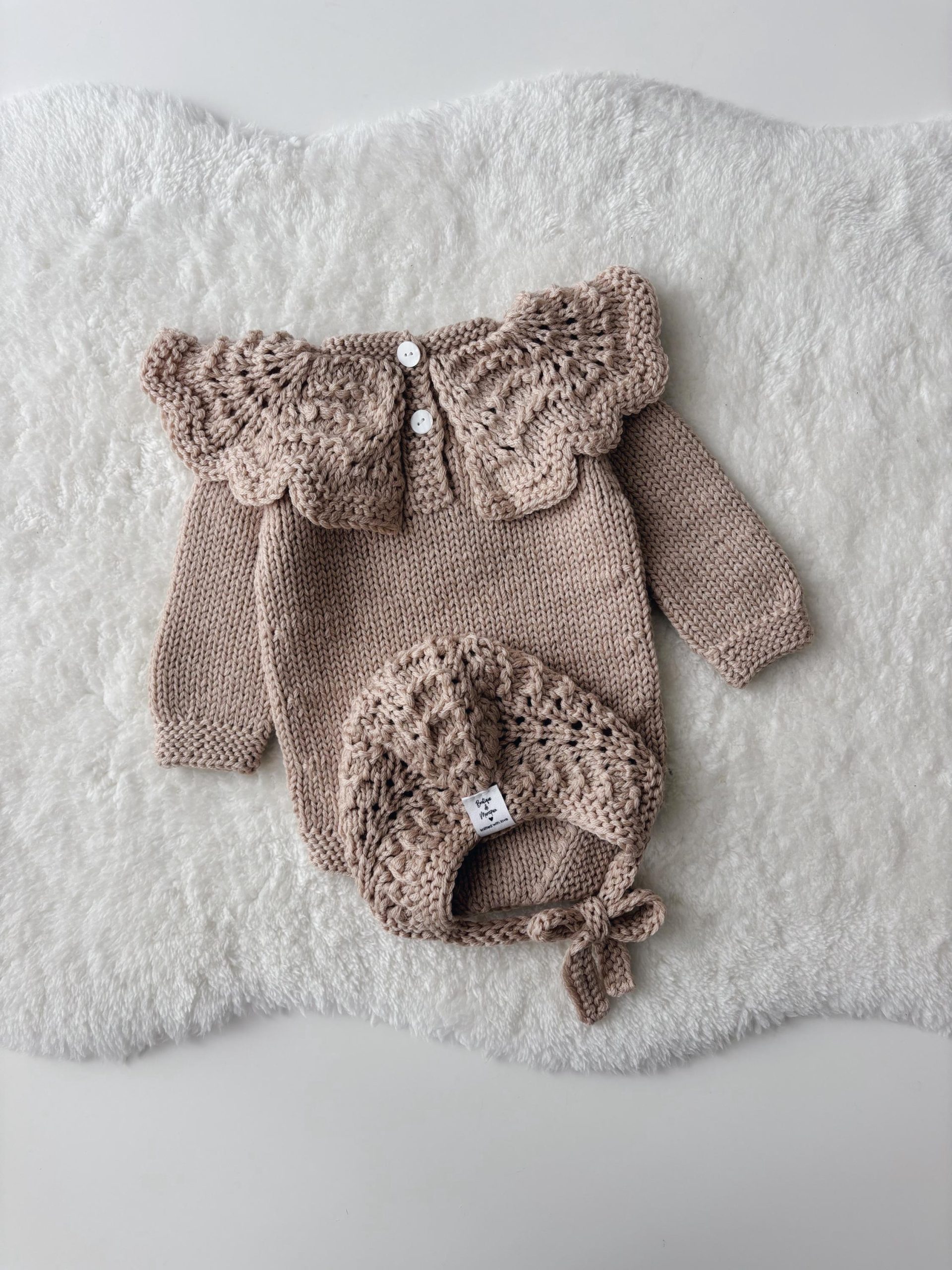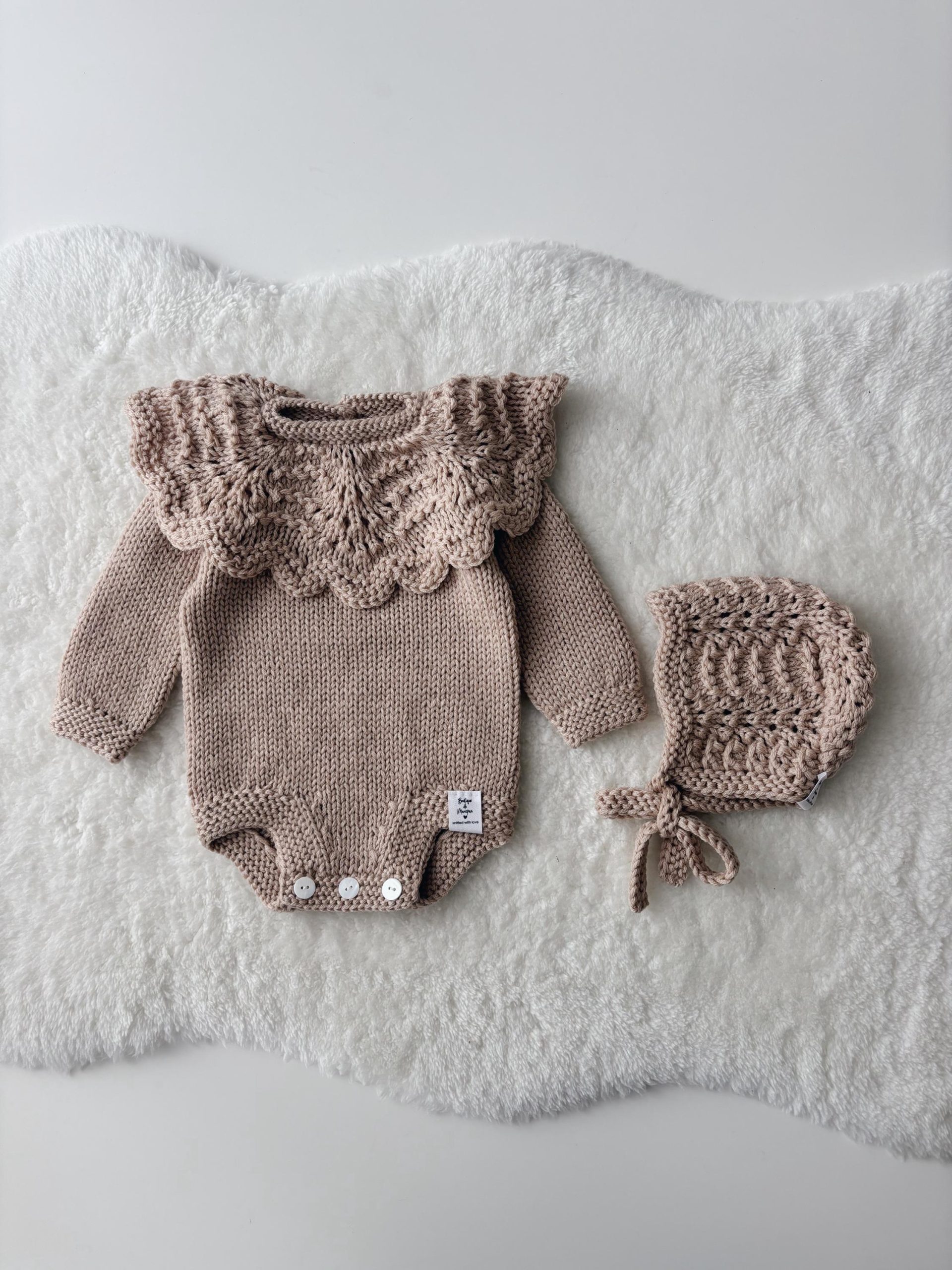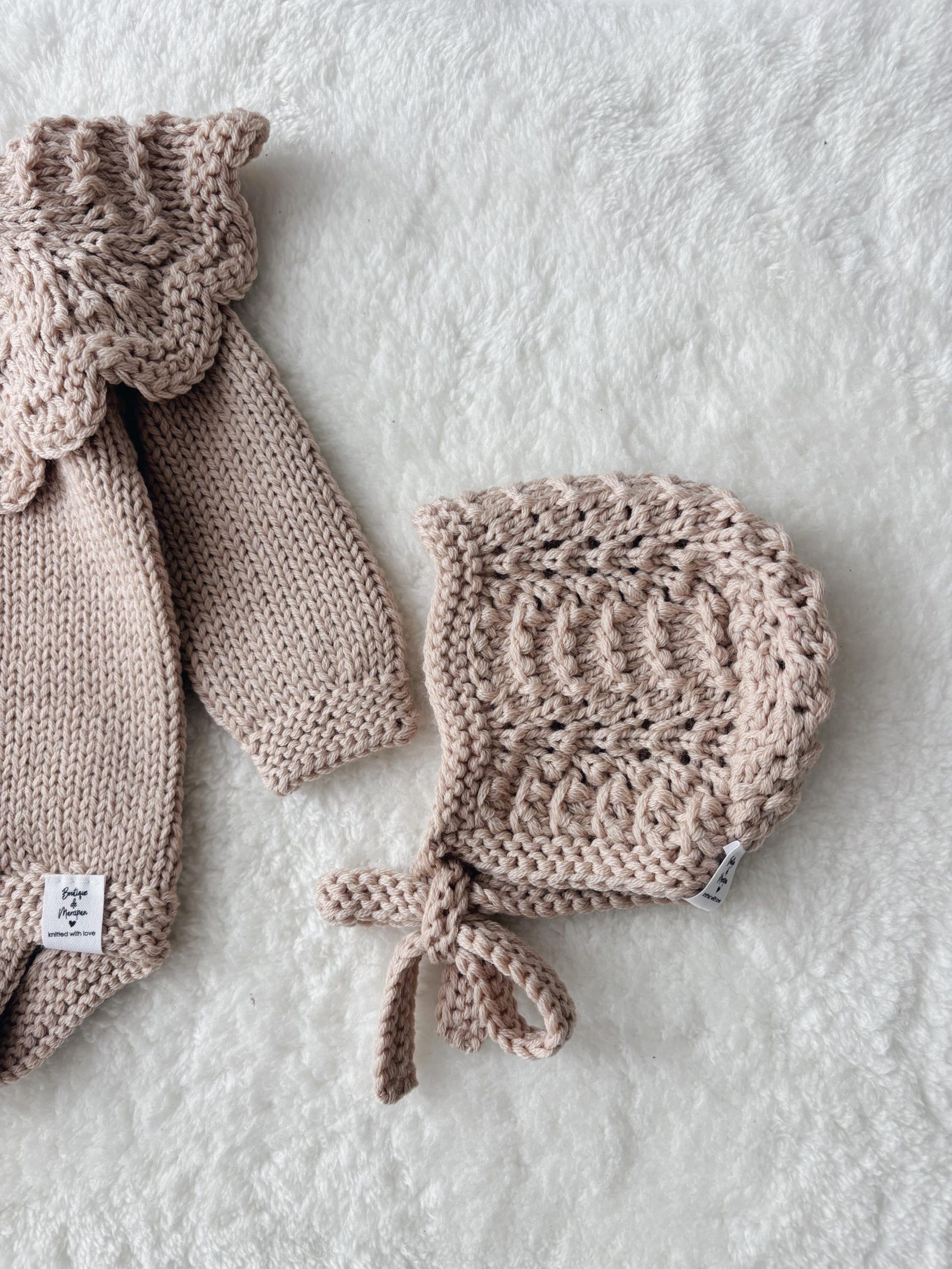 Alpaca Blend Baby Romper and Bonnet Set – Beige Knit Outfit