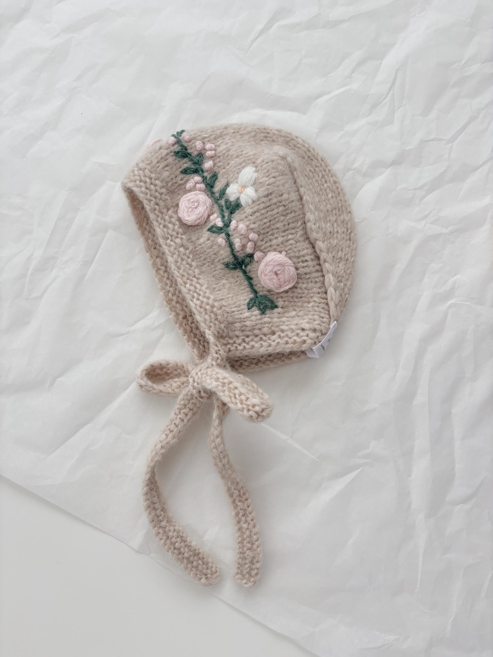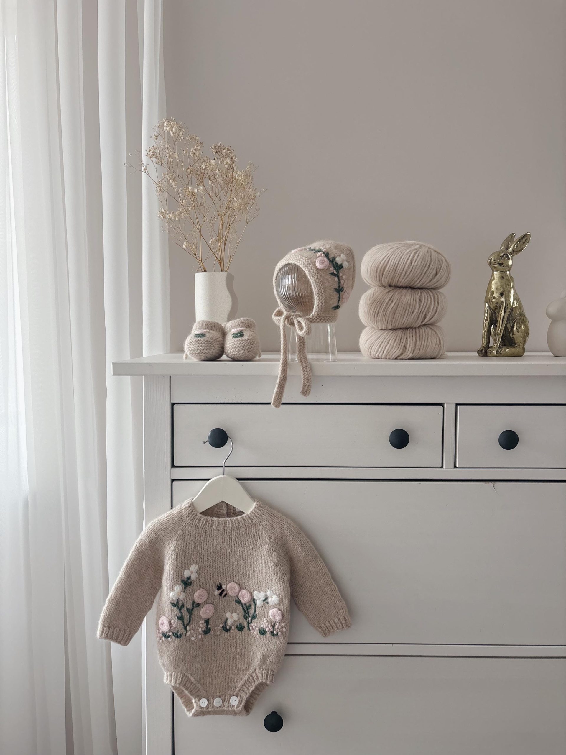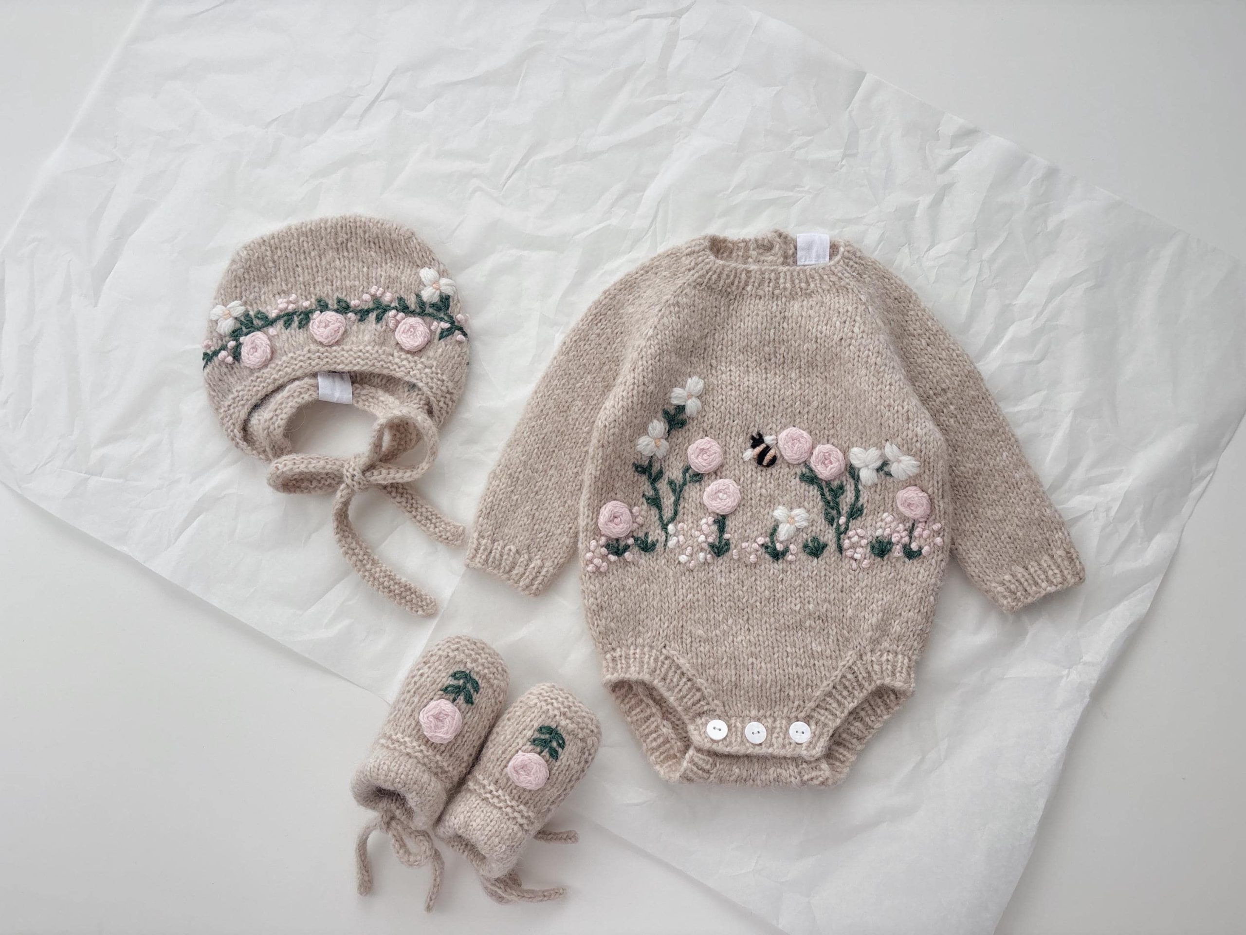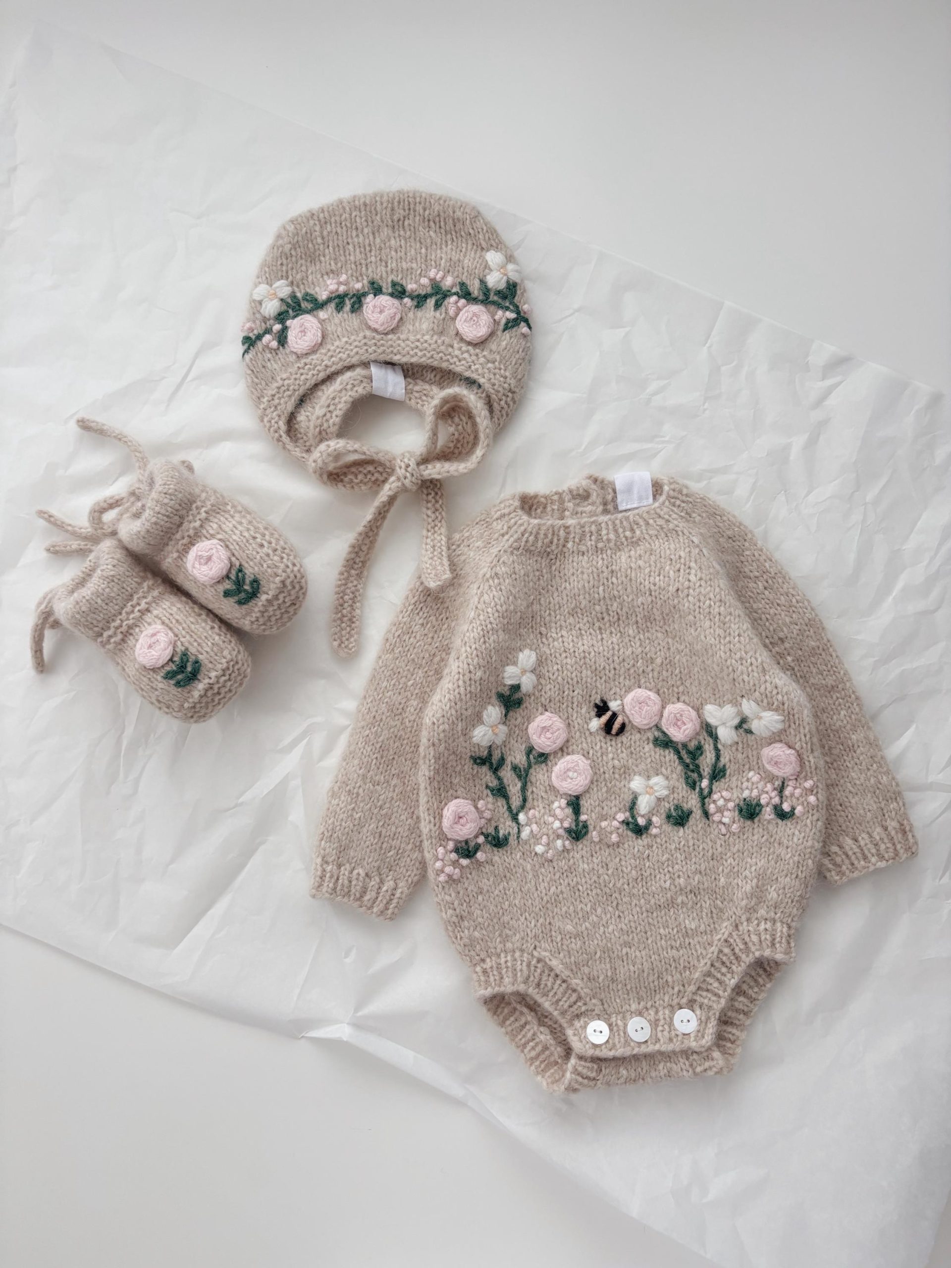 Newborn Girl Alpaca Romper Set – Beige Floral Bonnet & Booties