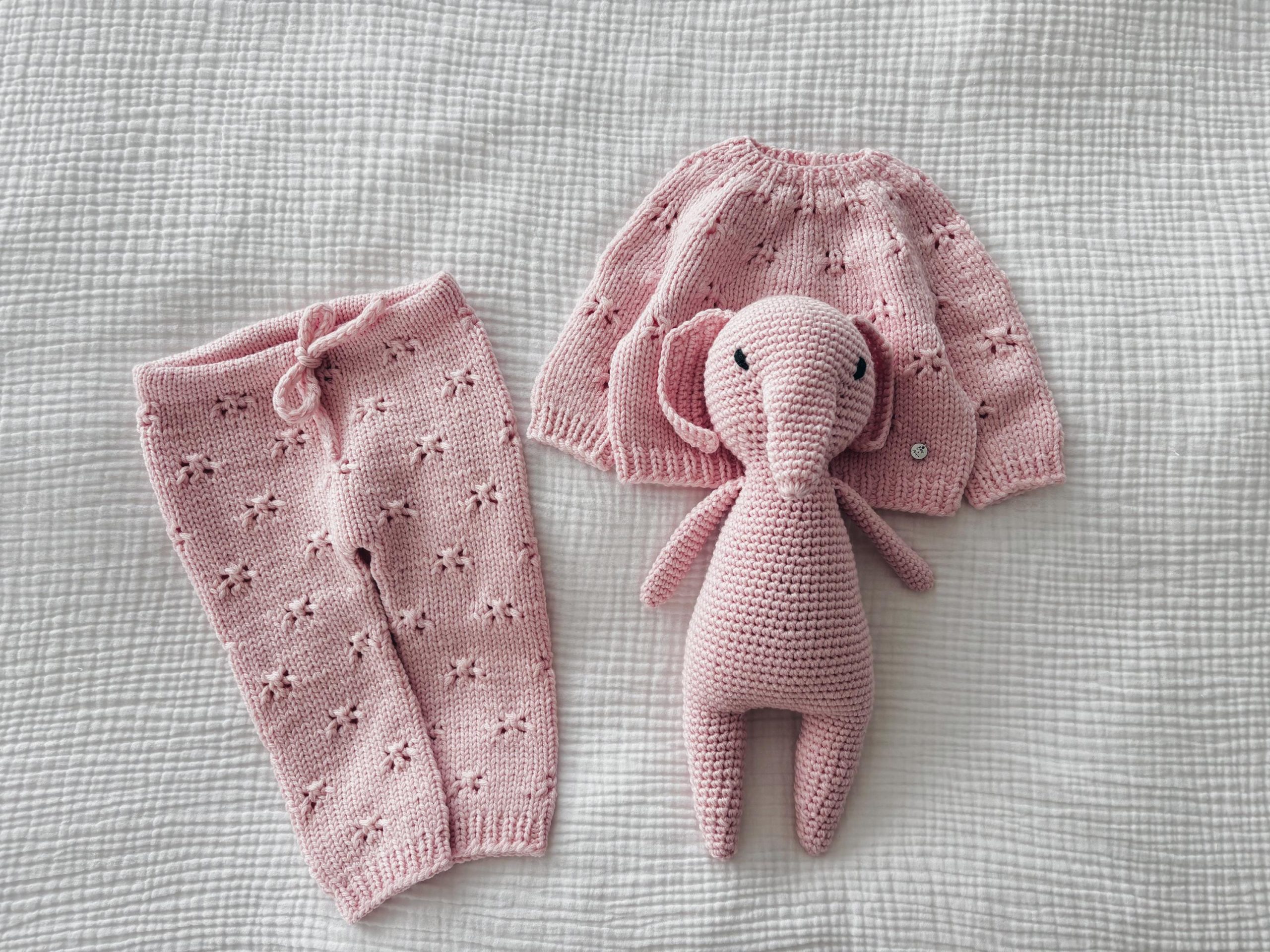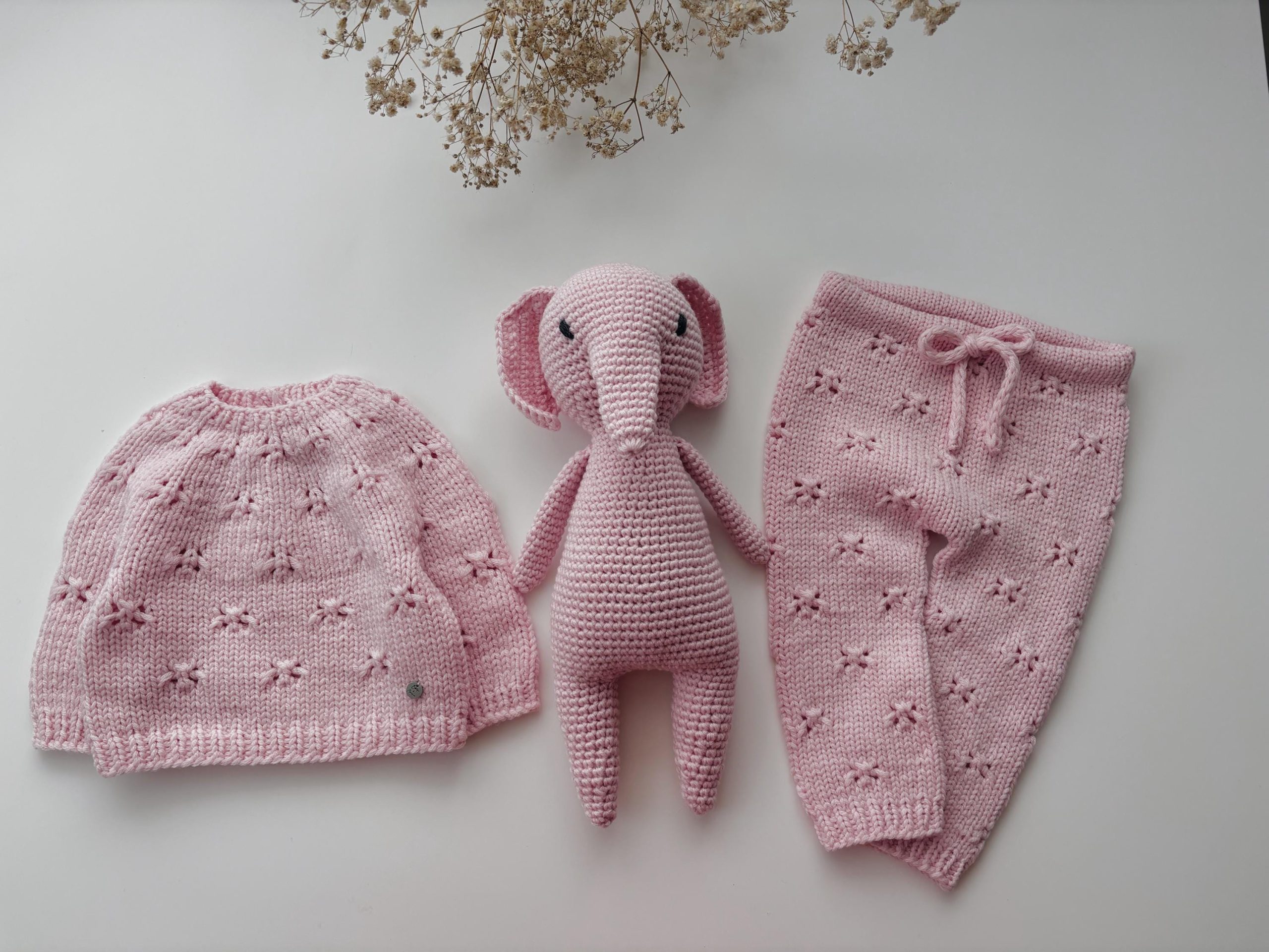 Pale Pink Merino Wool Baby Set – Hand Knit Sweater, Pants & Elephant Toy